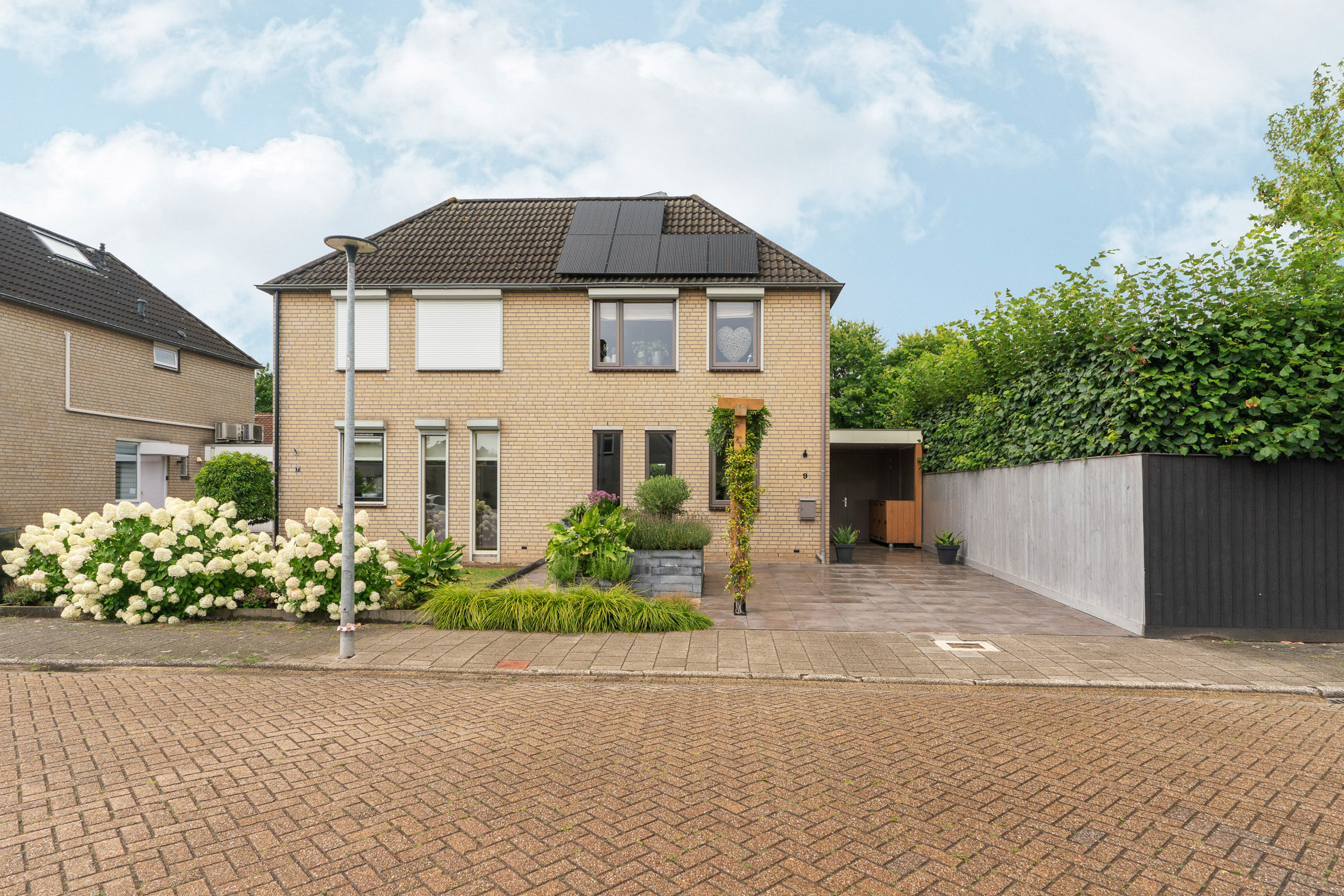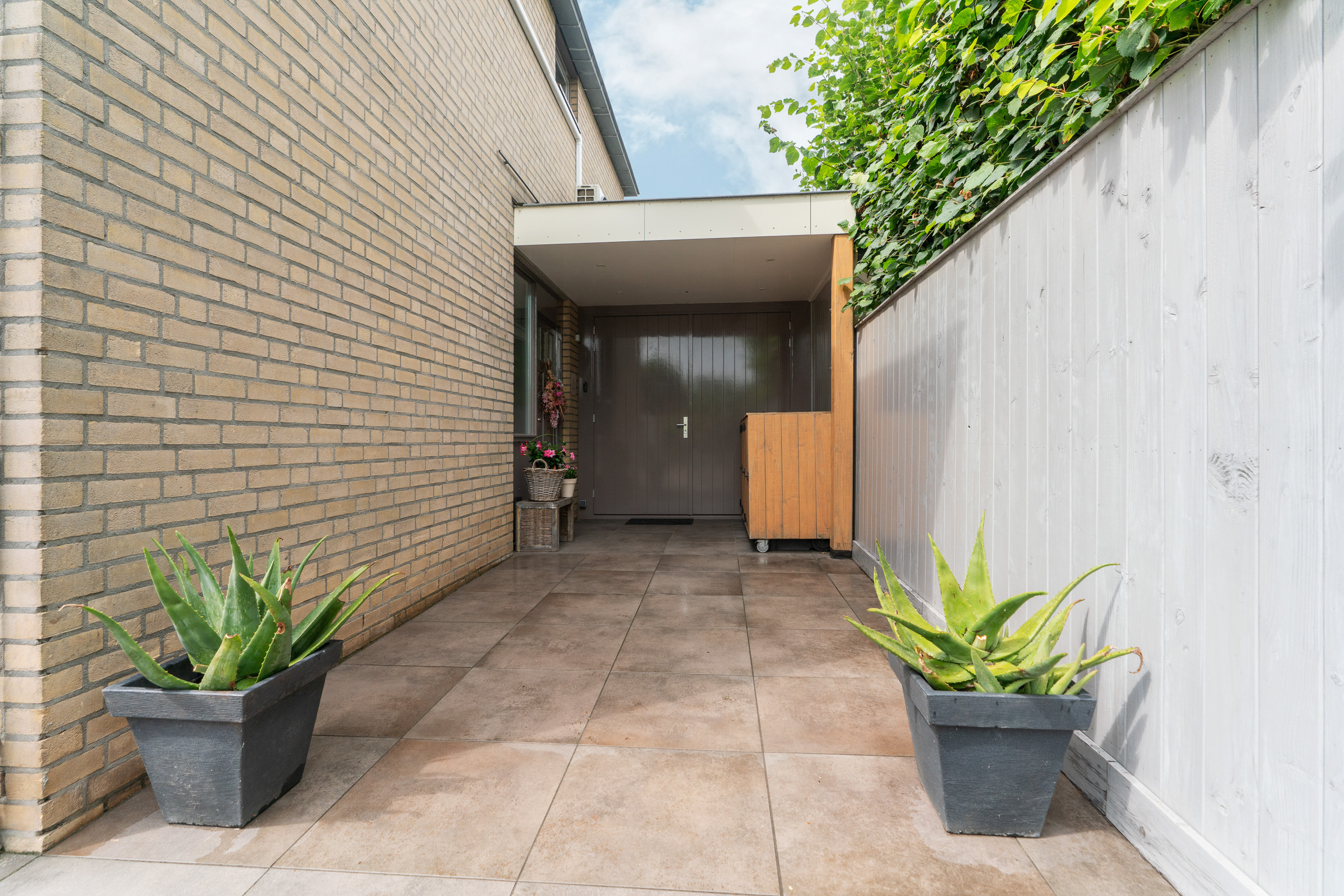 De oprit biedt plaats aan 2 auto’s naast elkaar. Hierdoor hoef je elkaar niet in de weg te staan wat doorgaans erg comfortabel voelt. Hetzelfde geldt bij de voordeur en de garage waar een halve carport (6m2) ervoor zorgt dat je er altijd droog staat. Om het af te maken zijn ook hier in het plafond inbouwspots aangebracht.