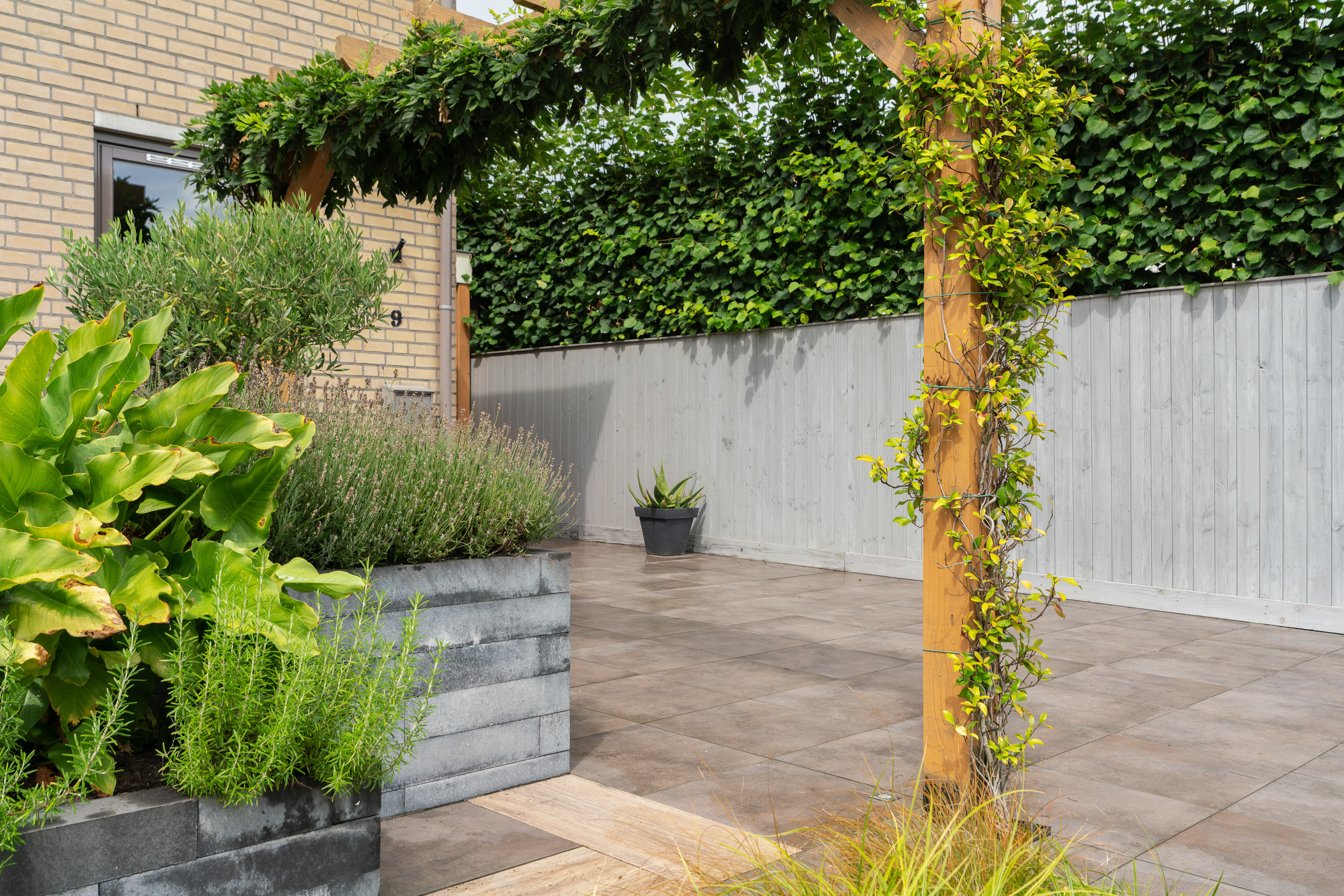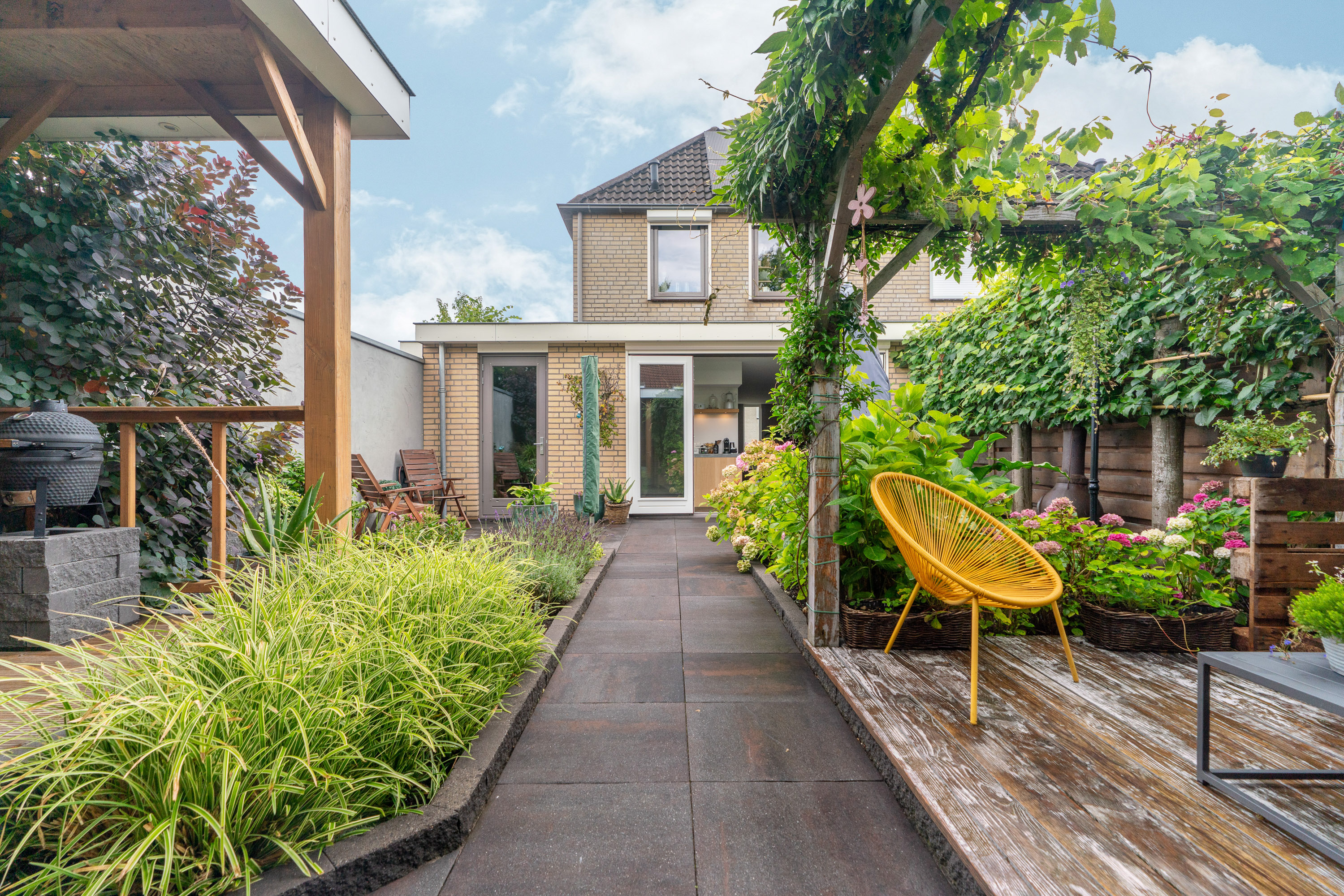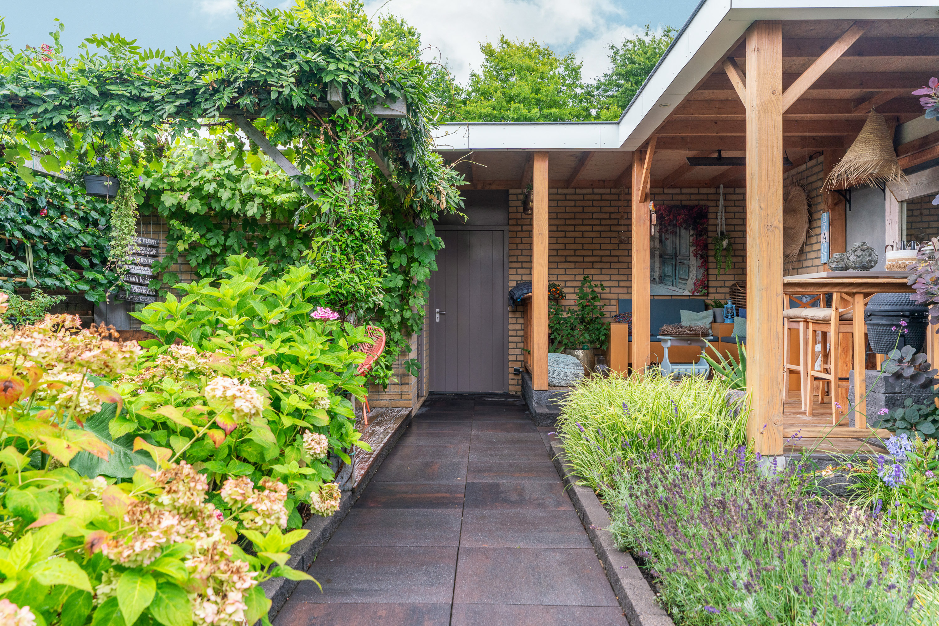 De voortuin doet qua aankleding niet onder aan die van de achtertuin. Ook de voortuin is weelderig aangekleed met verschillende planten, borders met lavendel en een pergola. Wat we niet zo vaak zien is dat ook de oprit is betegeld met het groot formaat, keramische terrastegels. Dit ziet er erg verzorgd en super strak uit. En doordat het is ingevoegd, groeit er ook geen onkruid tussendoor. Tevens zijn er ledspots in de bestrating aangebracht.