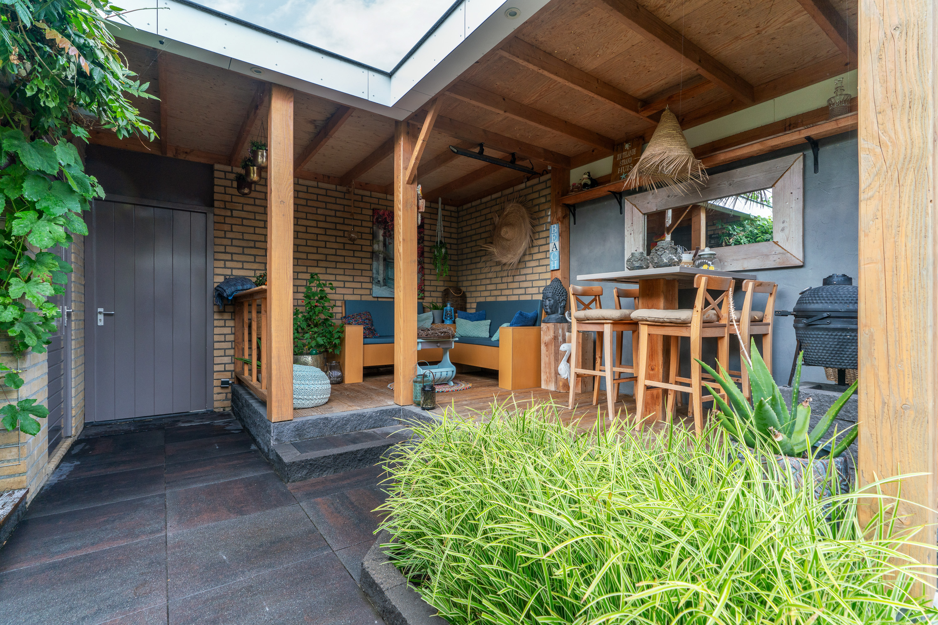 Achterin de tuin is een stijlvolle veranda gebouwd. Deze is ca. 16m2 groot en biedt een heerlijke beschutte plek om buiten te zitten, ook wanneer de zon uitbundig schijnt. Een tuinset kun je hier het gehele jaar buiten laten staan. Leuk detail zijn de inbouwspots die onder het overstek van het dak zijn aangebracht. Dit zien we overigens ook terug in het overstek van de aanbouw van de woning. Deze sfeervolle verlichting maakt het plaatje in het donker helemaal af.