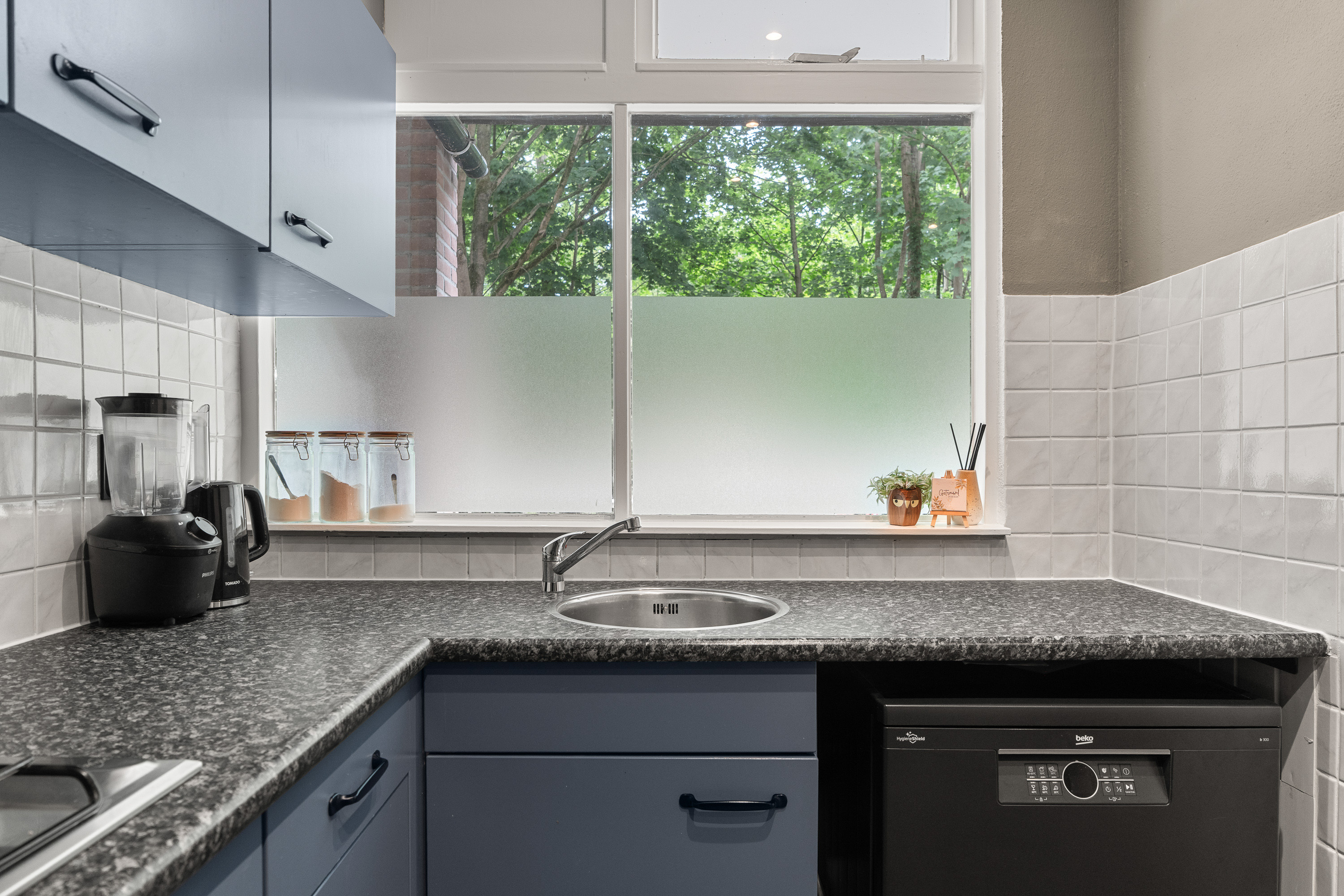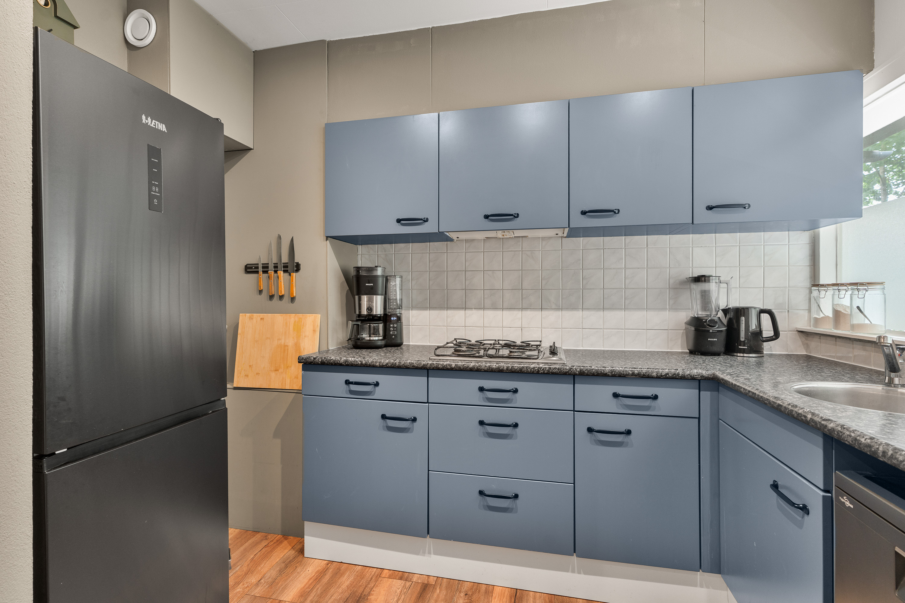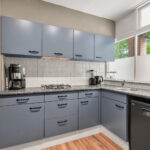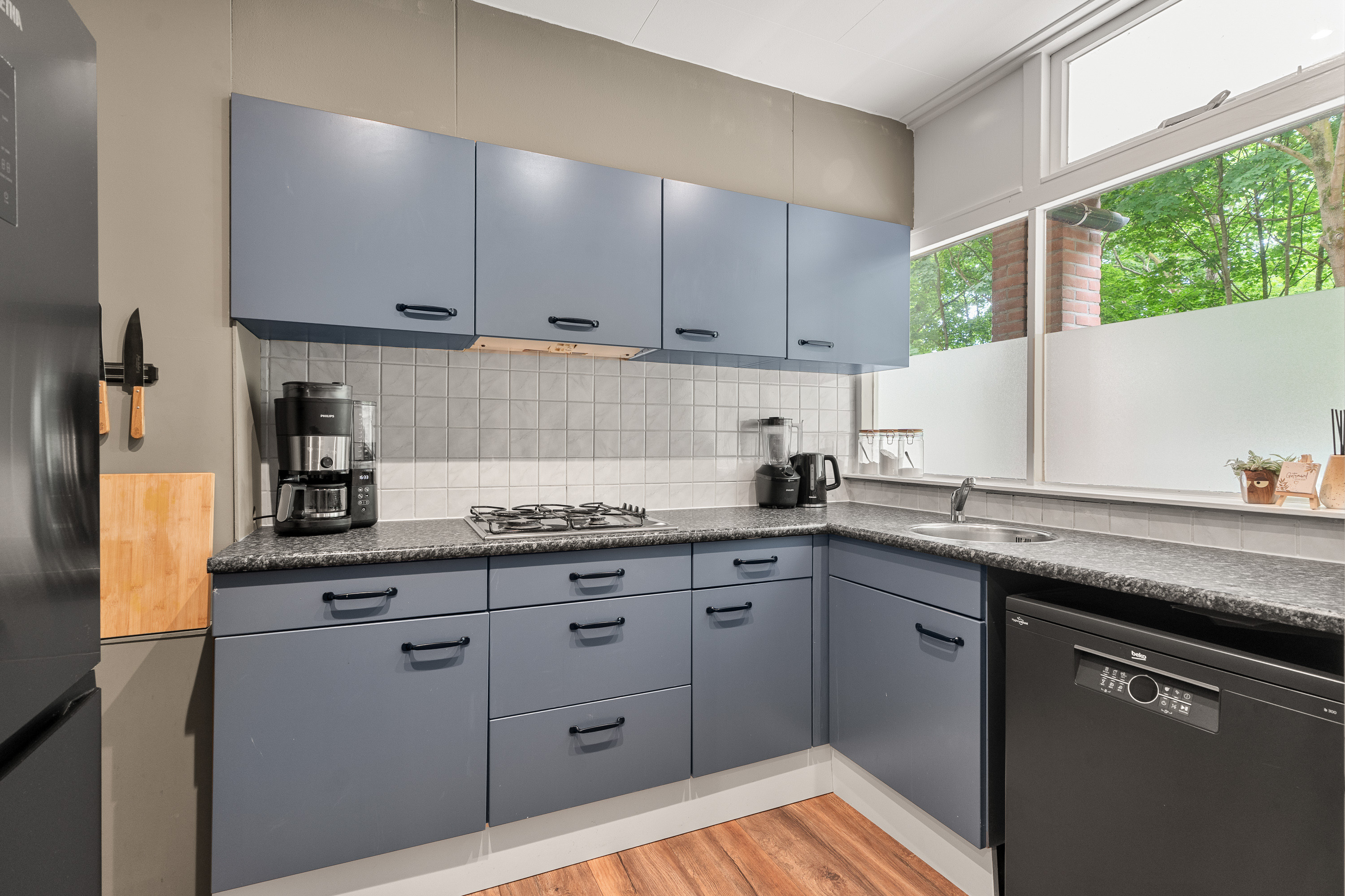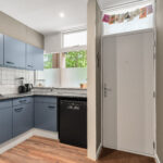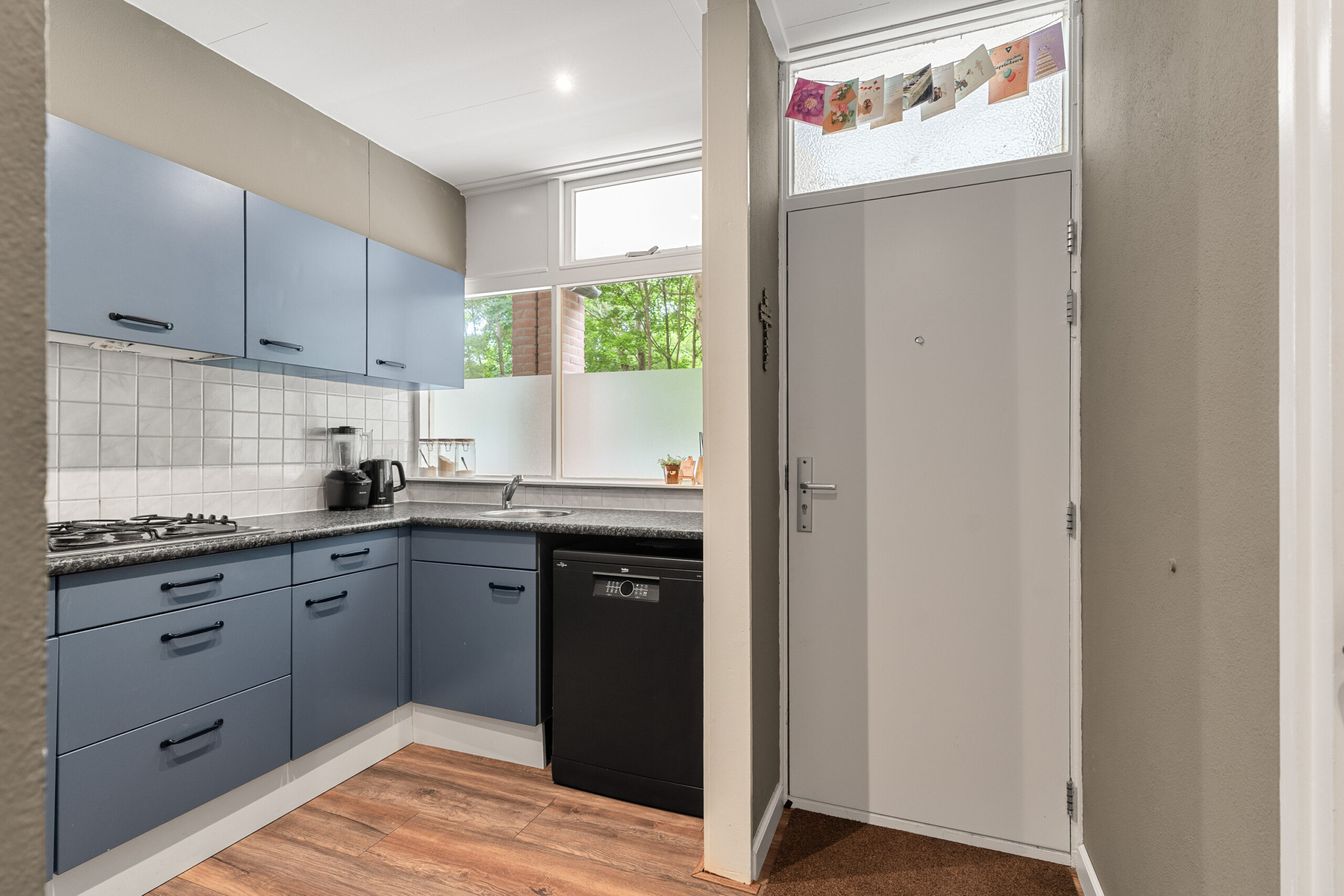 De keuken is direct bij de hal/entree gelegen. Het keukenblok is in een hoekopstelling geplaatst en betreft al een wat oudere opstelling. Dit biedt juist de mogelijkheid om zelf voor een nieuwe keuken te gaan, ééntje die helemaal jouw smaak is. In de huidige opstelling is er wel apparatuur aanwezig zoals een losse vaatwasser, een 4-pits gaskookplaat en een afzuiger. In het plafond zijn spots aangebracht. In de hoek is een kast gemaakt waar de CV-ketel is geïnstalleerd.