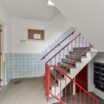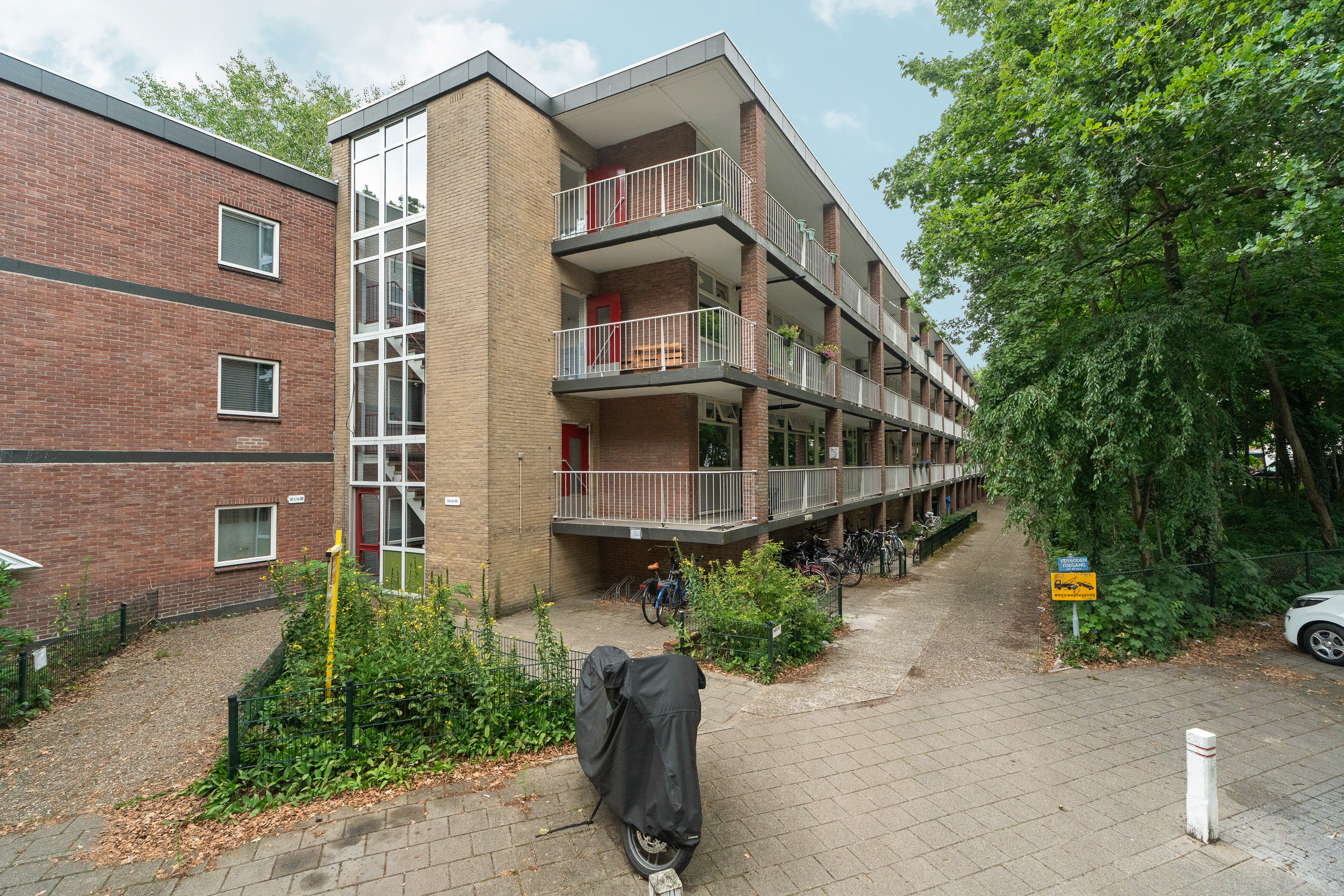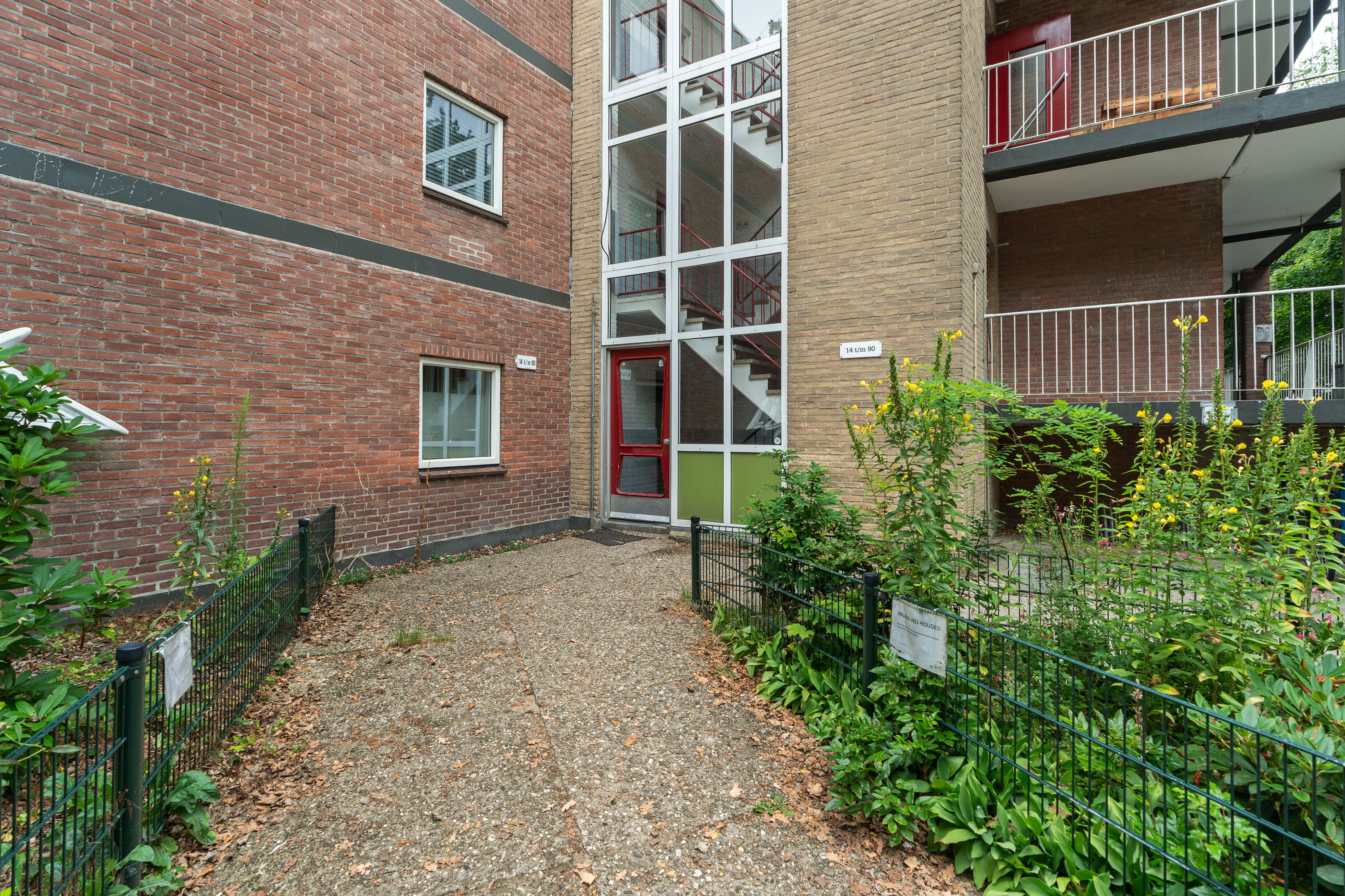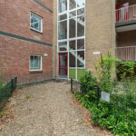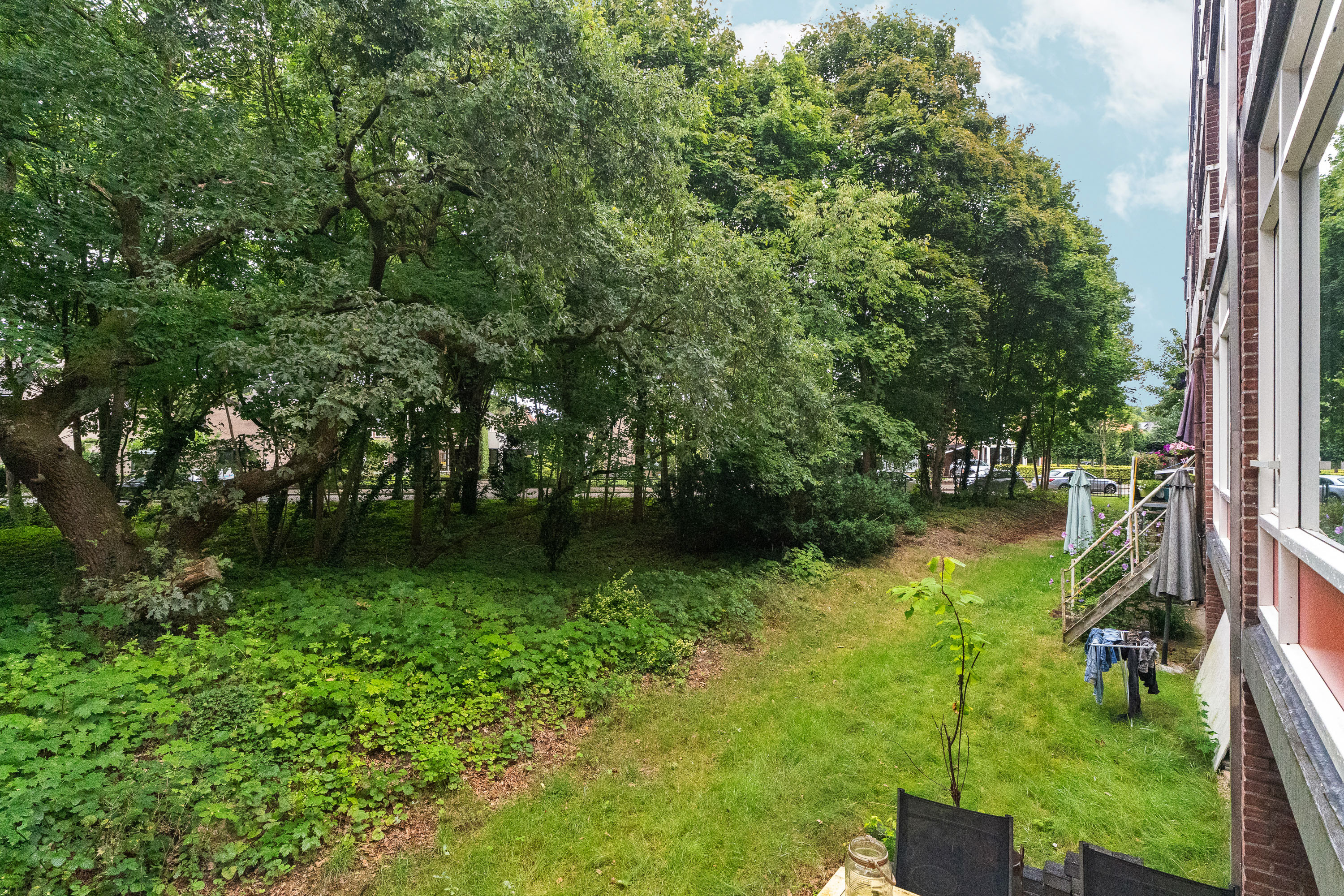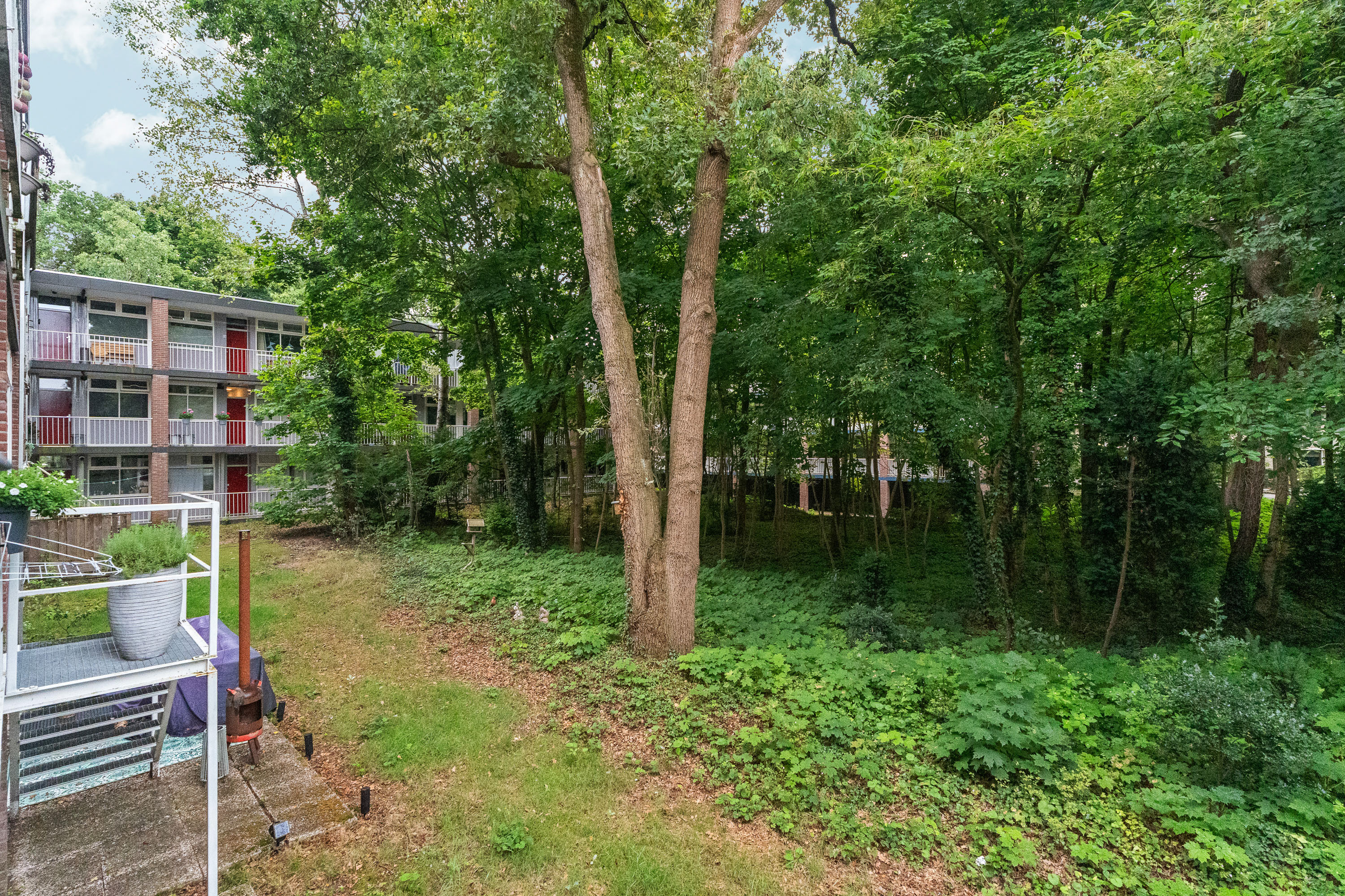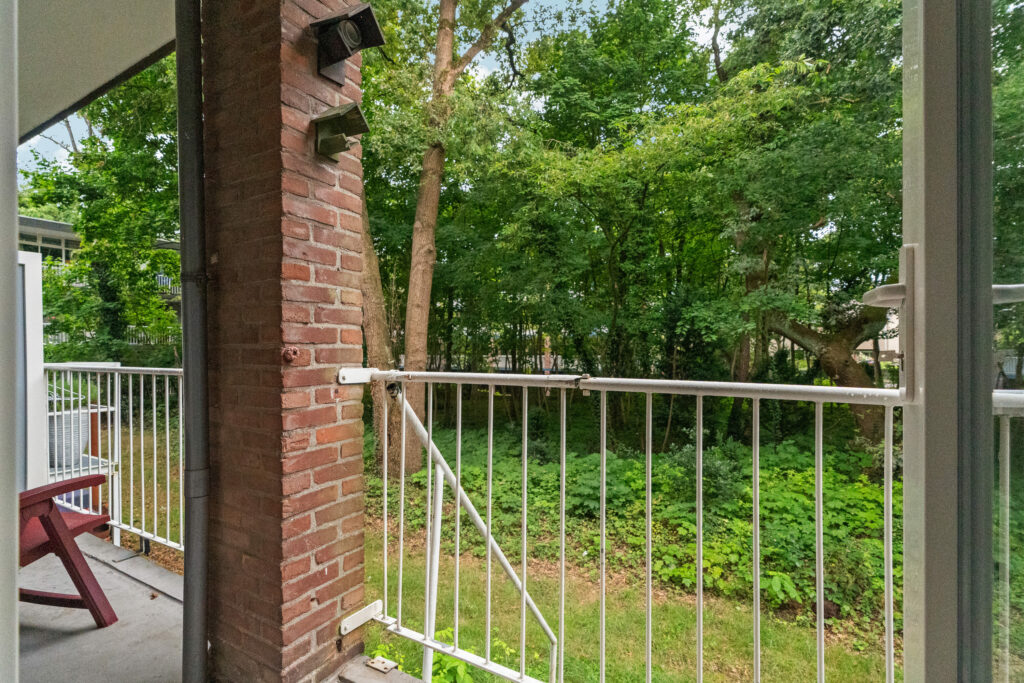 Erg handig en praktisch is de trap naar het terras in de tuin. Er is een poortje in de balustrade van het balkon gemaakt waardoor je het balkon wel kunt afsluiten, maar de trap toch toegankelijk is. Het terras iets lager bij het balkon is niet van jezelf, maar betreft een gezamenlijke tuin, maar in de praktijk wordt hier door anderen geen gebruik van gemaakt. Bovendien zijn er meerdere terrassen aangelegd. Formeel hoort het dus niet bij het appartement. Wel is het handig dat je hier bijvoorbeeld een fiets onder het balkon zet. Wil je even snel naar de supermarkt, kun je dus even snel de fiets pakken…
