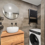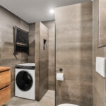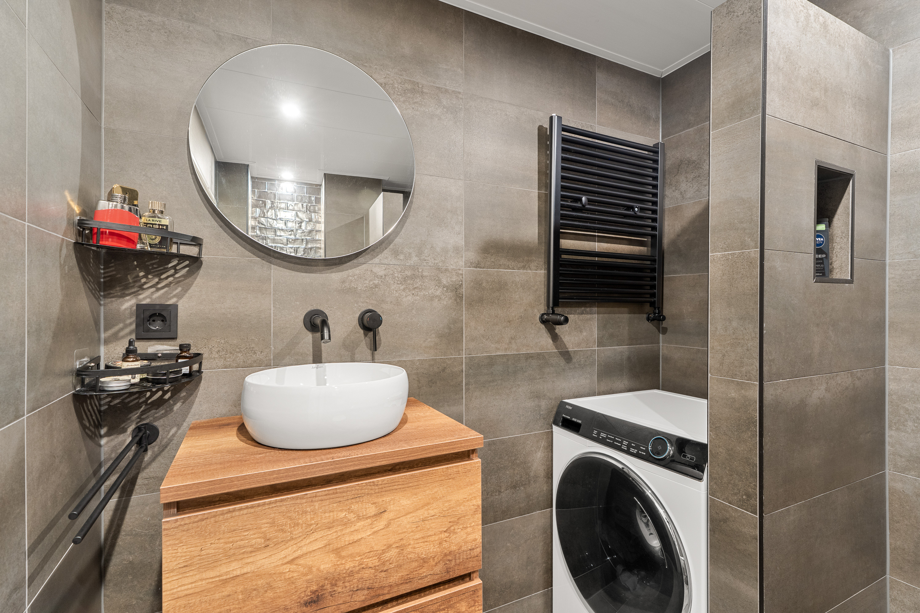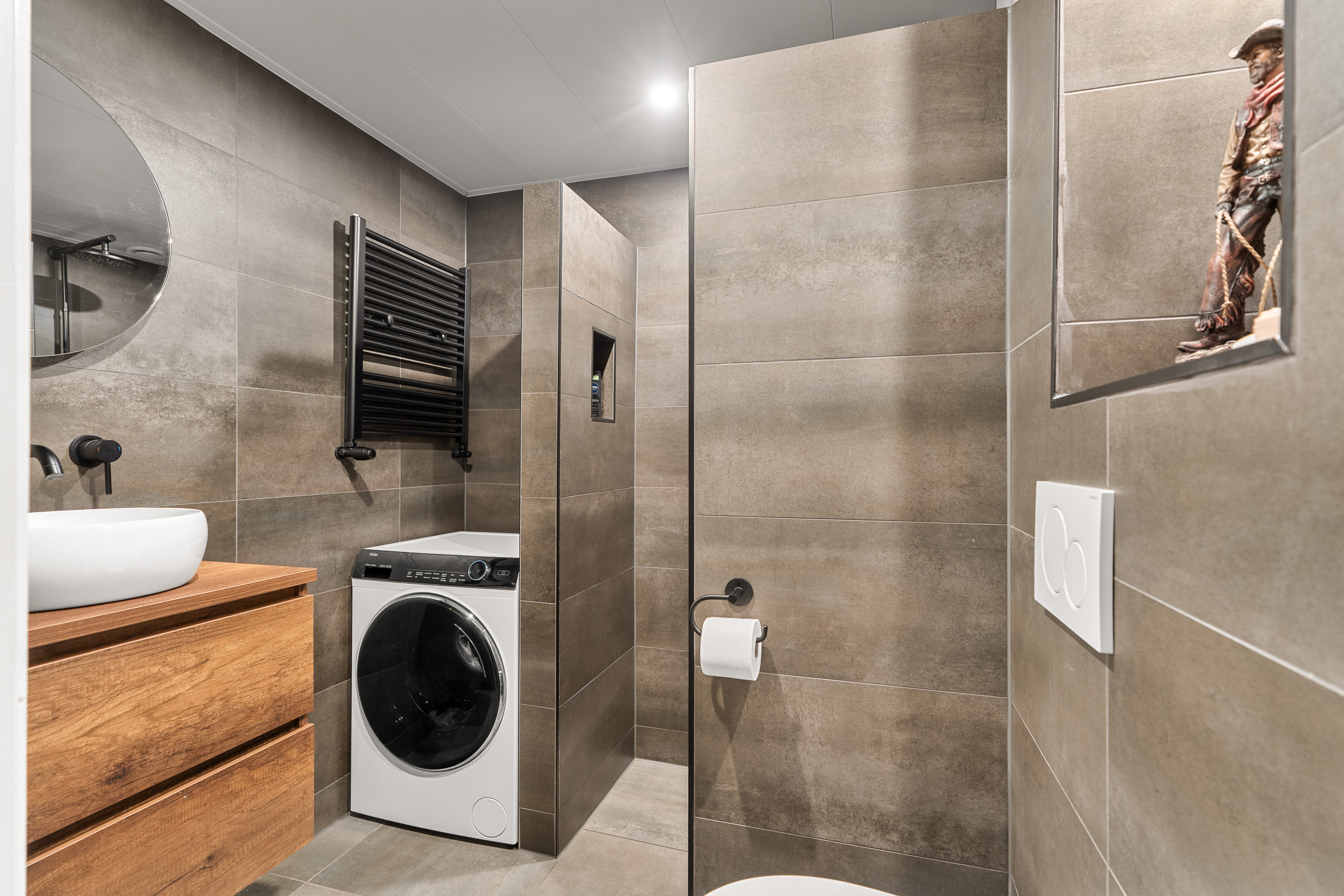 Badkamer met inloopdouche, wastafelmeubel, toilet en wasmachine-aansluiting