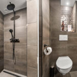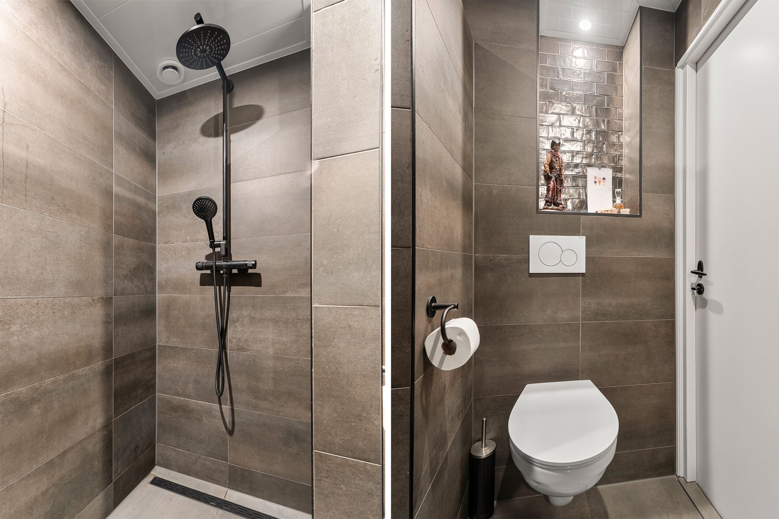 Eind 2022 heeft deze woning een geheel nieuwe badkamer gekregen. Hierdoor heeft het een moderne en hedendaagse uitstraling doordat er is gekozen voor trendy sanitair en tegelwerk. De ruimte is ingedeeld met een comfortabele inloopdouche welke is v.v. een rainshower, een handdouche en een strakke drainafvoer. In de wand is een nisje gecreëerd waar je douchegel en shampoo in kunt zetten. Verder heeft deze badkamer een wastafelmeubel en een zwevend wandcloset. Het wastafelmeubel wordt compleet gemaakt met een waskom, 2 ladekorven, een kraan uit de muur en een ronde spiegel. Het tegelwerk is zeer verzorgd aangebracht, onder meer met een dun, gesneden voeg. Spotverlichting in het plafond maakt het plaatje helemaal af. Ventileren kan met een nieuw afzuigsysteem (Duco).