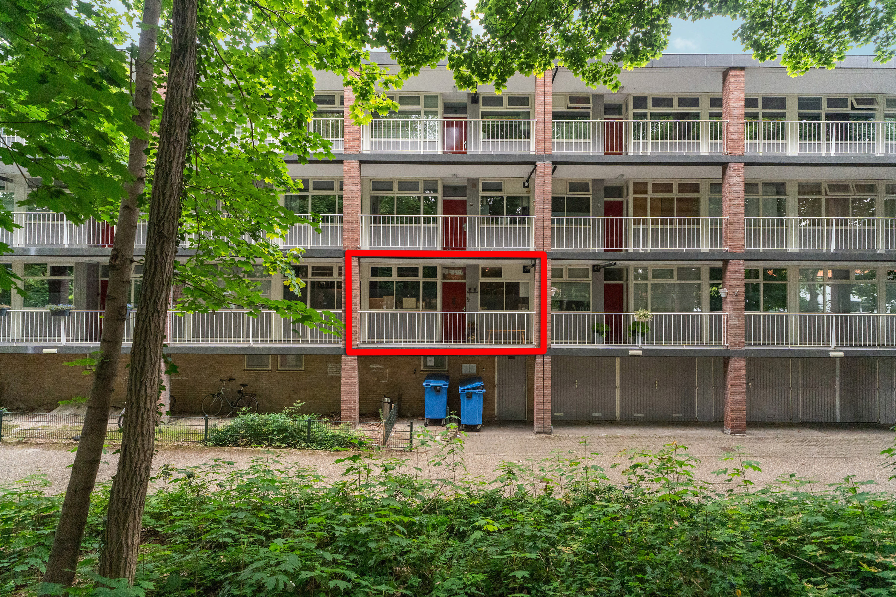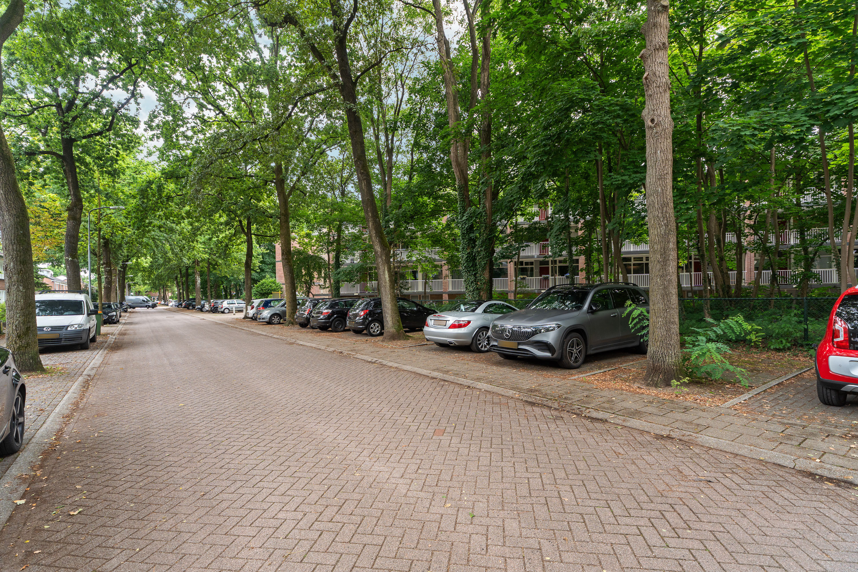Noemenswaardig is dat beide slaapkamers aan de zonzijde zijn gelegen, maar op warme zomerdagen toch enigszins koel blijven. Dat komt door de bomenrij en de lagere ligging in het complex waardoor dit appartement in de schaduw van de bomen is gelegen. Dit zal je zeker moeten aanspreken.