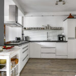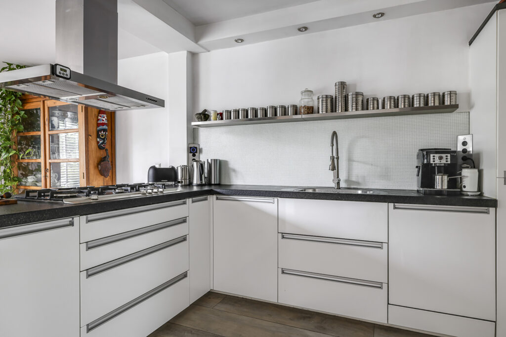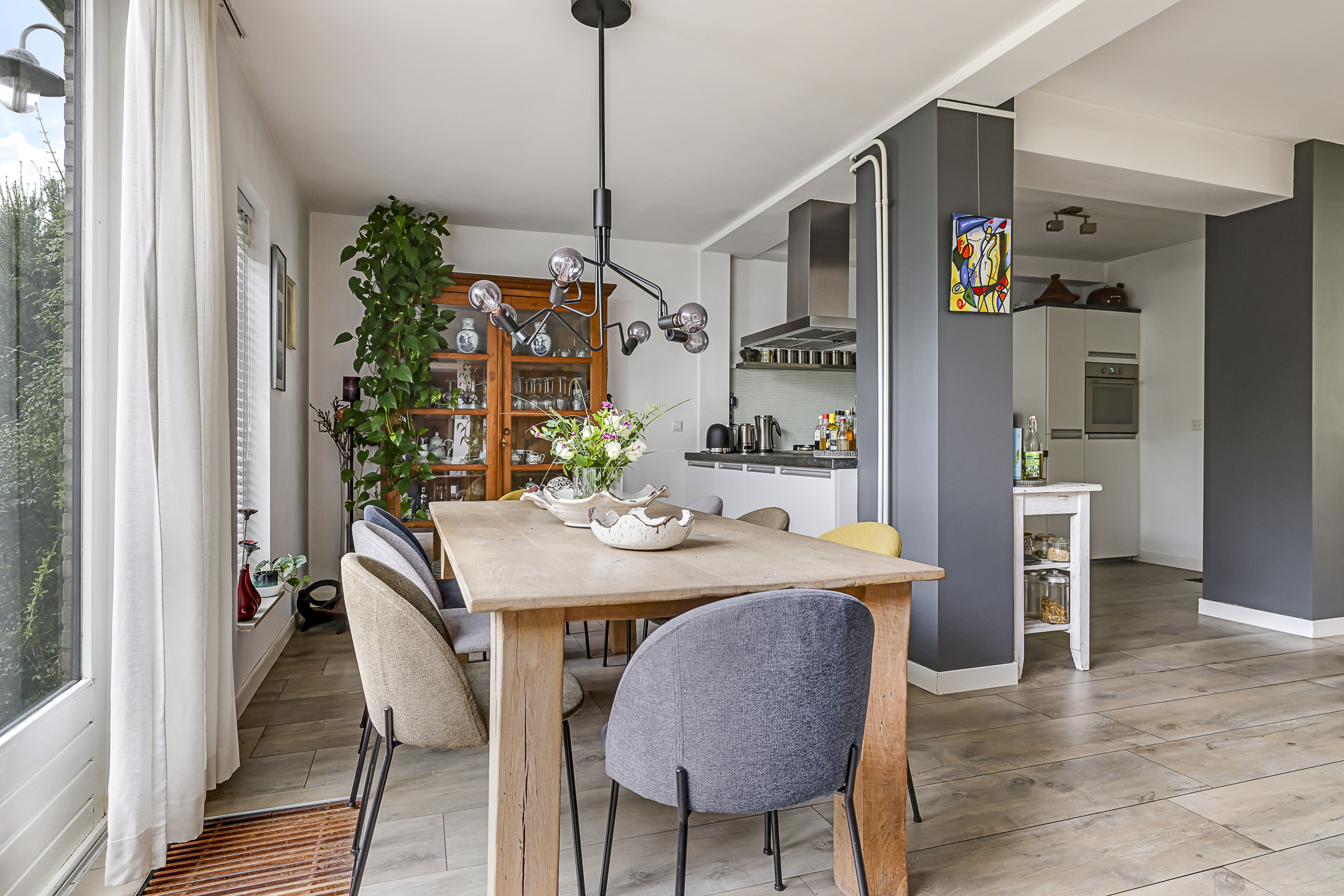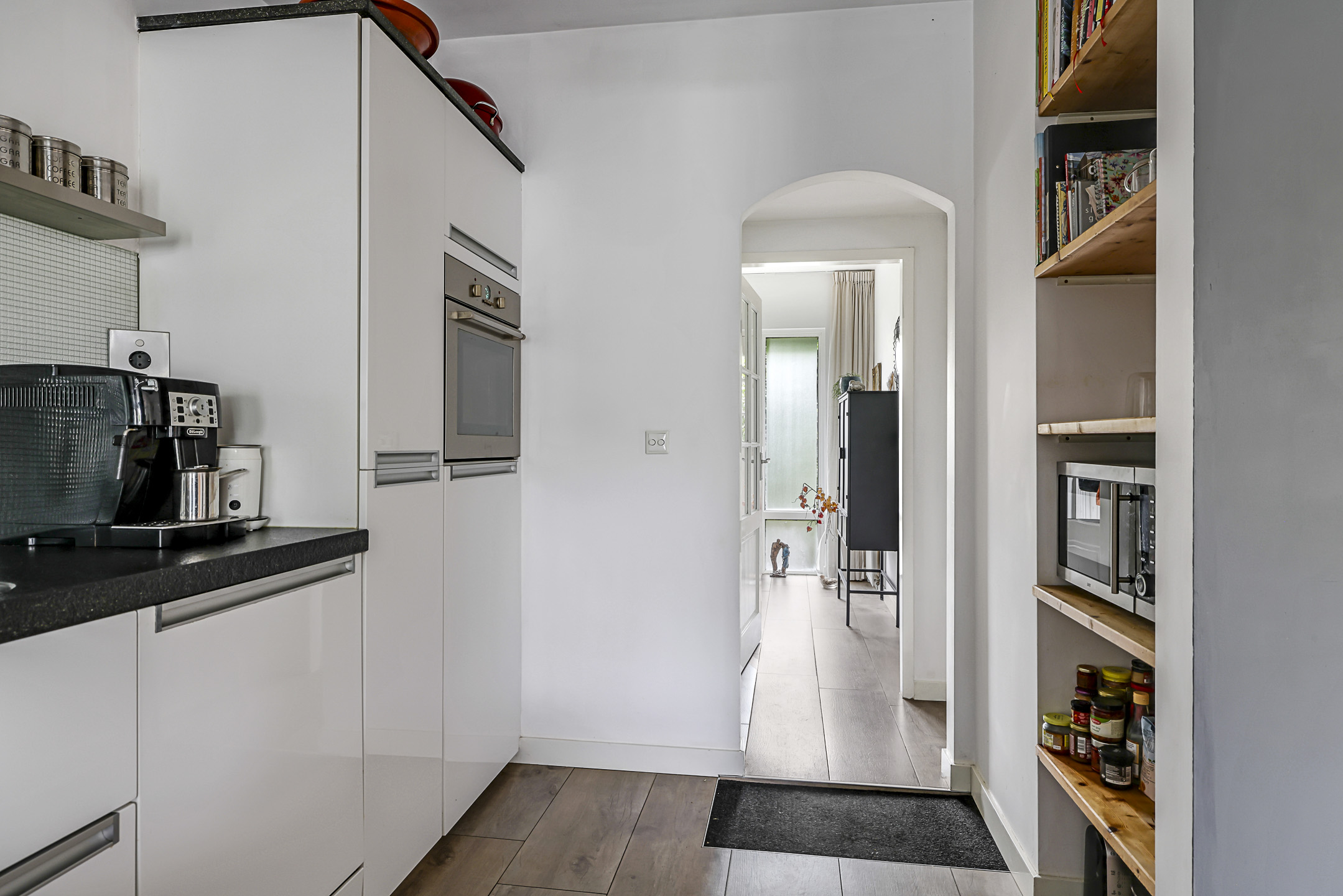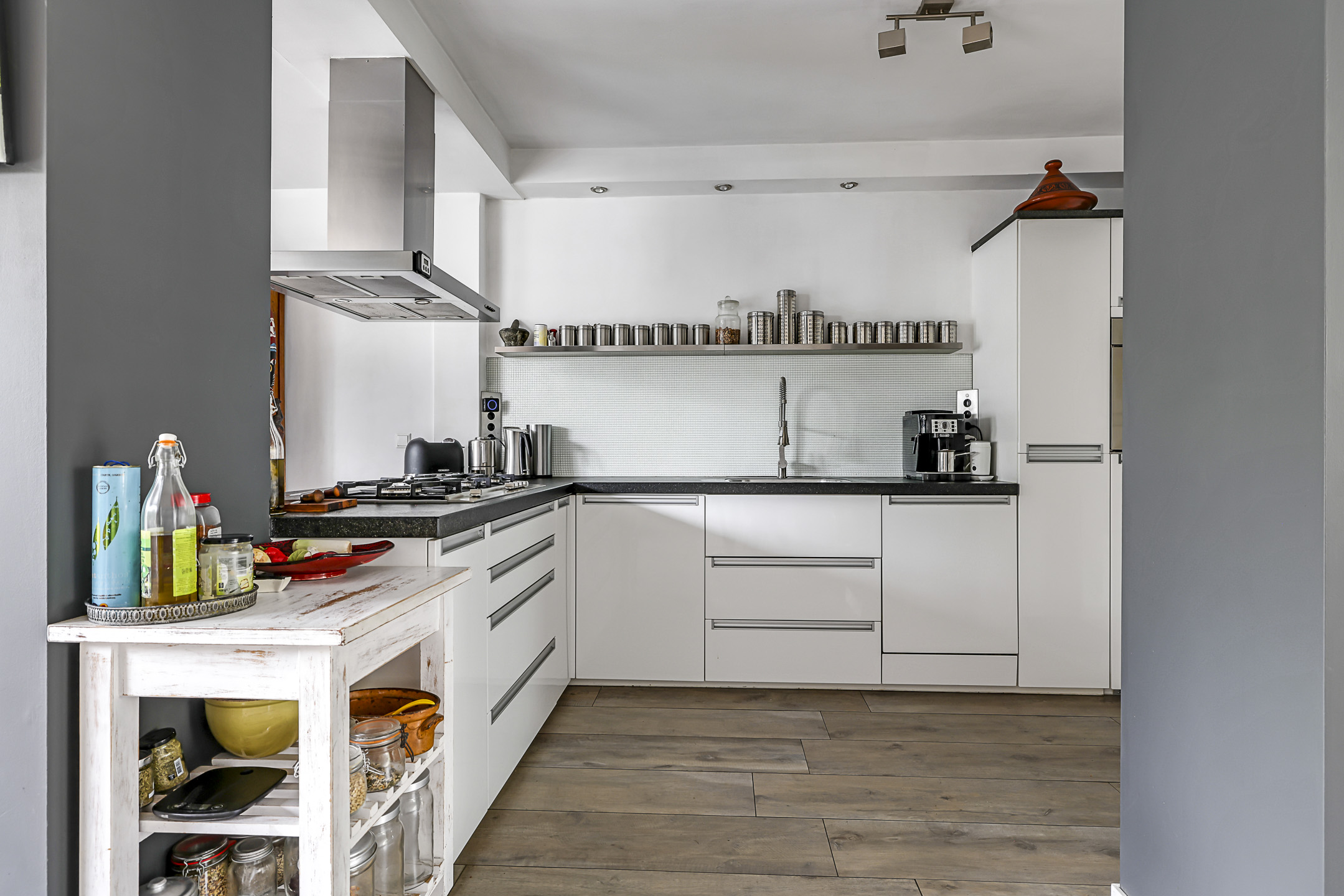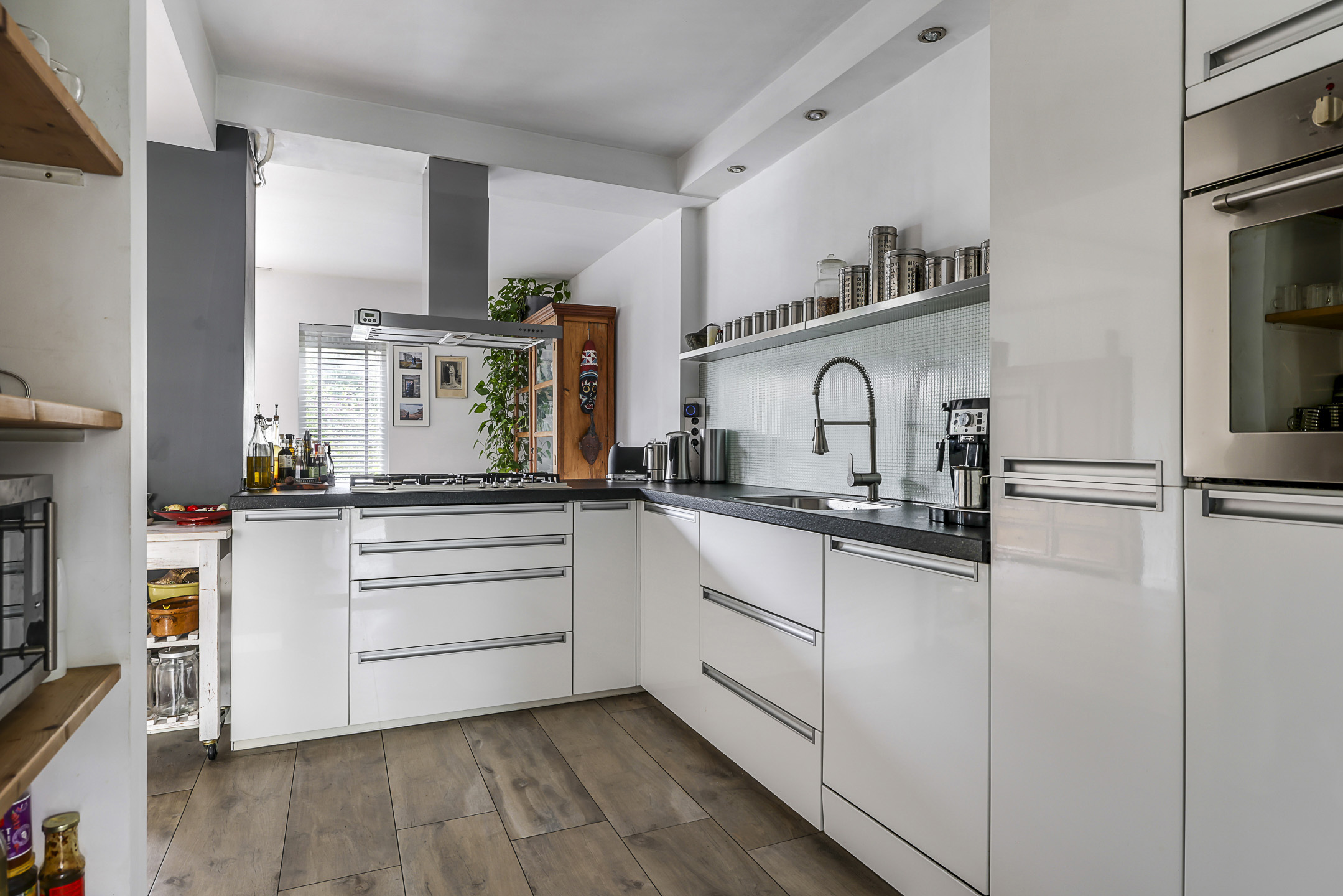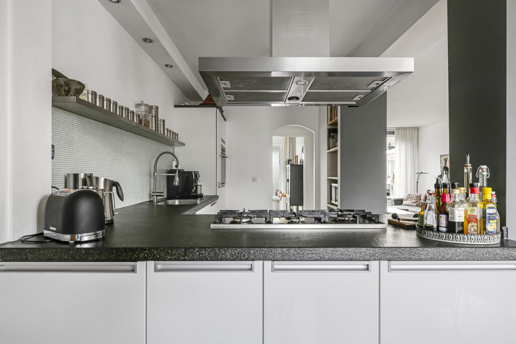 Centraal in de woonkamer is de keuken gelegen. Door de uitbouw heeft de keuken een centralere plek in de woning gekregen. Hier is dan ook gebruik van gemaakt door een keuken te kiezen met een schiereiland. Dit is vooral erg gezellig wanneer je staat te koken en je dan door kan kletsen met je tafelgenoten. De keuken is voorzien van een natuurstenen werkblad wat het een luxe uitstraling geeft. Er is veel inbouwapparatuur aanwezig, zoals een 5-pits gaskookplaat, een afzuigkap, een vaatwasser, een grote oven en een koelkast. In de apothekerskast tref je veel opbergruimte. Noemenswaardig is dat bij het schiereiland beide zijden zijn voorzien van kastruimte. Tegenover het keukenblok is zijn schappen in een koof weggewerkt, ideaal voor de kopjes en glazen, de kookboeken of voorraad.