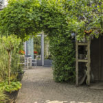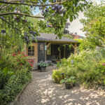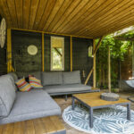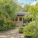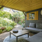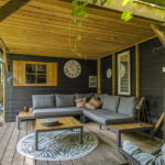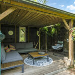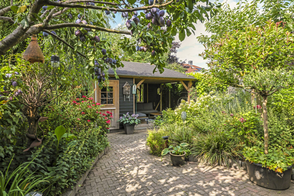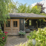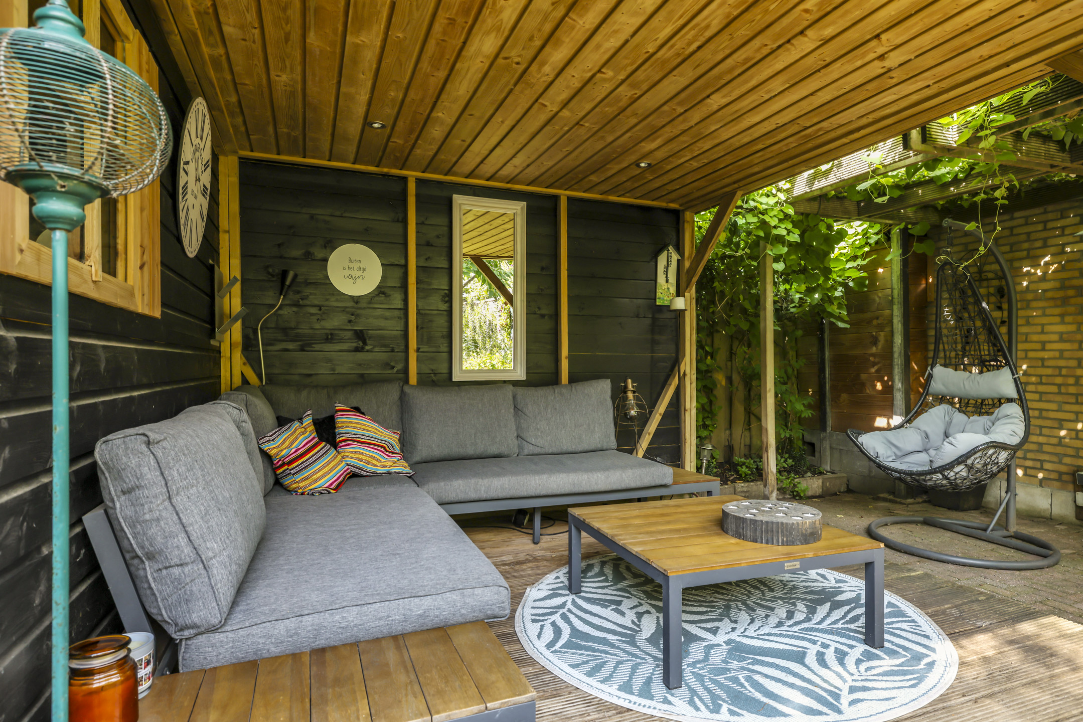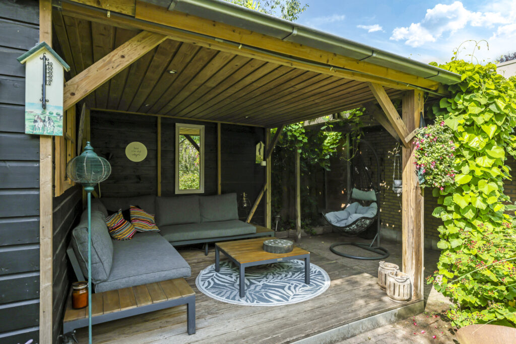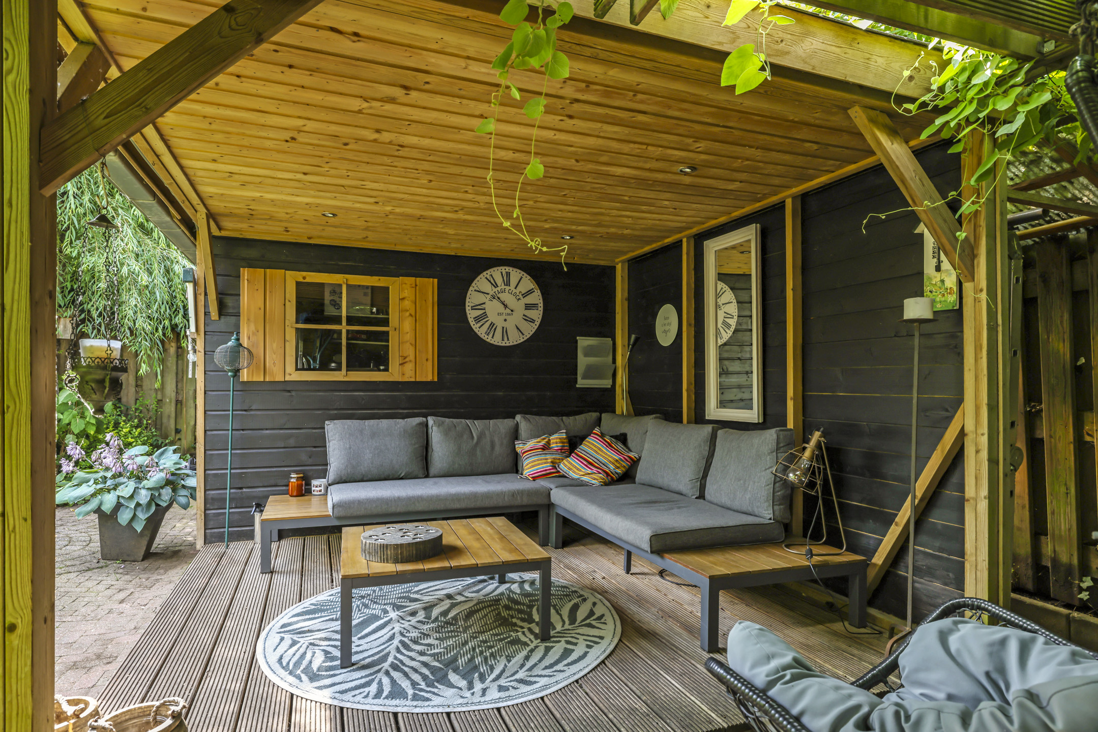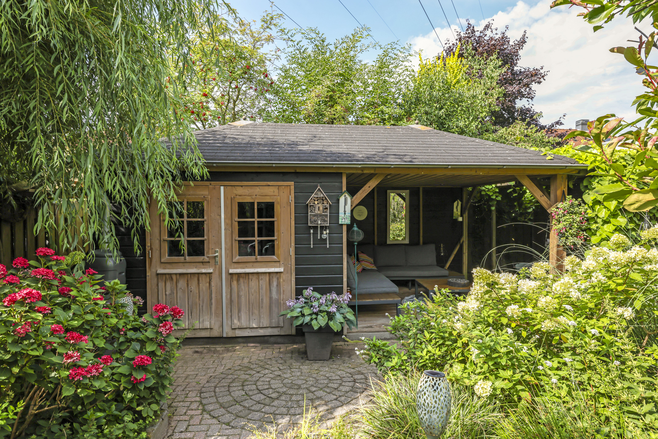 Achter in de tuin een houten tuinhuis met aangebouwde veranda
