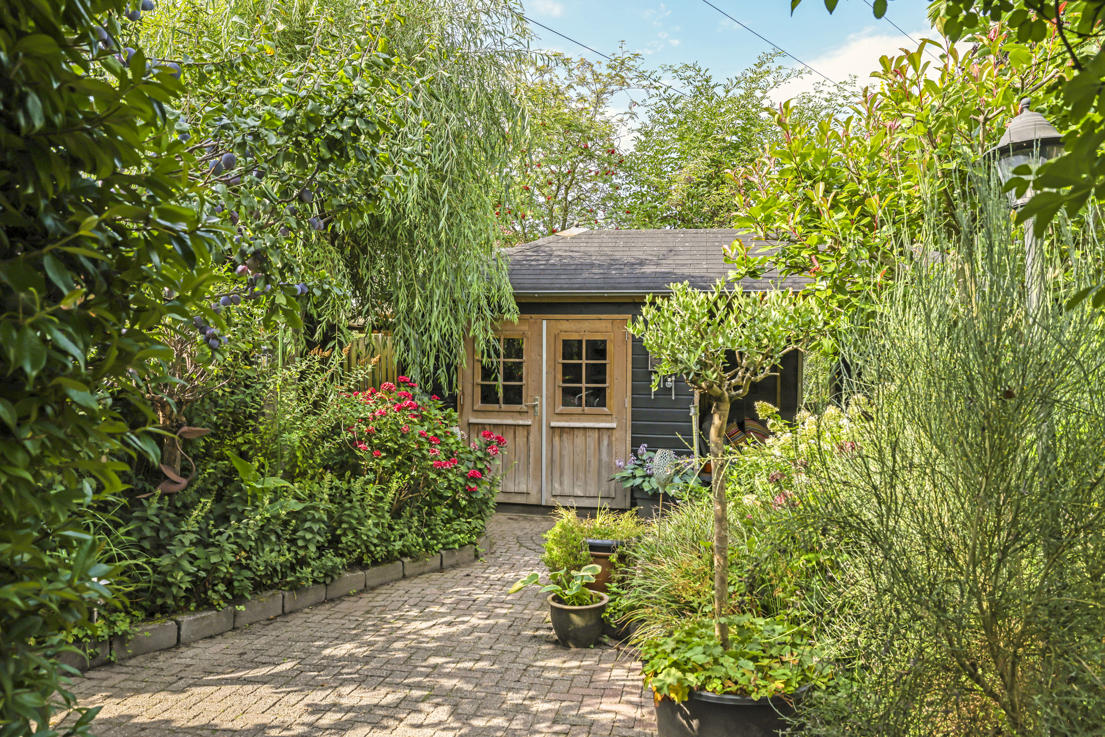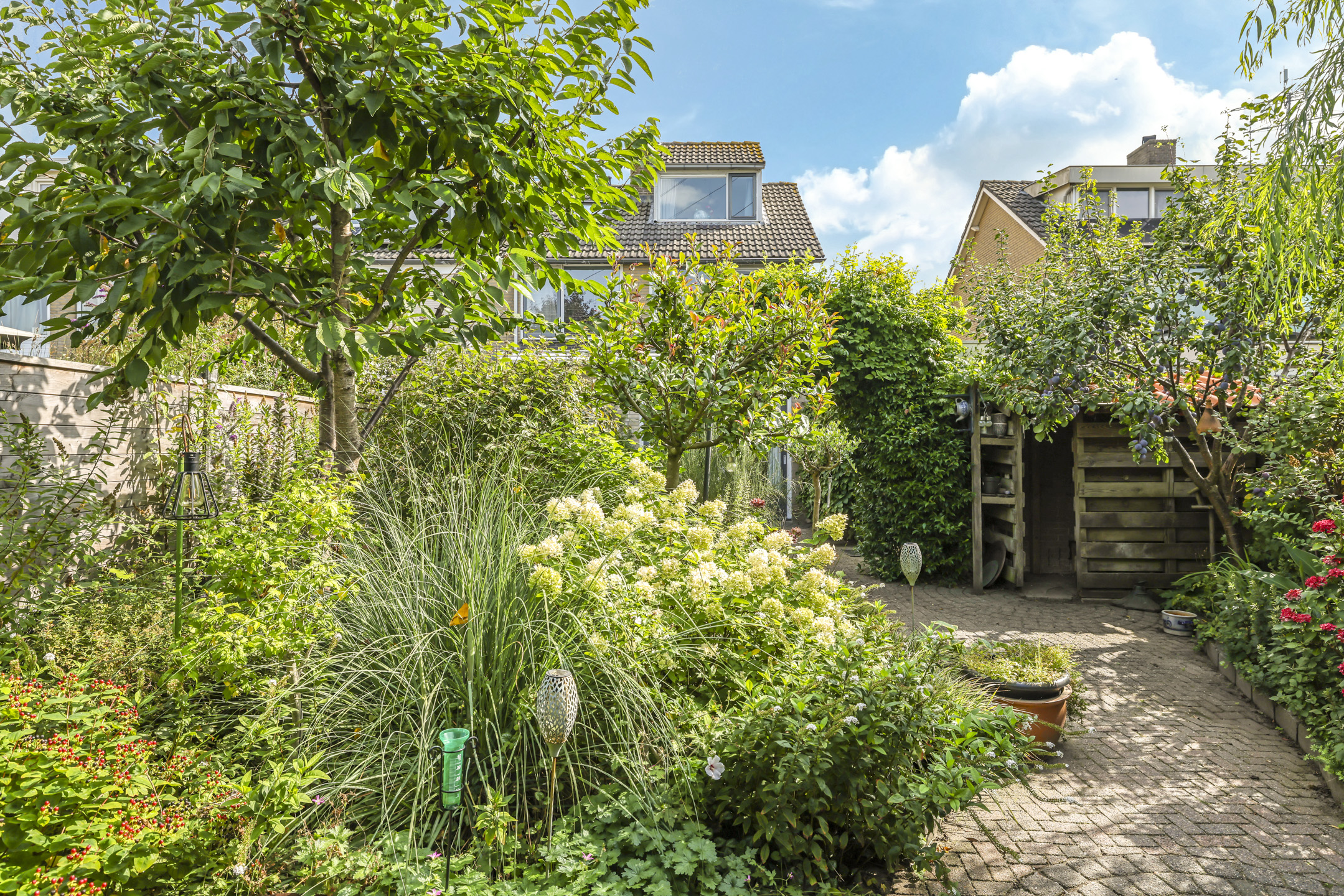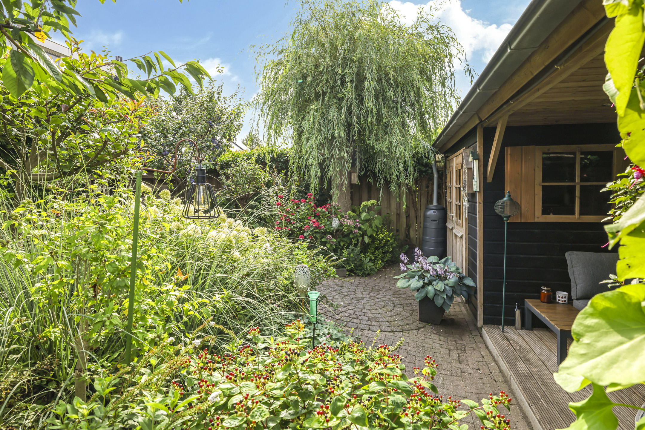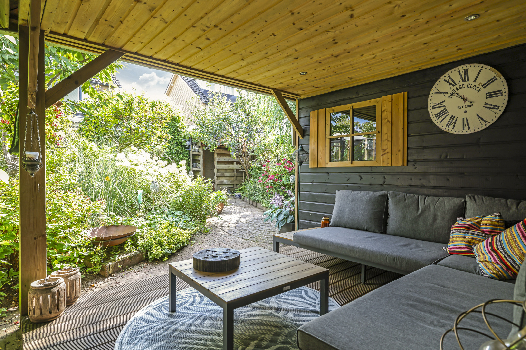 Ben je een tuinliefhebber, dan zal je deze achtertuin zeker aanspreken. Deze tuin is maar liefst ca. 16 meter diep en is daarmee veel dieper dan de gemiddelde achtertuin in het segment. En doordat de woning van zichzelf al vrij breed is en er nog een garage naast staat, is de tuin ook nog eens ca. 9 meter breed. Tevens heeft de tuin veel zonuren doordat het op het zonnige zuidwesten is gelegen. Om schaduw te creëren is er aan de achtergevel elektrisch bedienbare zonwering geplaatst. In het verlengde van de werkkamer tref je nog een stenen berging aan om te klussen en voor het nodige (tuin)gereedschap op te bergen. Is deze ruimte te klein, dan heb je achterin nóg een houten tuinhuis. Dit tuinhuis is opgebouwd uit een berging (3 x 3 m) en een overdekte sfeervolle veranda (3 x 3 m) gebouwd. Hier kan je heerlijk beschut in de schaduw en met veel privacy in de tuin zitten. In deze veranda is elektra en bedraad internet aanwezig.