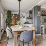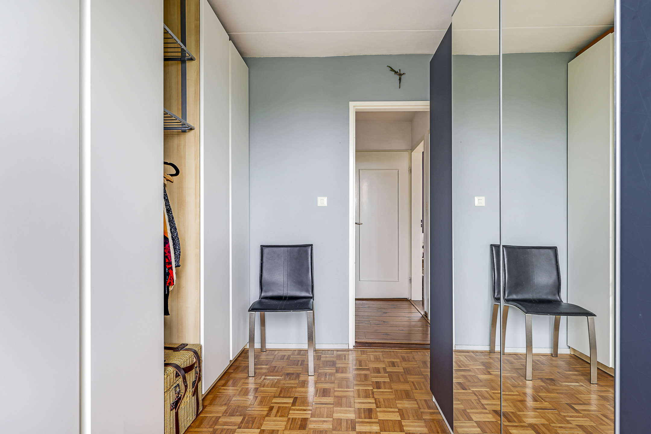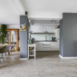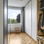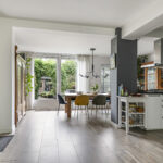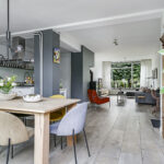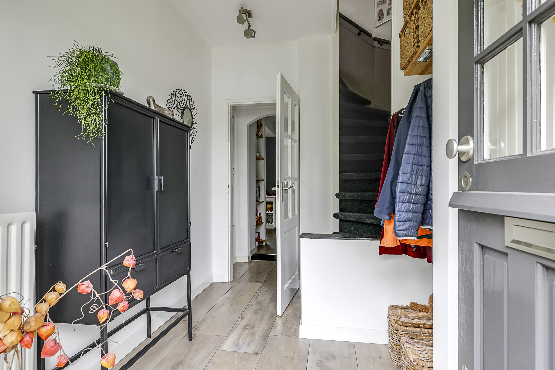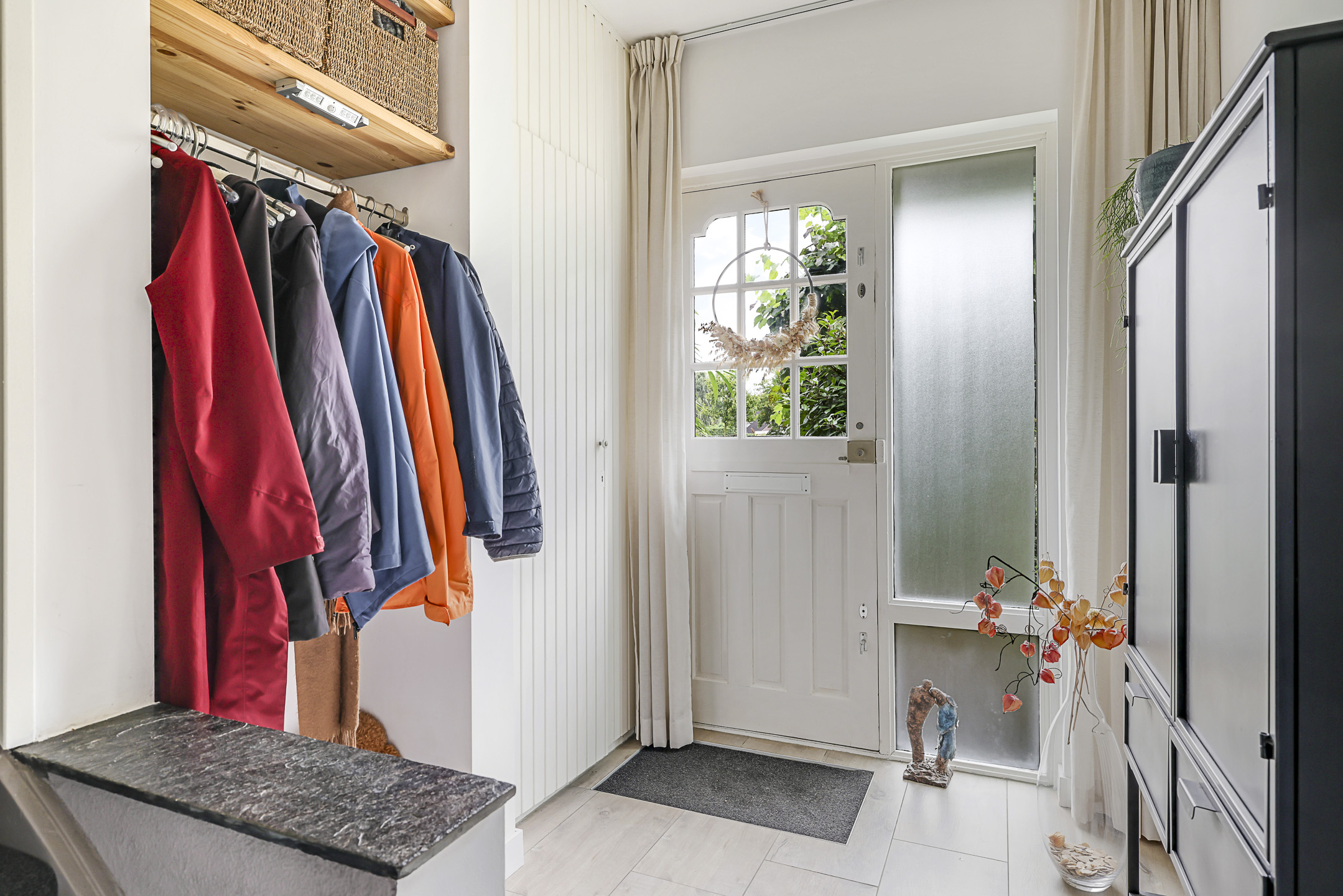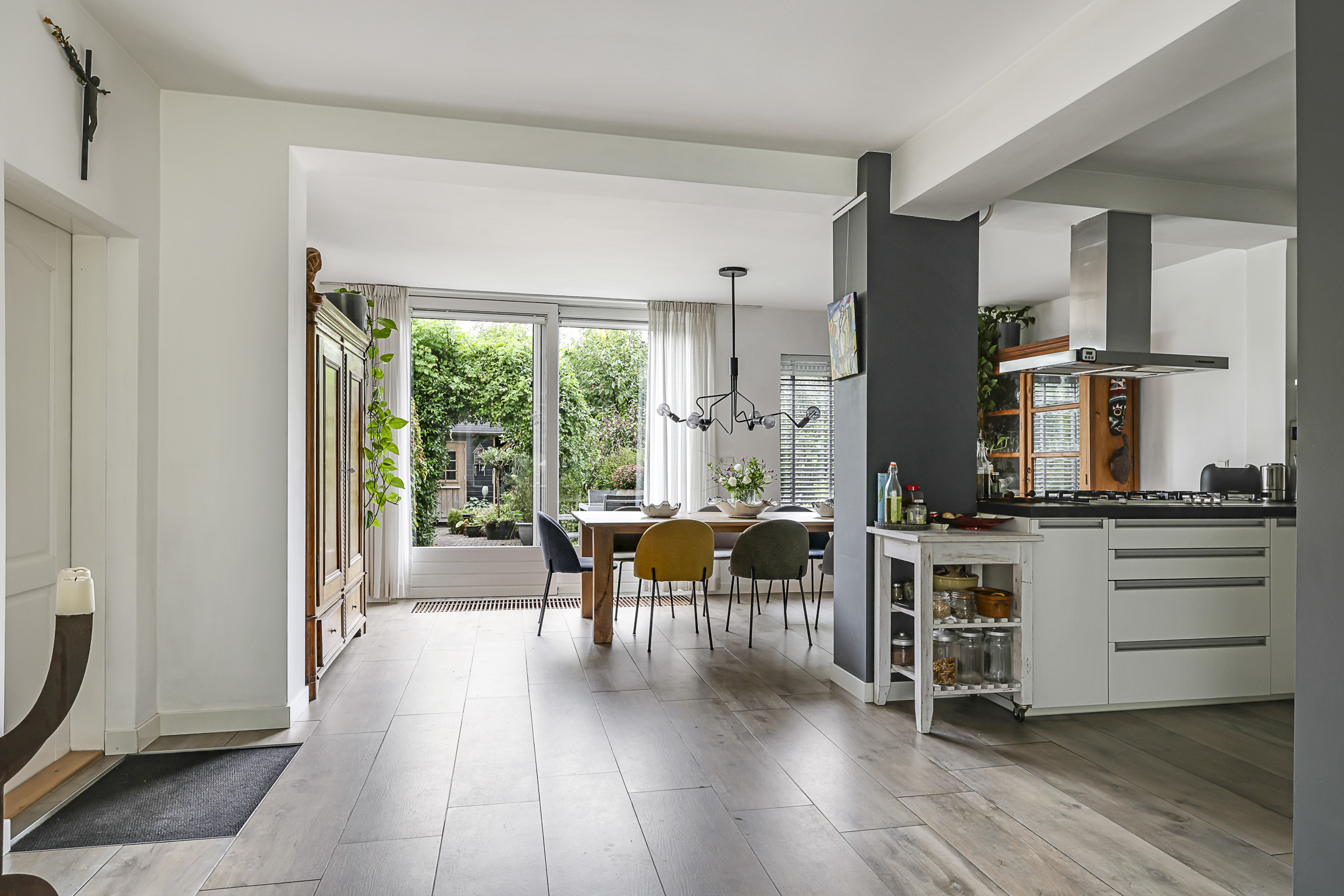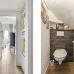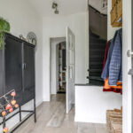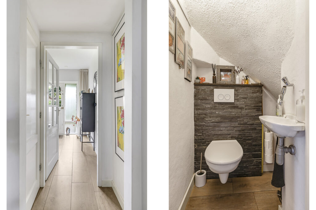 Bij deze woning is het prettig binnenkomen in de hal. Ook hier hebben de nodige veranderingen plaatsgevonden. Het toilet wat zich oorspronkelijk tussen de meterkast en de hal bevindt is verplaatst naar een ‘tussenruimte’ tussen de hal en de keuken. Zo heb je in de hal fijn de ruimte voor de garderobe. Door het verplaatsen van de deur loop je nu vanuit de hal rechtdoor de keuken in.