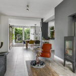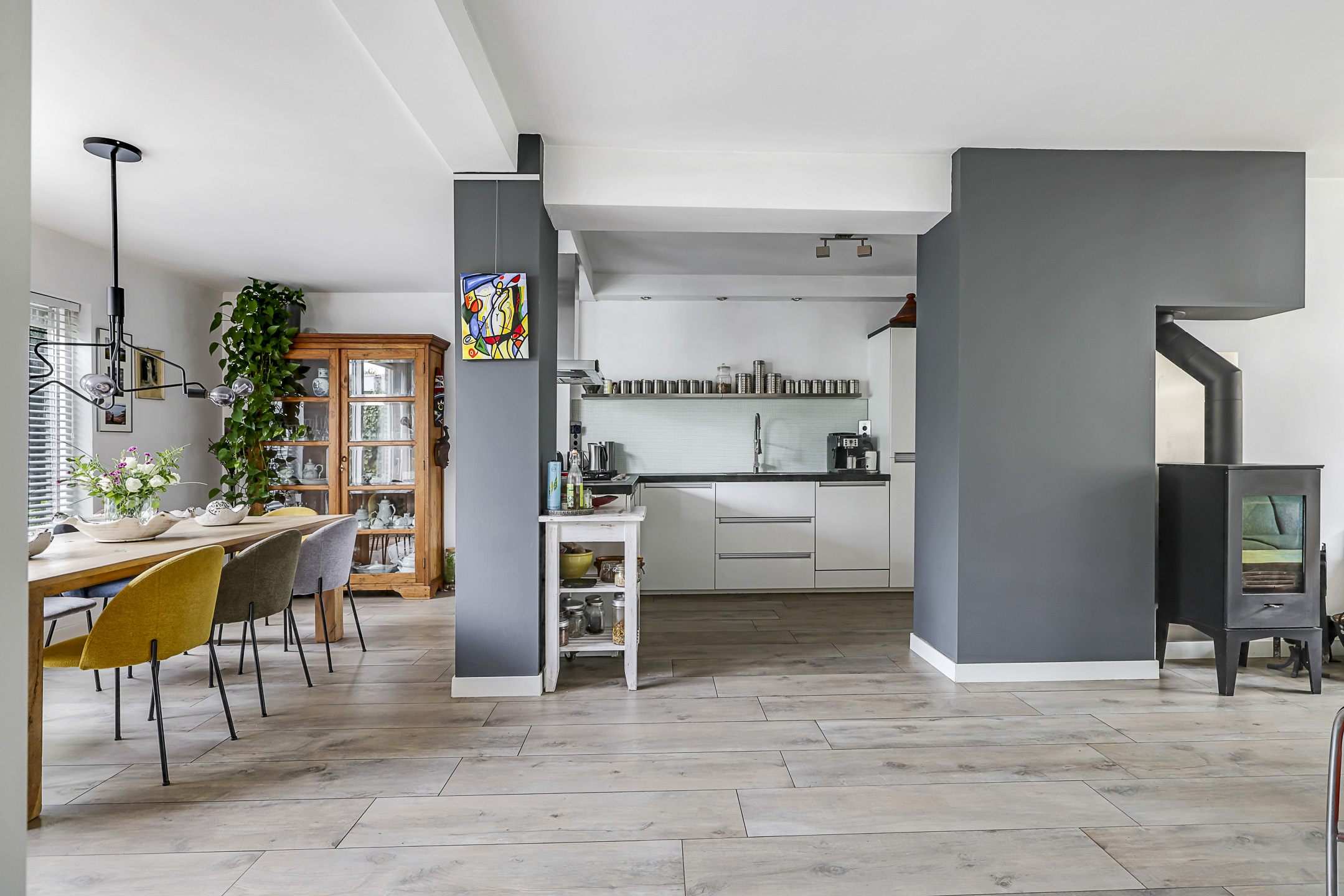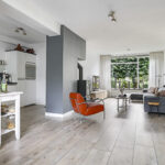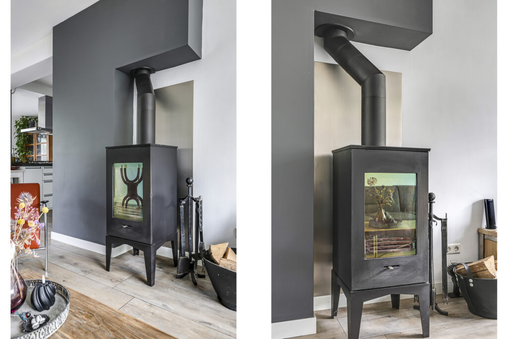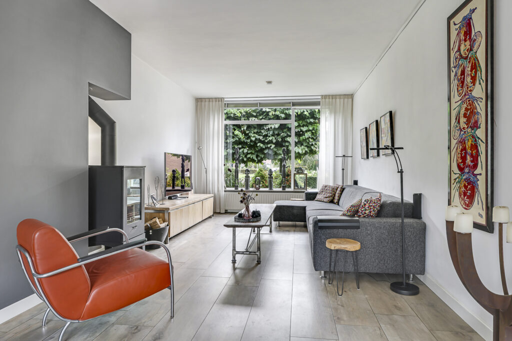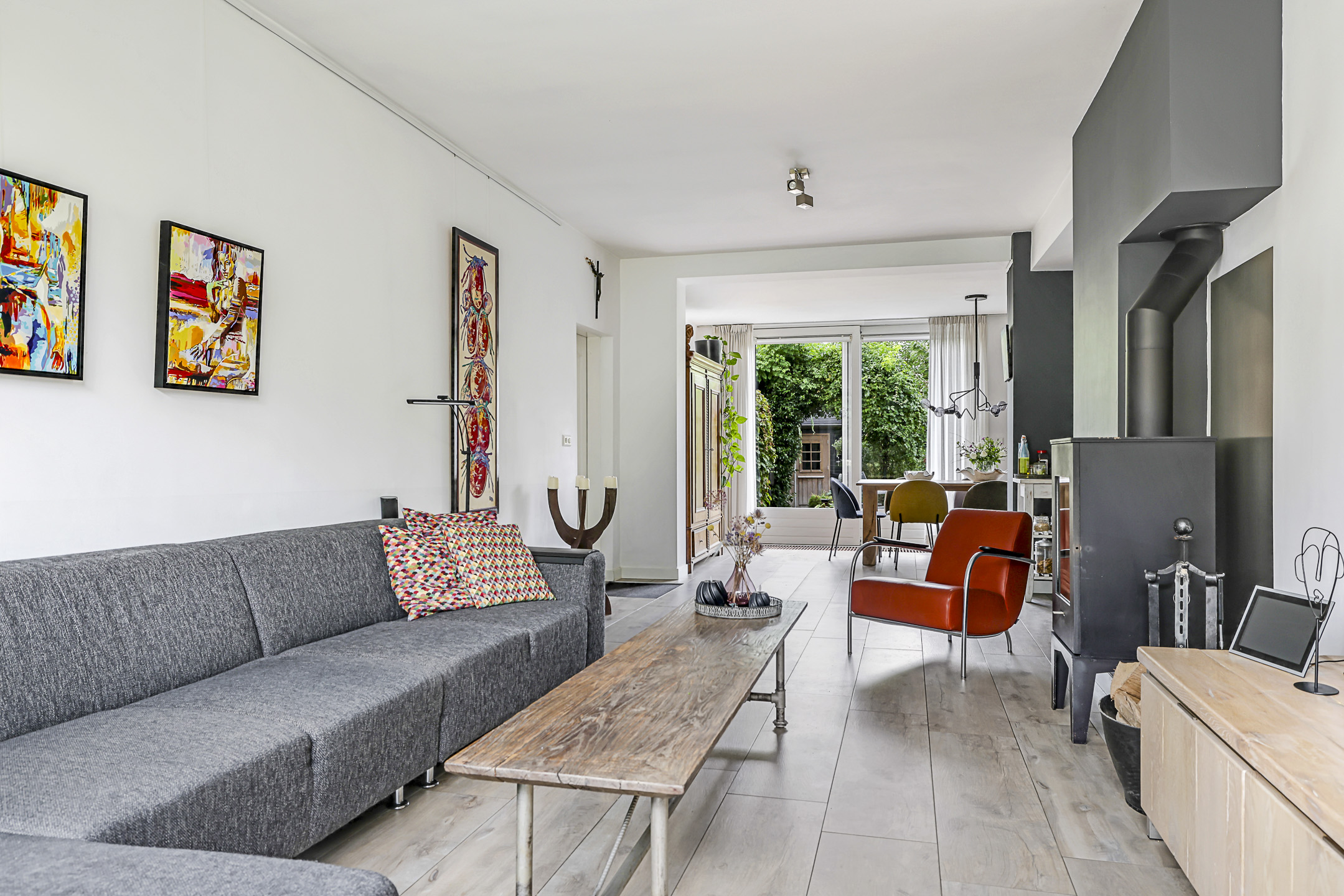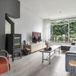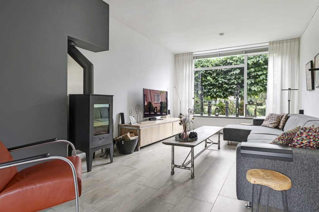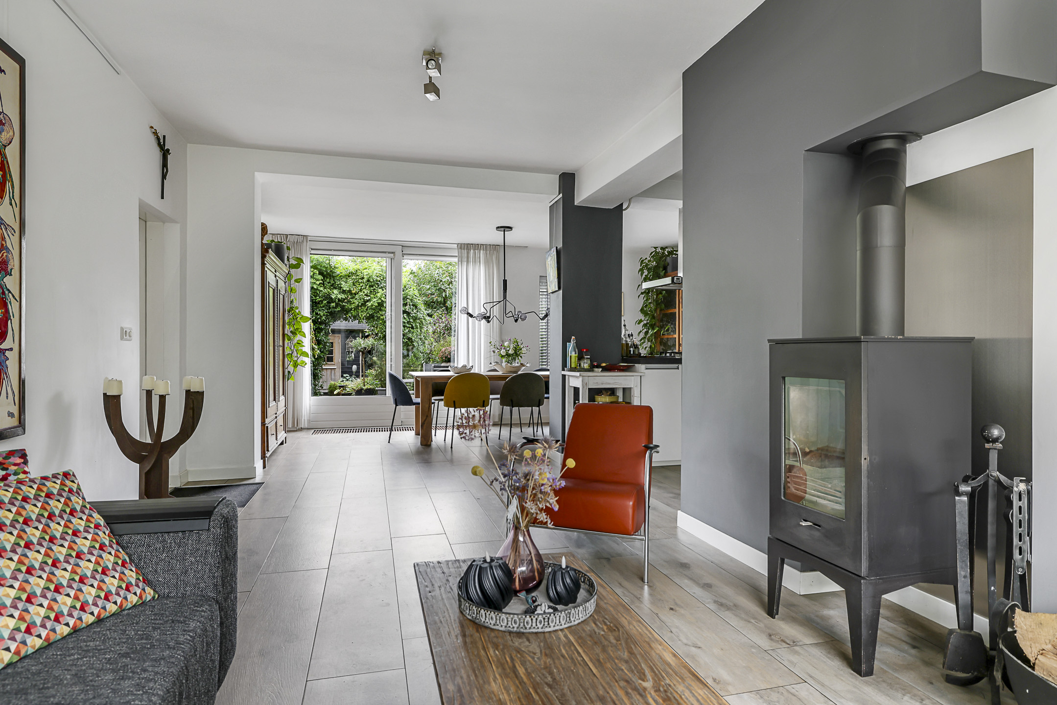 Uitgebouwde doorzonwoonkamer met houtkachel en schuifpui