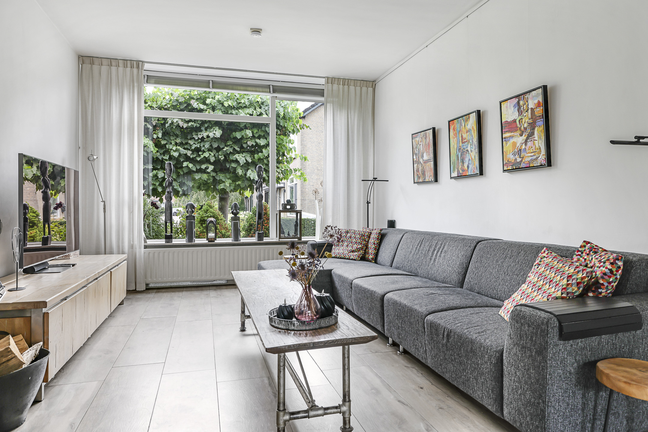 Van huidige woonkamer is niet veel meer terug te zien. De woning is aan de achterzijde uitgebouwd waardoor de kamer aanzienlijk vergroot is. Hierbij is tevens een schuifpui geplaatst waardoor je hier in de zomerdag de tuin en woonkamer eenvoudig bij elkaar kan betrekken. Een andere verandering heeft plaatsgevonden bij de hal. De originele toegangsdeur tot de woonkamer is verplaatst richting de keuken waardoor er in de woonkamer een blinde muur is ontstaan. De kamer is hierdoor praktischer in te richten. De woonkamer is voorzien van vloerverwarming waardoor de vloer aangenaam aanvoelt. Ook is er een houtkachel aanwezig wat voor veel sfeer en warmte zorgt op een koude winteravond. De woonkamer is voorzien van gestuukte wanden en een vloer met plavuizen in vergrijsd eiken-look.