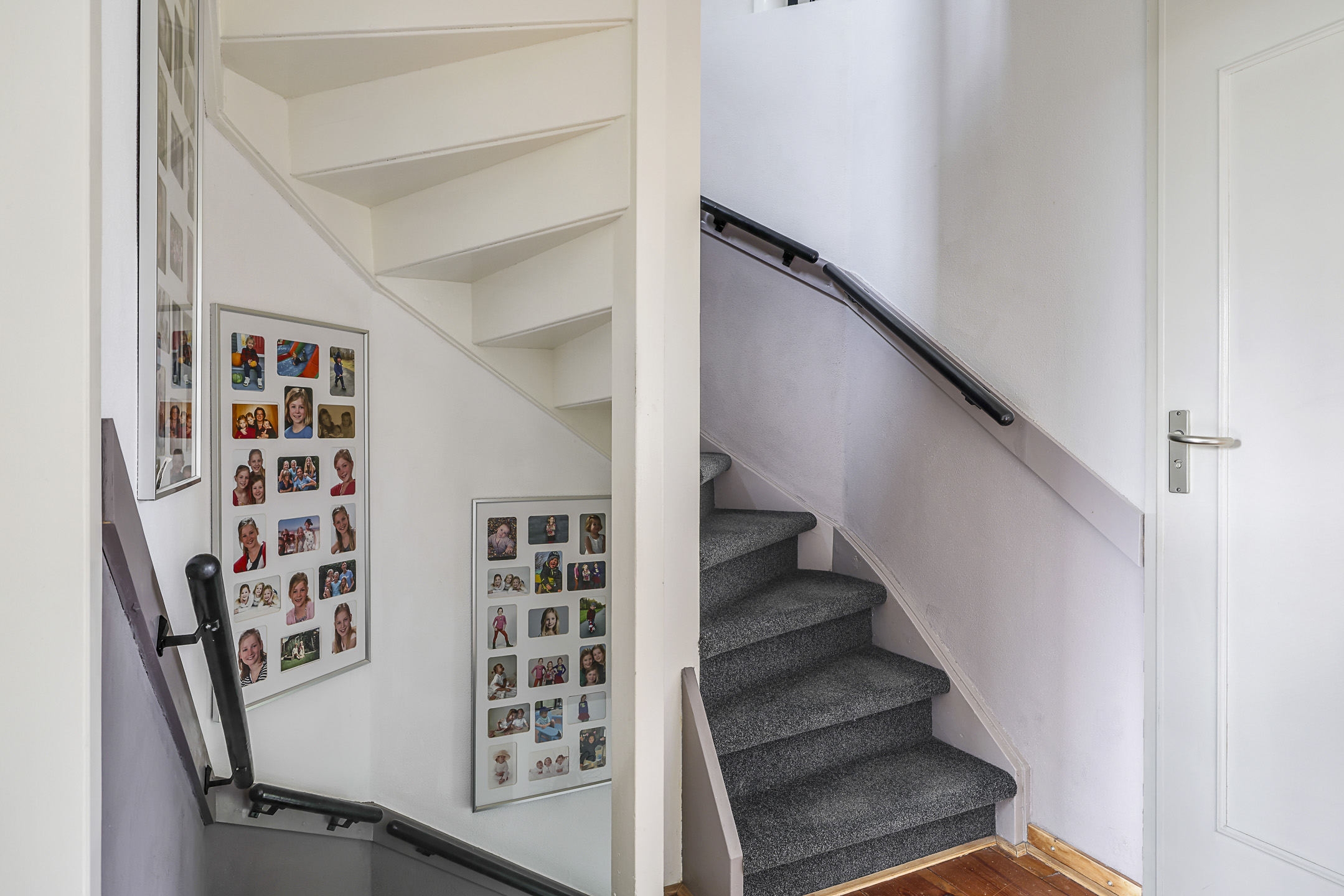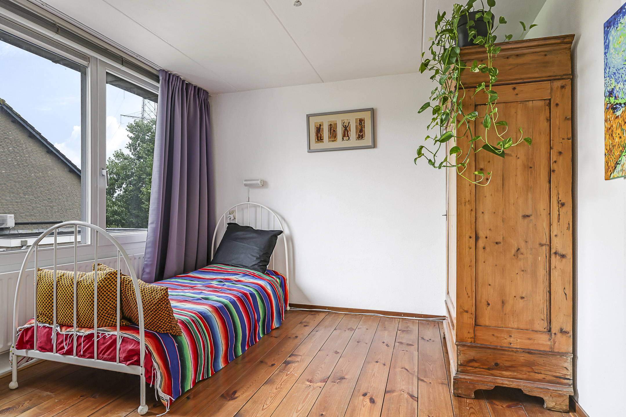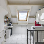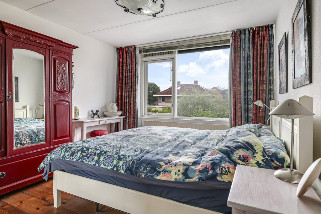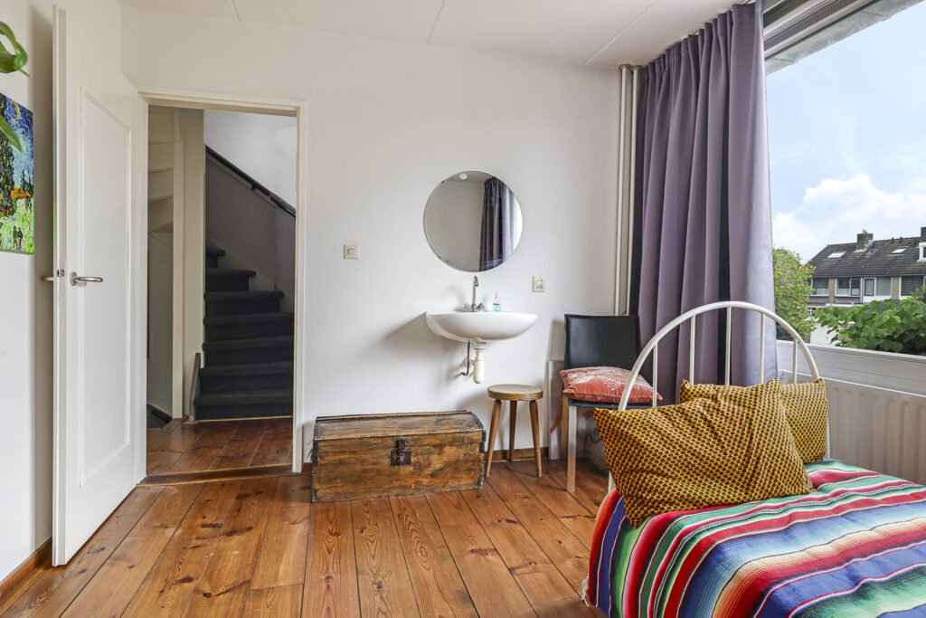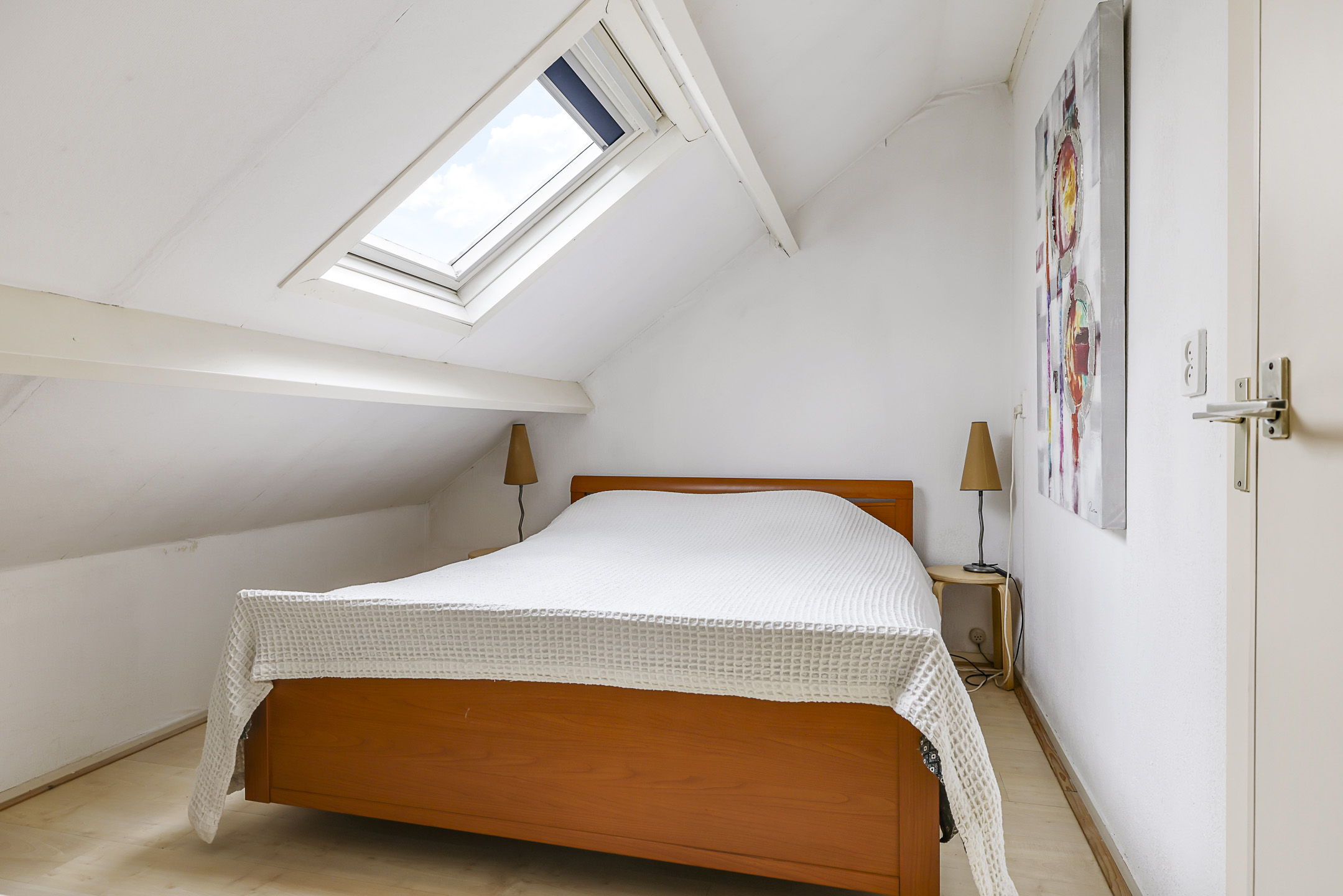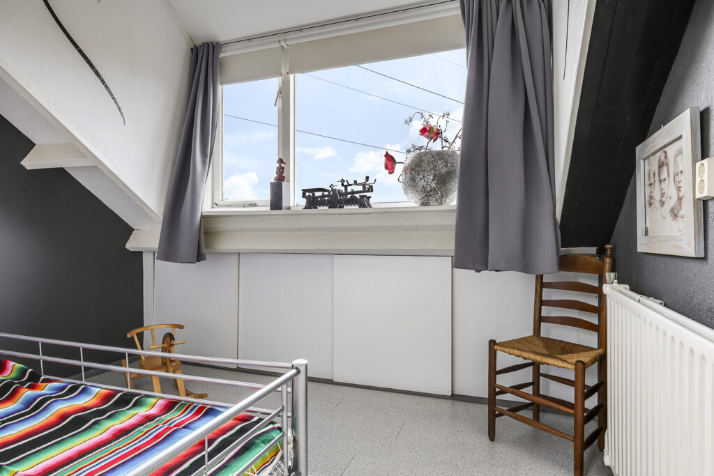 Een vaste trap brengt je naar de 2e verdieping. Opvallend is dat deze woning als enige in de straat een dakkapel met nokverhoging heeft toegepast. Dit zorgt voor nóg meer leefruimte en ruimtelijker gevoel. Deze woonlaag is opgedeeld in 2 kamers en een voorzolder. De voorzolder is ruim opgezet met een dakraam voor de nodige lichtinval, je treft hier onder meer de opstelling van de cv-ketel en de witgoedaansluitingen aan. Vanaf de voorzolder loop je de 1e kamer is, deze is aan de voorzijde gelegen en voorzien van een dakraam. Vanuit daar loop je door naar de 2e kamer, dit is de kamer waar de nokverhoging is toegepast. Dit heeft gezorgd voor een grote raampartij. Op deze kamer en de voorzolder is knieschot-opbergruimte aanwezig.