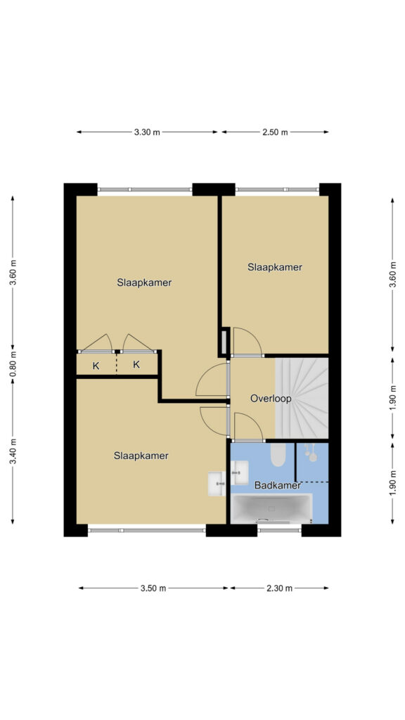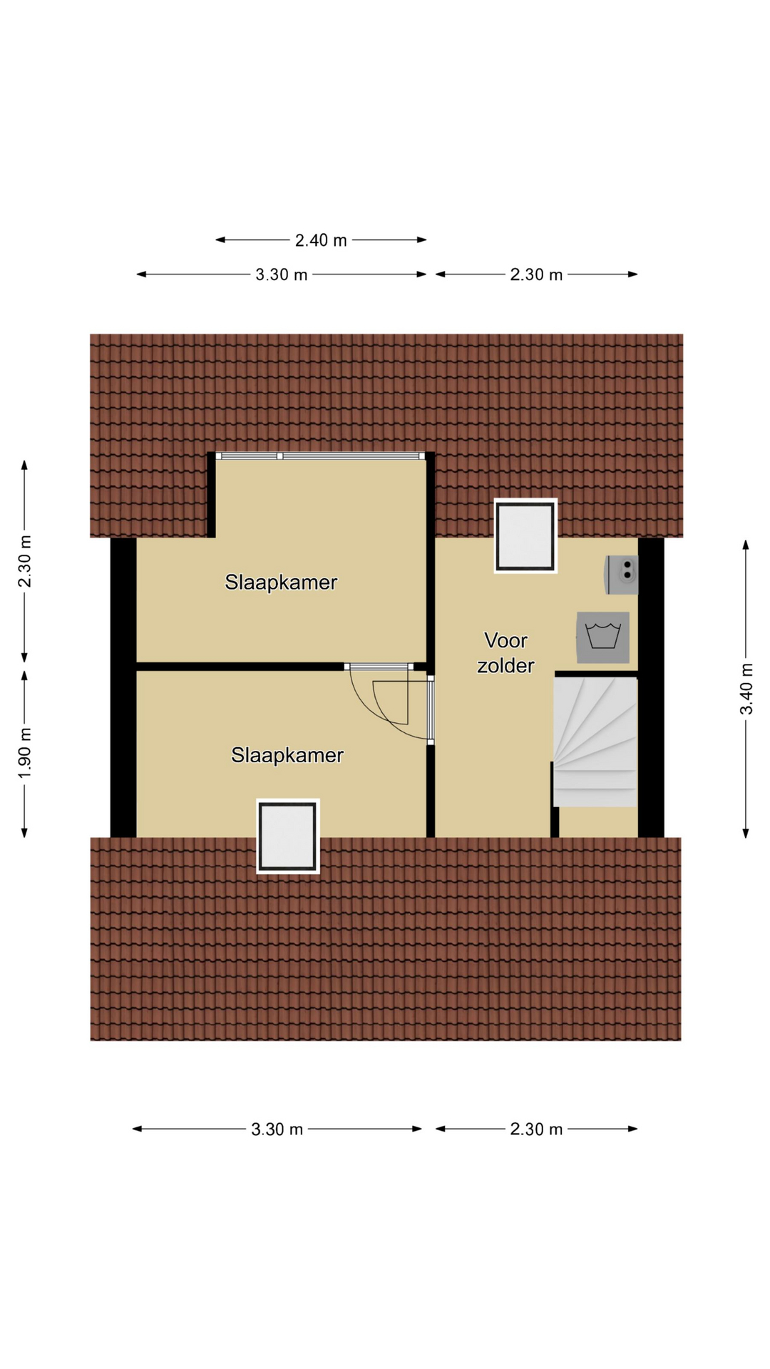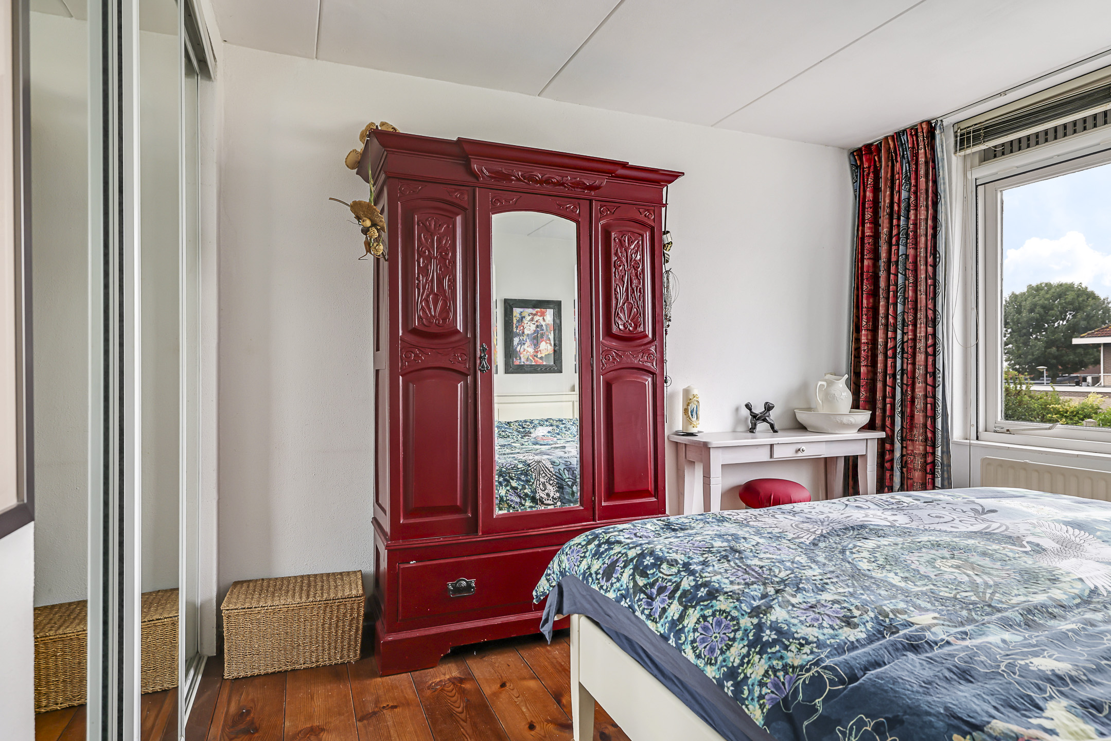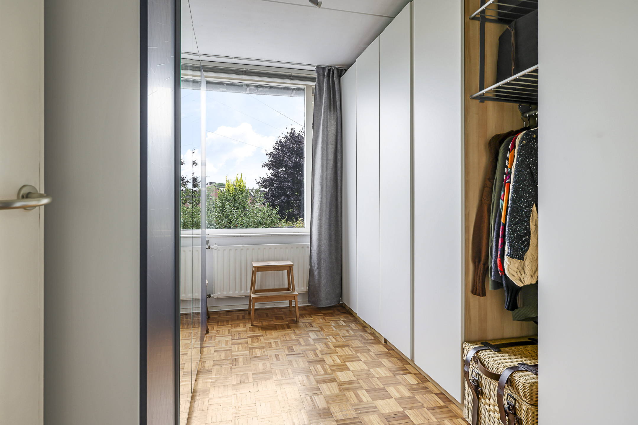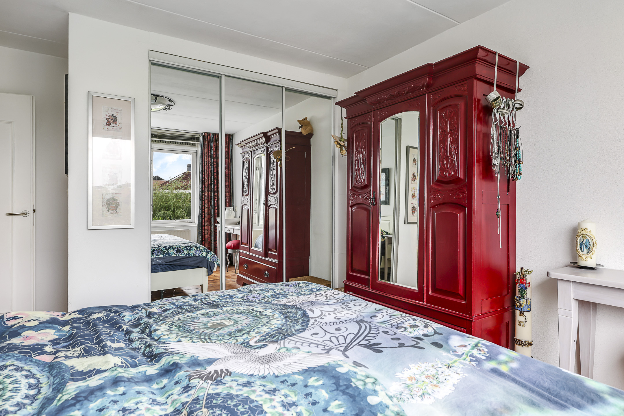 Een vaste trap brengt je naar de 2e verdieping. Opvallend is dat deze woning als enige in de straat een dakkapel met nokverhoging heeft toegepast. Dit zorgt voor nóg meer leefruimte en ruimtelijker gevoel. Deze woonlaag is opgedeeld in 2 kamers en een voorzolder. De voorzolder is ruim opgezet met een dakraam voor de nodige lichtinval, je treft hier onder meer de opstelling van de cv-ketel en de witgoedaansluitingen aan. Vanaf de voorzolder loop je de 1e kamer is, deze is aan de voorzijde gelegen en voorzien van een dakraam. Vanuit daar loop je door naar de 2e kamer, dit is de kamer waar de nokverhoging is toegepast. Dit heeft gezorgd voor een grote raampartij. Op deze kamer en de voorzolder is knieschot-opbergruimte aanwezig.