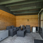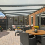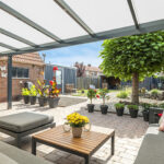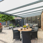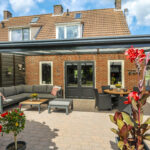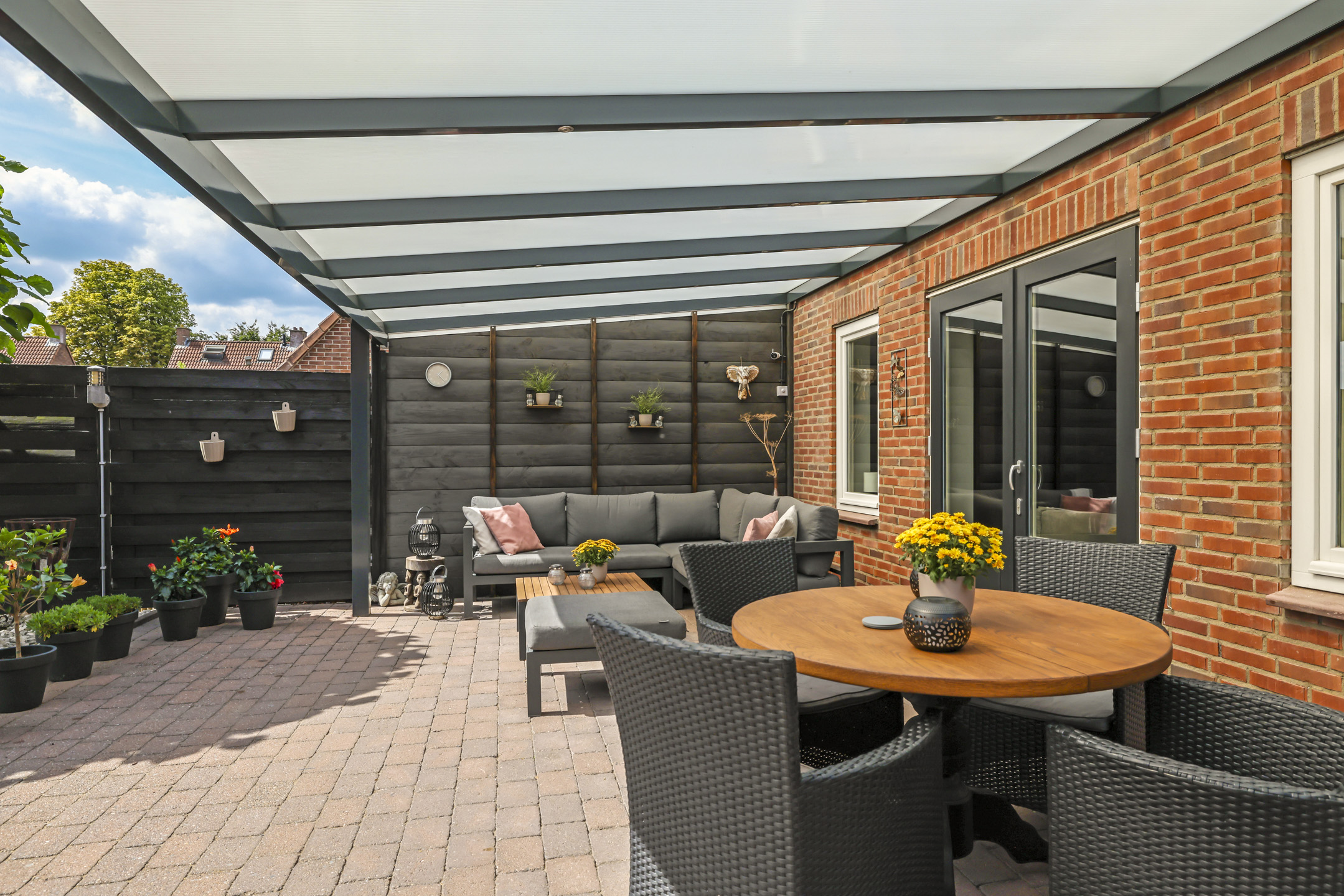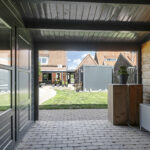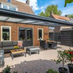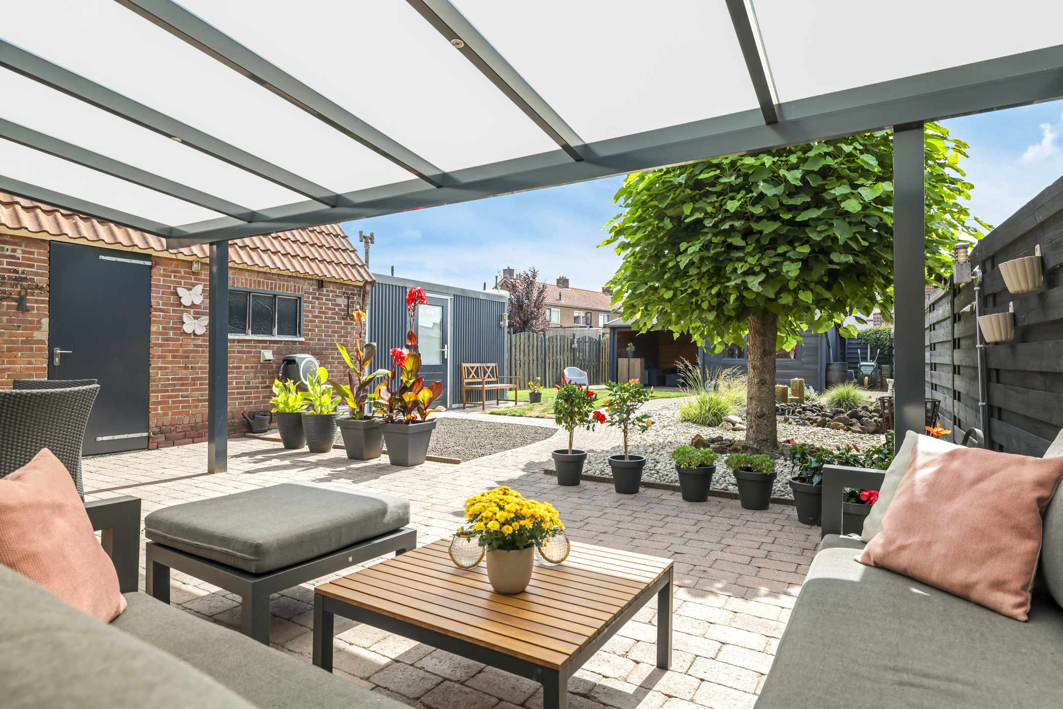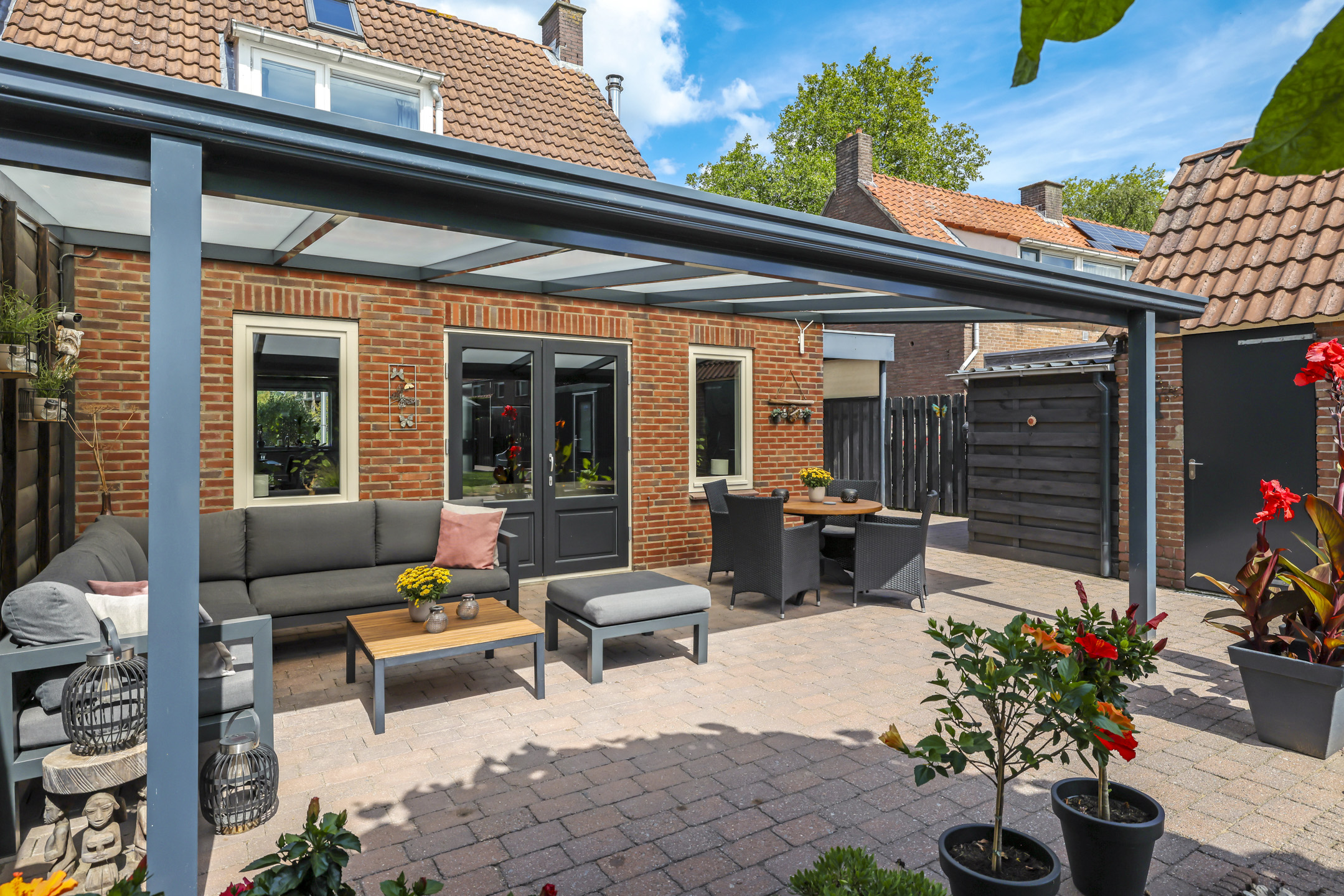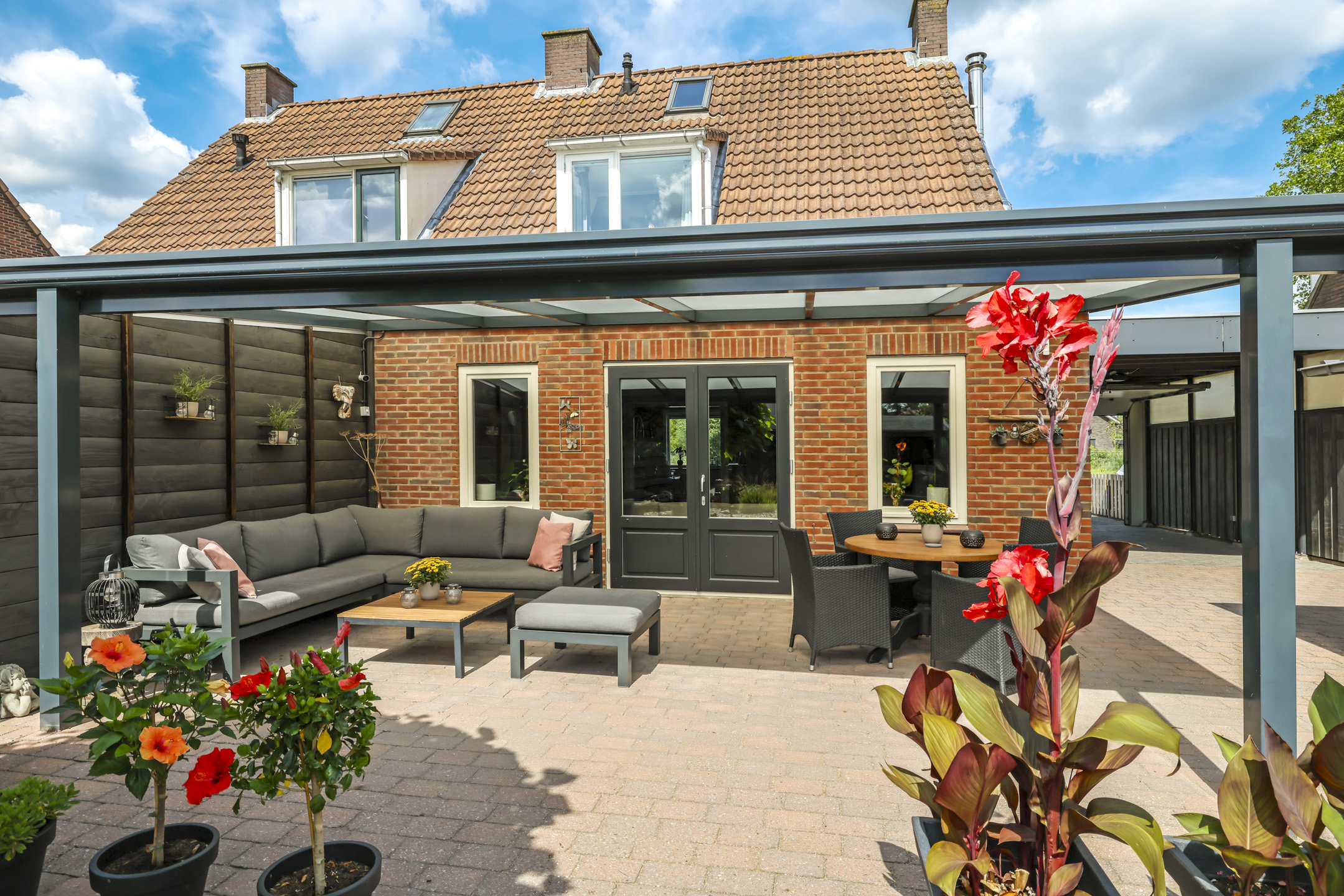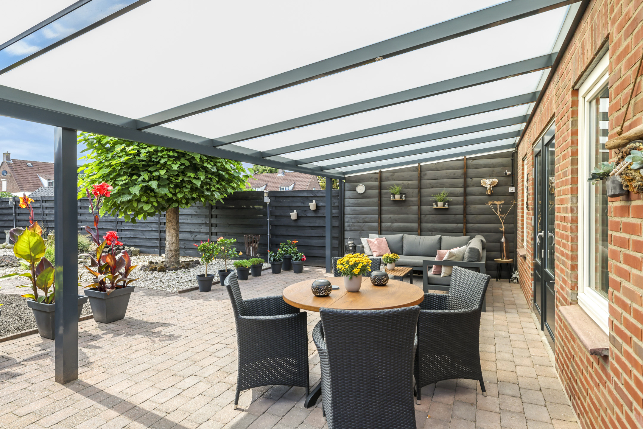 – Aluminium terrasoverkapping aan de woning, voorzien van spotverlichting