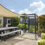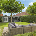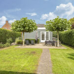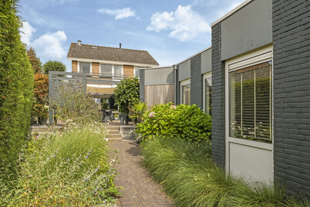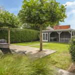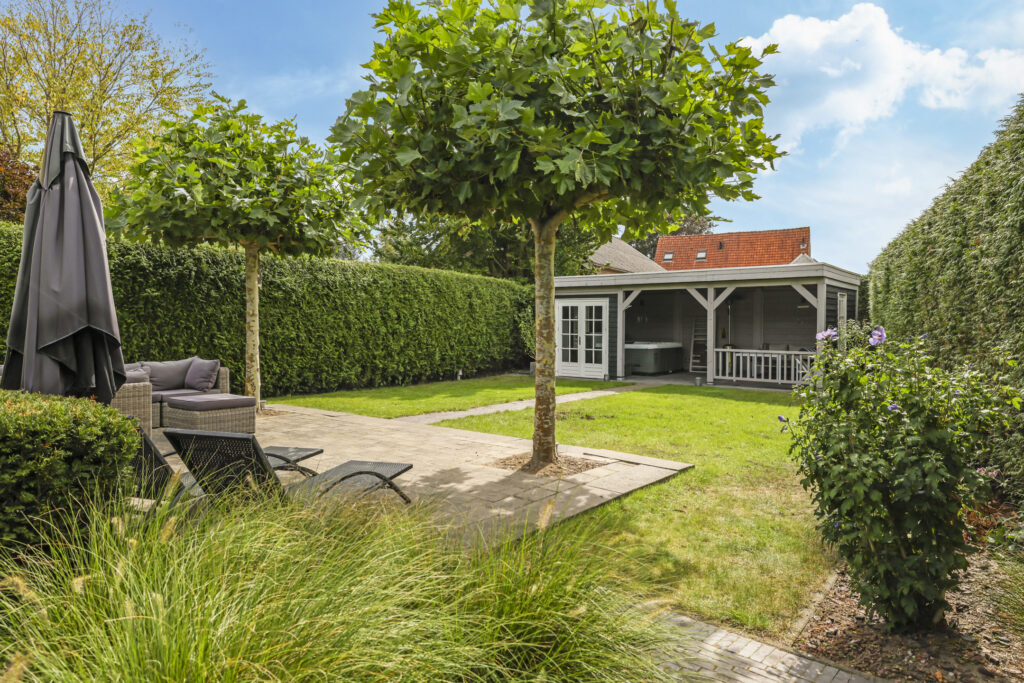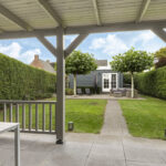 Deze woning staat ook in het teken van het buitenleven. De tuin is verzorgd aangelegd met verschillende terrassen, een gazon, meerdere terrassen en is groen omsloten middels hagen. Doordat ook de omliggende tuinen groot zijn, geniet je opvallend veel privacy in de achtertuin. Bovendien is de tuin pal op het zuiden georiënteerd waardoor je hier maximaal aantal zonuren geniet. En dat is fijn aangezien er meerdere terrassen zijn aangelegd waaronder bij de keuken. Dit terras is voorzien van een schaduwdoek waardoor je op een warme zomerdag toch buiten kunt zitten. En mocht je een hond hebben, dan is het handig om te weten dat de achtertuin af te sluiten is (ook voor het achterste gedeelte van de tuin). In de hagen op de erfgrens is eveneens gaaswerk aangebracht waardoor ontsnappen onmogelijk is.