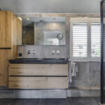 De keukenopstelling is bijzonder uitgebreid (6,6 meter lang) en biedt naast veel kastruimte ook plek aan verschillende inbouwapparatuur. Denk daarbij aan een breed 6-pits fornuis met grote oven, een afzuigschouw erboven, een vaatwasser en een grote koelkast. Noemenswaardig is het dikke werkblad dat in composiet (natuursteen) is uitgevoerd. Dit geeft de keuken een luxe uitstraling. Inbouwspots en een brede, houten wandplank maken het plaatje compleet. Zowel de keuken als de woonkamer zijn voorzien van vloerverwarming.