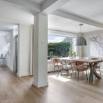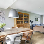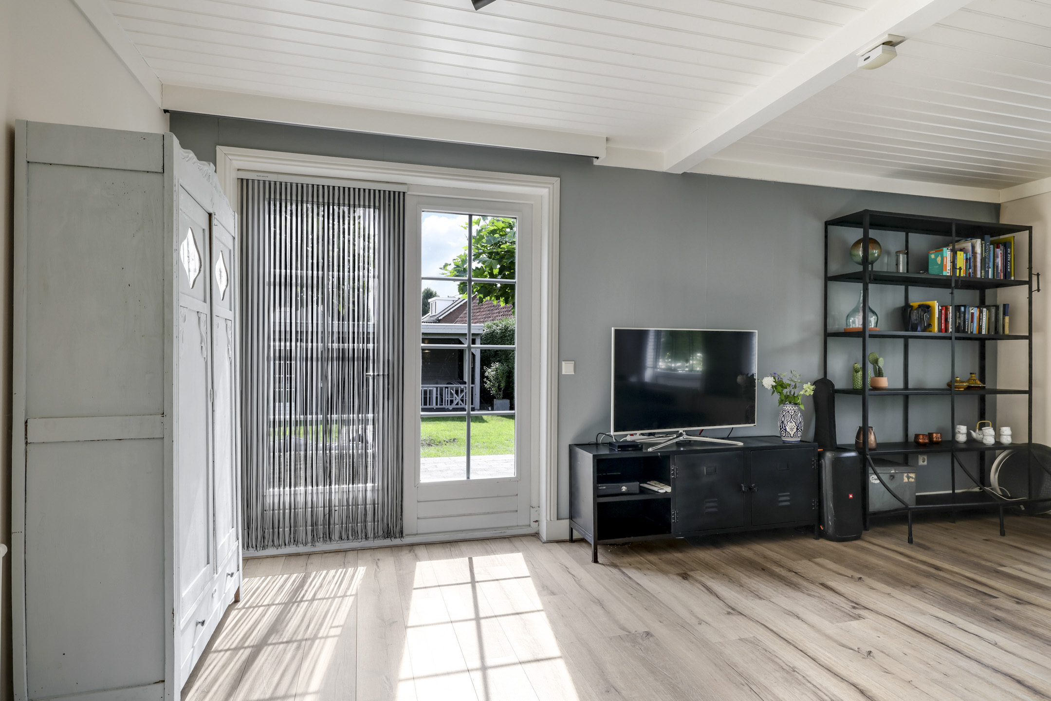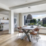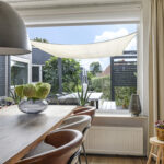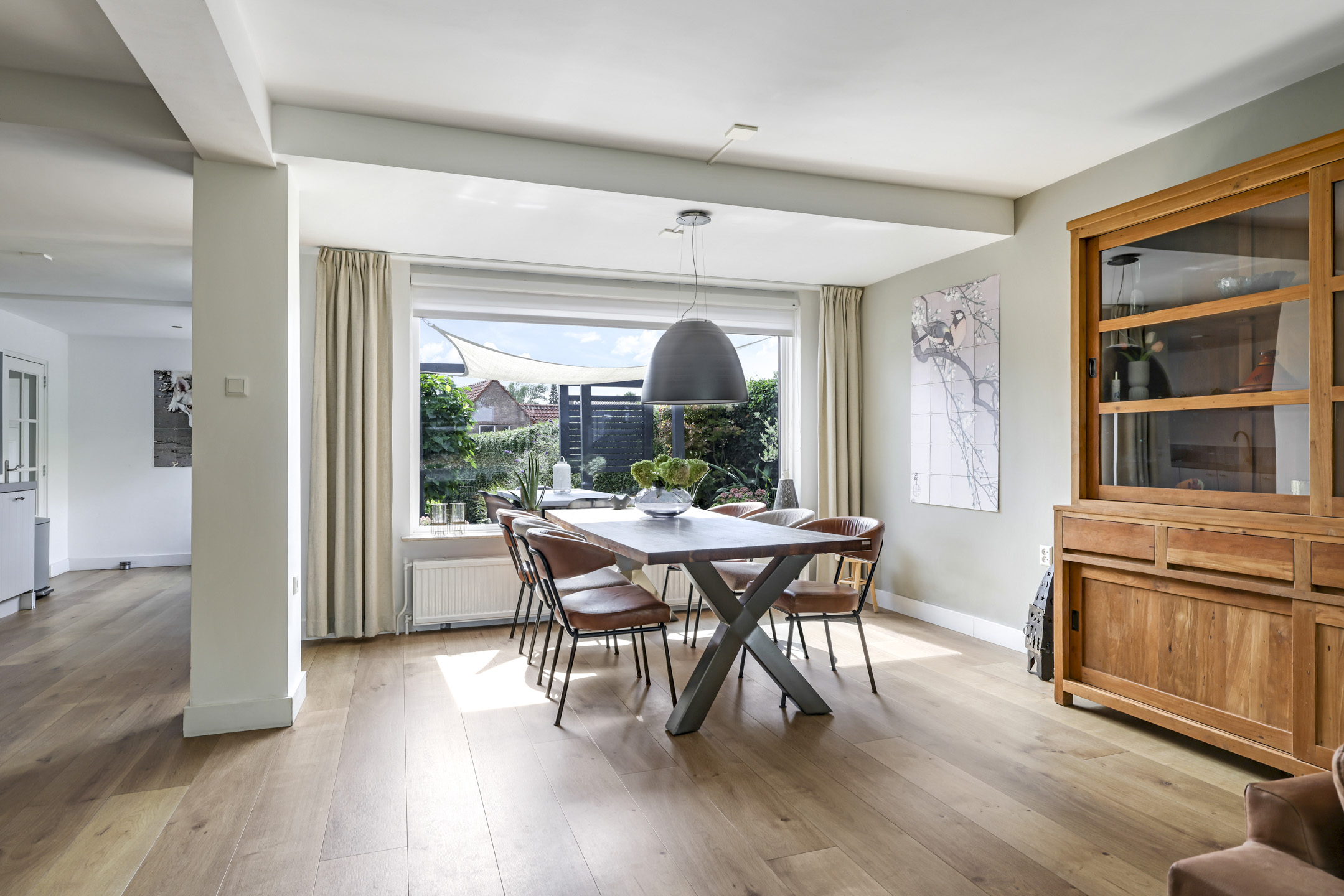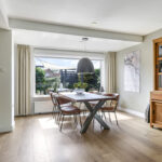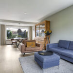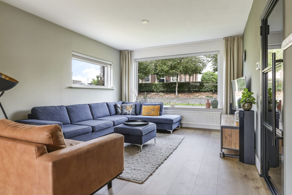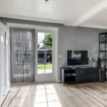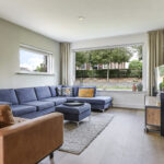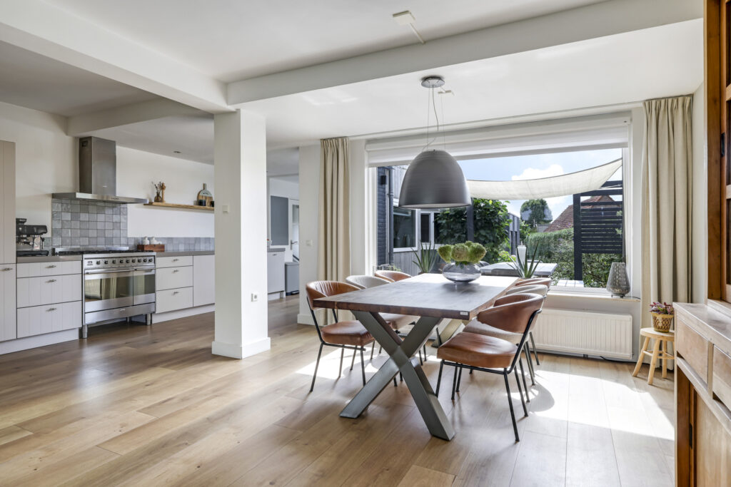 Vanuit de ruime hal/entree verleent een stijlvolle tussendeur toegang tot de woonkamer. Wat hier meteen opvalt is de prettige woonsfeer die wordt gecreëerd door grote ramen, veel lichtinval en een fraaie aankleding met mooie meubels. De beukmaat (breedtemaat) van deze woning is met 6,5 meter veel breder dan gemiddeld hetgeen je ook merkt in de woonkamer. Je kunt hier namelijk met gemak een grote hoekbank en een lange eettafel kwijt. Dit komt ook doordat de woonkamer aan de achterzijde een stuk is uitgebouwd. Het plafond heeft een aangename hoogte hetgeen het ruimtelijke gevoel versterkt. De ramen zijn gunstig op de zon georiënteerd en bieden vrij zicht in de voor- en achtertuin. Wanneer het echt warm wordt, zijn de ramen af te sluiten middels (elektrisch bedienbare) rolluiken.