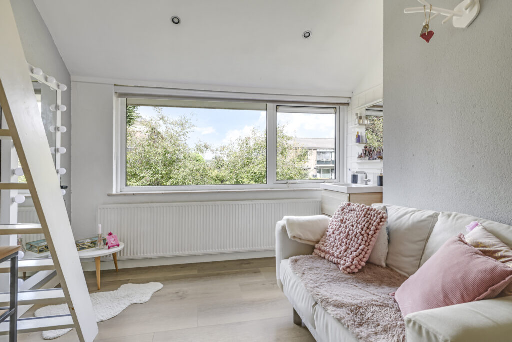 De grootste kamer is aan het einde van de gang gelegen. Deze kamer is ca. 22m2 groot en voelt vanwege het grote formaat meer aan als een woonkamer. Bovendien bieden dubbele deuren direct toegang tot het buitenterras. Maar mocht je nog steeds een slaapkamer te kort komen, dan zou ook deze kamer prima op te delen zijn in 2 afzonderlijke slaapkamers.