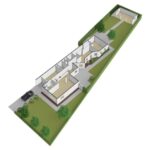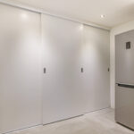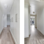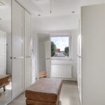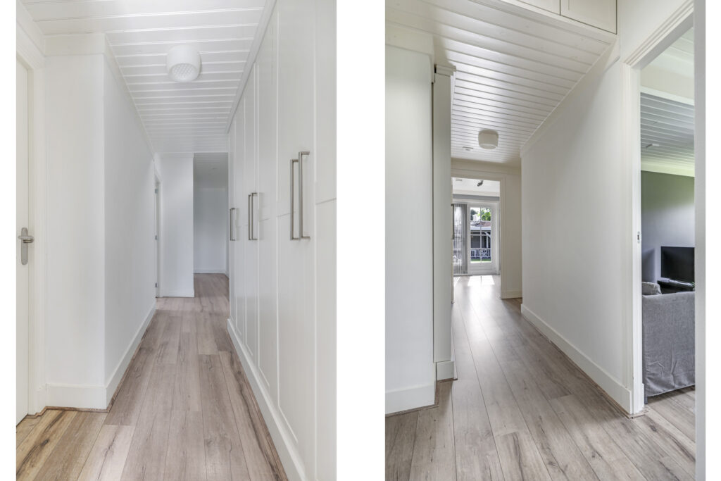 Speels detail zijn de 3 traptreden naar beneden waarbij je het achterhuis binnen loopt. Ook de schuine hoeken in de gevels maken de aanbouw zeker niet standaard. Het is verrassend hoe ver de gang doorloopt naar achteren. Je komt als eerste een (tweede) badkamer tegen die is ingedeeld met een inloopdouche en een 2-persoons wastafelmeubel. Groot pluspunt is dat het toilet apart naast de badkamer in de hal is gelegen. Wanneer we in de gang doorlopen, treffen we aan de rechterzijde een grote (slaap)kamer. Indien gewenst zou je deze kamer eenvoudig kunnen opdelen in 2 afzonderlijke slaapkamers. Even verder in de gang komen we een 3-dubbele vaste kastenwand tegen. Deze kastenwand zou je kunnen gebruiken als linnenkasten waardoor je op de slaapkamer(s) geen kast hoeft te plaatsen en meer ruimte overhoudt.