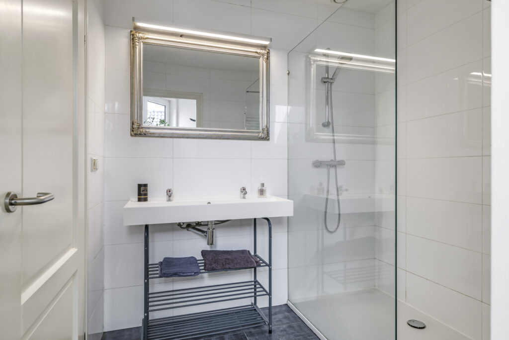 De badkamer is nog relatief nieuw en dat zie je direct. Er is gekozen voor trendy sanitair zoals een breed 2-persoons wastafelmeubel, een grote inloopdouche met glaswanden en een zwevend wandcloset. Inbouwspots (net als op de slaapkamers) en verzorgd tegelwerk maken de badkamer compleet. En niet te vergeten het aanwezige draai/kiepraam waardoor de badkamer prima te ventileren is.