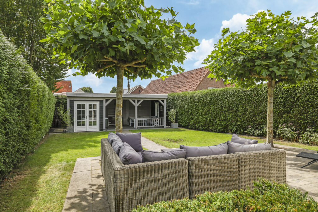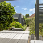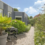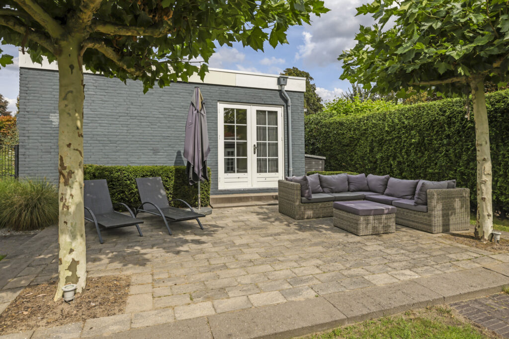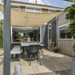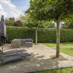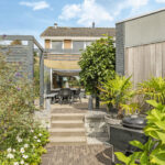 Je zou kunnen zeggen dat de achtertuin is opgedeeld in 2 gedeeltes, het terras bij de hoofdwoning en de achtertuin dat grenst aan het achterhuis. Hierdoor zou je de tuin ook prima kunnen opdelen wanneer er sprake is van dubbele bewoning. Echter, het grootste gedeelte van de tuin ligt dus achterin (de laatste 19 meter) waarbij je optimale vrijheid en privacy geniet. Hier is een 2e terras aangelegd waarbij dakplatanen voor de nodige schaduw zorgen. Het gazon biedt hier volop mogelijkheden voor speeltoestellen zoals een trampoline en/of een schommel.
