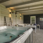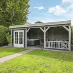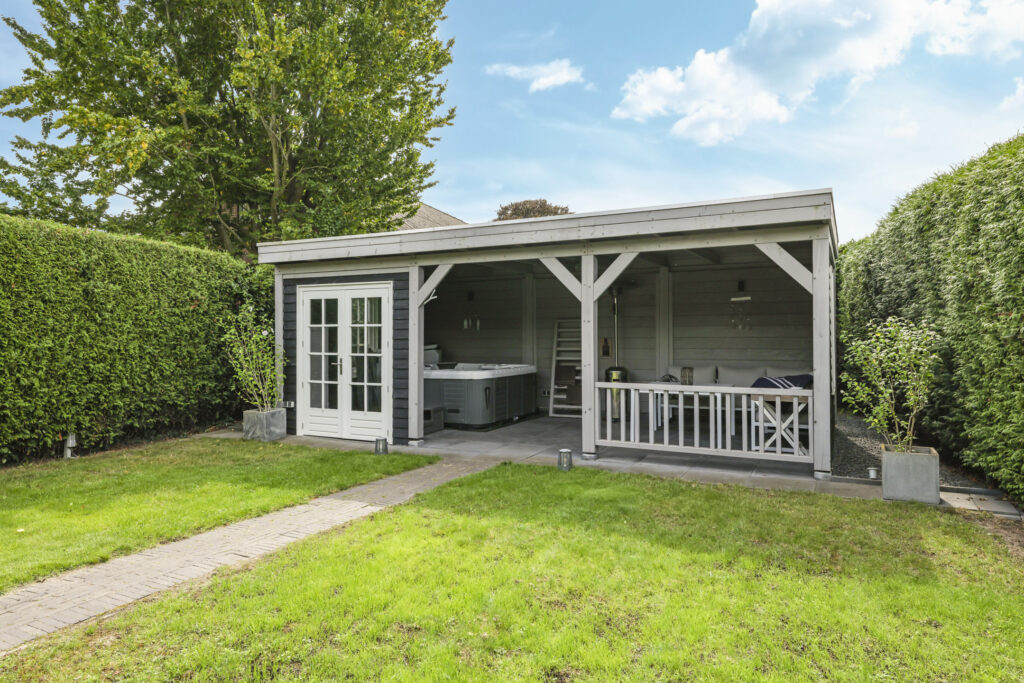 Helemaal achterin de tuin staat een stijlvol gebouwde veranda. Deze is 7 meter breed en 4 meter diep en biedt daardoor meer dan voldoende ruimte voor een loungebank en een tuinset. De huidige eigenaren hebben hier een jacuzzi staan. De veranda is voorzien van een eigen groepenverdeelkast. Overigens zijn er door de gehele tuin diverse contactdozen te vinden, evenals grondspots die de aanwezige bomen in het donker sfeervol belichten.