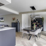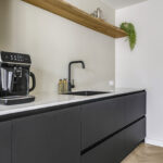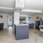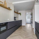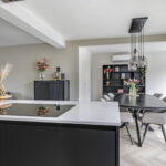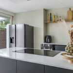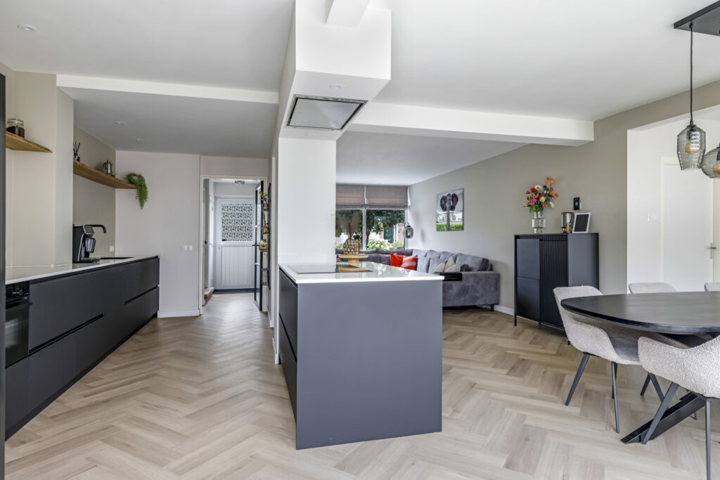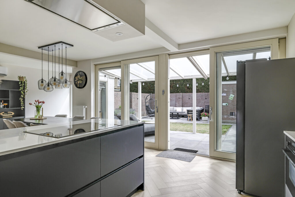 Dit is dé eyecatcher van deze woning. Oorspronkelijk was de keuken van deze woning veel kleiner, echter er door de uitbouw veel meer leefruimte ontstaan waar dan ook dankbaar gebruik van is gemaakt. Er is in 2023 gekozen voor een riante keuken mét een kookeiland. Werkruimte kom je hier niet tekort door het lange aanrechtblad en met de stijlvolle zwarte fronten is de keuken helemaal van deze tijd. Achter deze fronten bevinden zich veel lades wat zorgt voor veel praktische bergruimte. De inbouwapparatuur bestaat uit een 5-pits inductiekookplaat, een afzuigkap, een vaatwasser en een combi-oven/magnetron. De Amerikaanse koel/vriescombinatie wordt ter overname aangeboden.