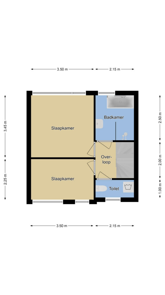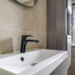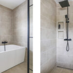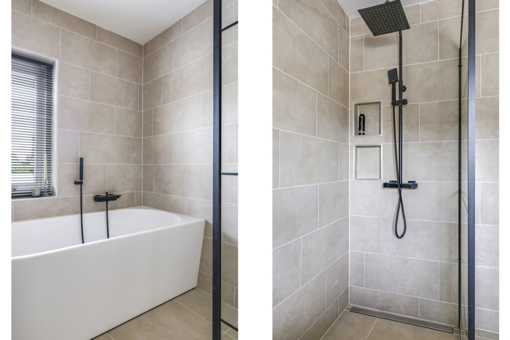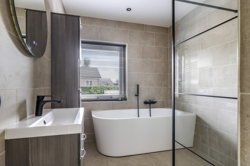 Origineel heeft deze woning een kleine, beperkte badkamer. Echter is bij deze woning de hele situatie veranderd waarbij er een slaapkamer is opgeofferd voor een royale badkamer. Zoals je kan verwachten met een badkamer uit 2023 is de badkamer helemaal geplaatst volgens de laatste trends. Een groot pluspunt is daarbij het stijlvolle, half-vrijstaande ligbad. De badkamer is verder ingedeeld met een ruime inloopdouche en een wastafelmeubel en een bijpassende kolomkast. De zwarte details zijn helemaal van de laatste trends. De ruimte is geheel betegeld en in de douche zijn praktische nisjes gemaakt voor de douchespullen. Een groot raam zorgt voor lichtinval en een ventilatiemogelijkheid.