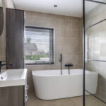 Badkamer met half vrijstaand ligbad, inloopdouche en wastafelmeubel
