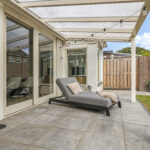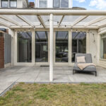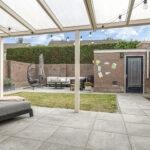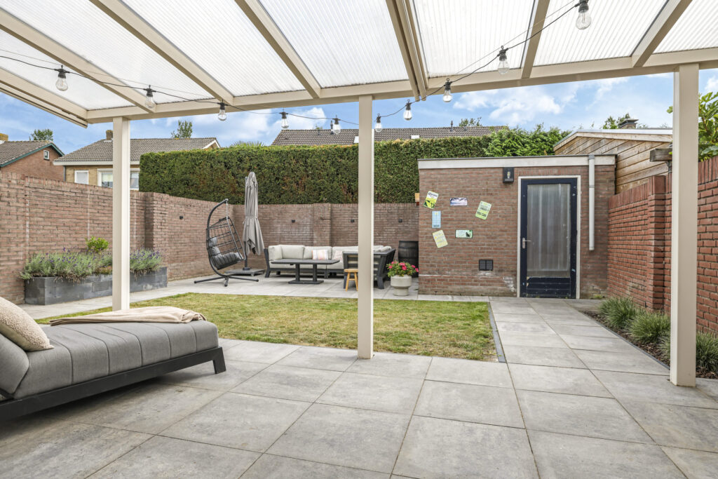 Als je graag van de zon geniet dat is dit een perfecte achtertuin voor jou. Door de ligging pal op het zuiden geniet je hier de gehele dag van de zon. Ondanks de uitbouw blijft er nog een diepe achtertuin over. Geen wonder dat er dan ook gekozen is om 2 ruime terrassen te creëren. Een terras is direct aan de woning gelegen en is overkapt met een aluminium terrasoverkapping. Onder deze overkapping is zonwering aangebracht waardoor schaduw kan creëren op een warme zomerdag. Groot formaat tegels zorgen voor een moderne uitstraling en diverse borders met planten en gras zorgen voor een groen aangezicht. Achter in de tuin staat nog een stenen berging van ca. 9m² groot. Aan de zijkant is nog een achterom aanwezig.