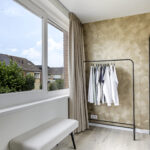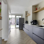 De voormalige garage is bij de woning betrokken. Naast een grotere woonkamer heeft zit ook gezorgd voor een bijkeuken. Dit is een praktische ruimte waar je bijvoorbeeld de voorraad, of een extra koelkast en vriezer in kwijt kan. De bijkeuken heeft tevens een doorloop naar de garage waardoor je hier bijvoorbeeld ook de schoenen en jassen fijn uit het zicht stalt.