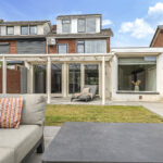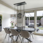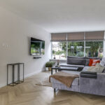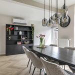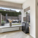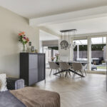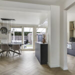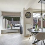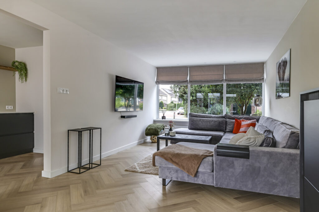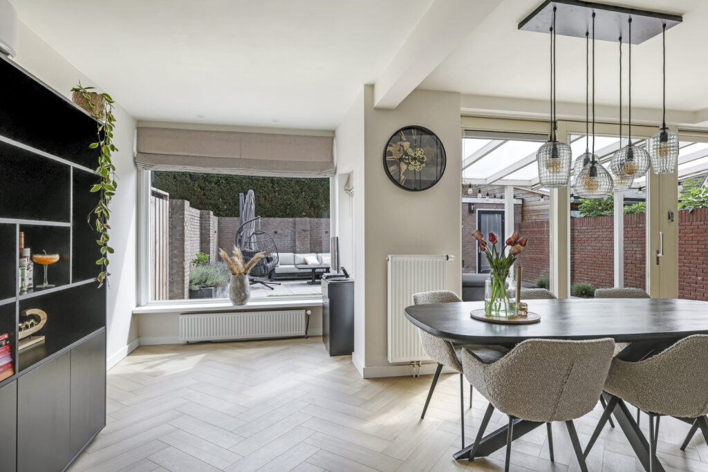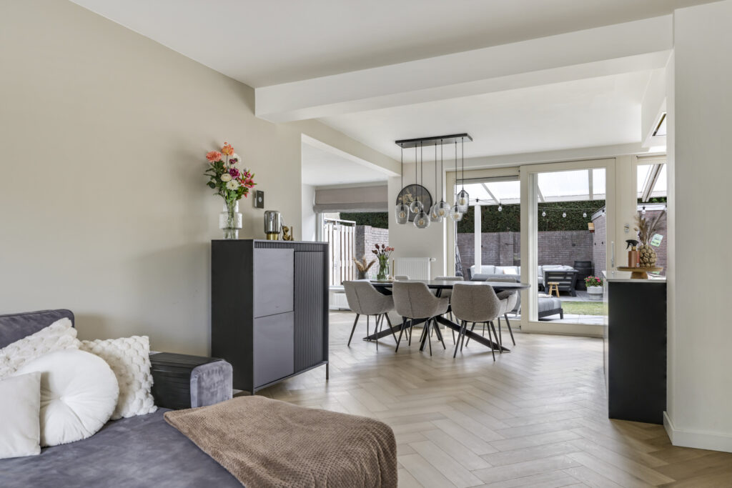 Van de originele woning is op deze woonlaag bijna niets meer terug te zien. De woonkamer is aan de achterzijde uitgebouwd én de garage is bij de woning betrokken. Dit heeft gezorgd voor enorm veel leefruimte en een begane grond van bijna 70m²! Deze woonlaag is modern afgewerkt met een visgraatvloer en een zwartstalen deur tussen de hal en de woonkamer. Opvallend is de hoeveelheid glas die in zowel de voor- als achtergevel aanwezig is. Dit zorgt voor enorm veel lichtinval en bovendien zet je in de zomerdag beide schuifpuien open om zo het binnen- en buitenleven bij elkaar te betrekken. Tevens is er airco aanwezig waardoor de woonkamer het gehele jaar door een behaaglijke temperatuur heeft.