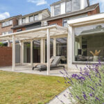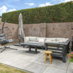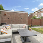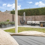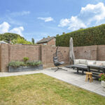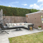 Stijlvol aangelegd tuin met groot formaat tegels en 2 terrassen
