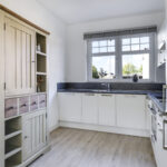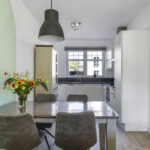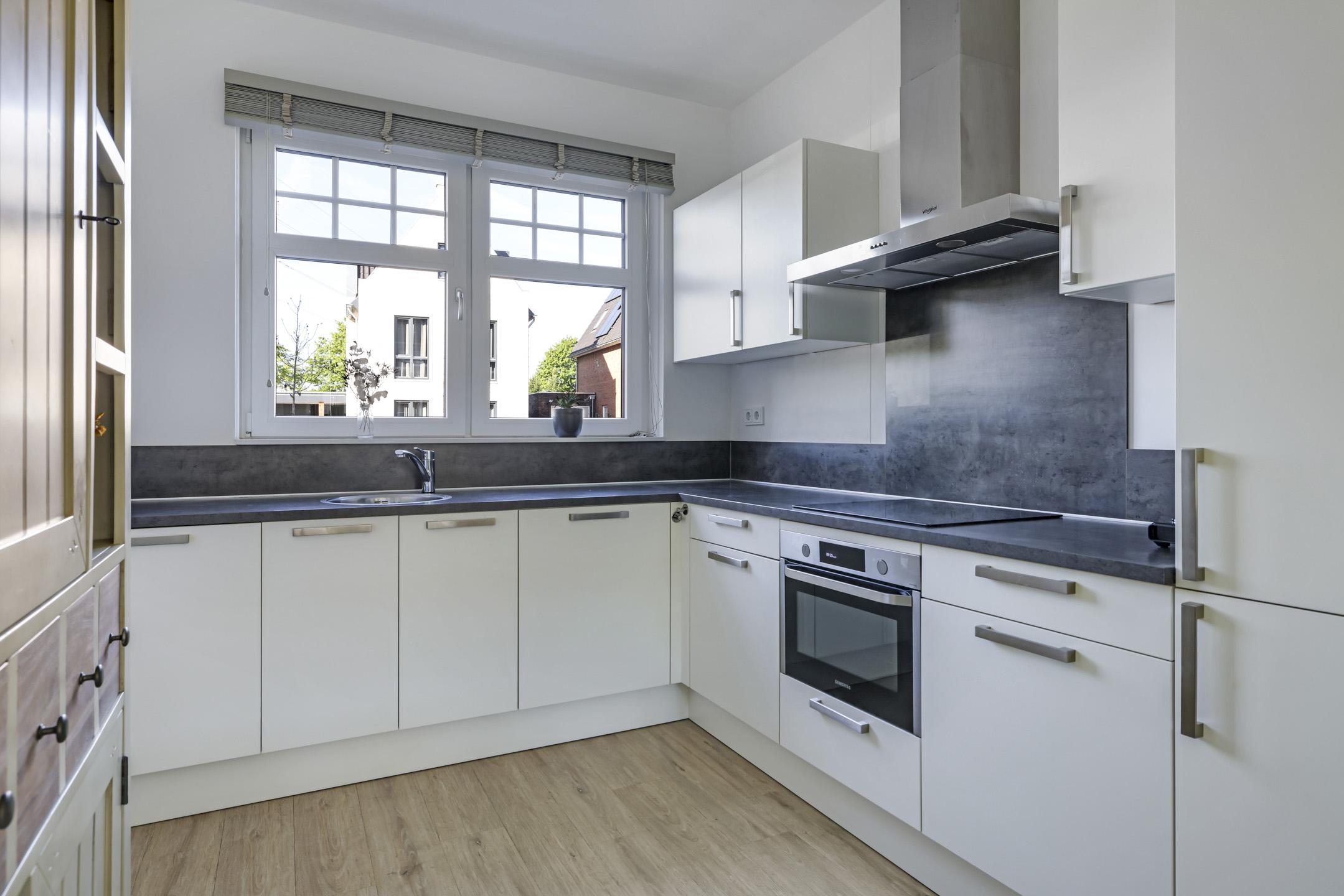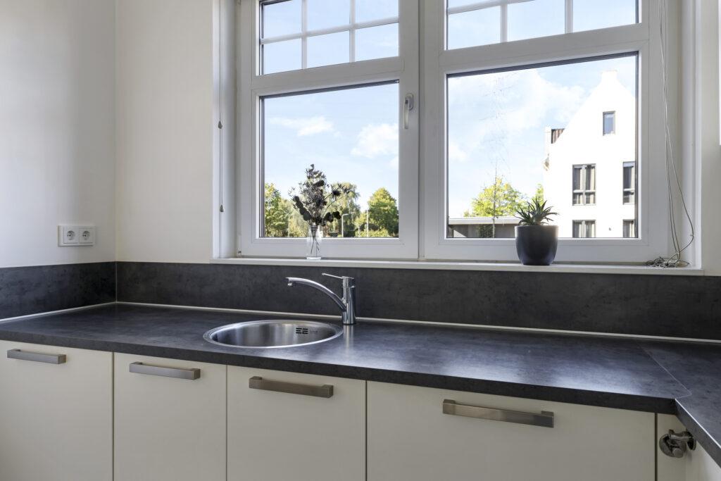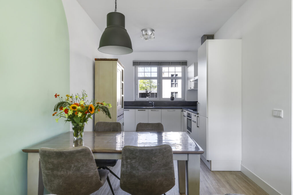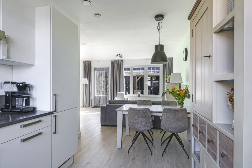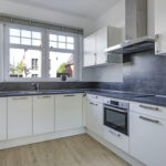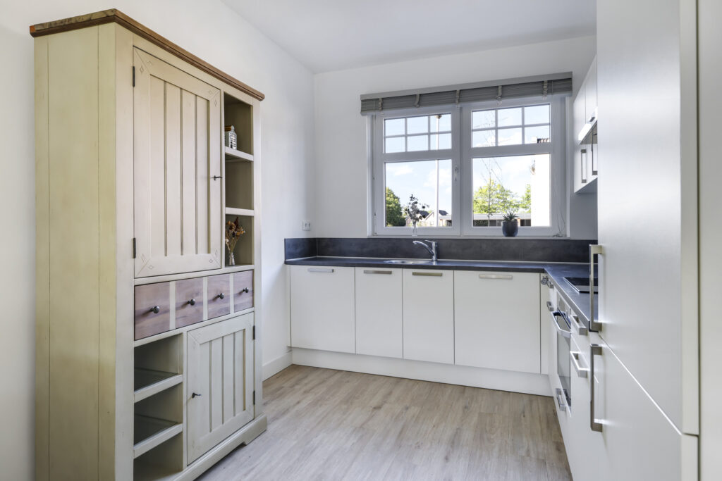 De keuken is aan de voorzijde gelegen en heeft een open karakter met de woonkamer hetgeen het ruimtelijke gevoel versterkt. De keuken is in een hoekopstelling geplaatst en voorzien van alle wenselijke inbouwapparatuur. Daarbij moet je denken aan een vaatwasser, een koel/vriescombi, een combi-oven/magnetron en een 4-pits inductie kookplaat met erboven een afzuigschouw. Verder heeft de keuken een klassieke kleurstelling met o.a. witte fronten en een antracietkleurig werkblad.