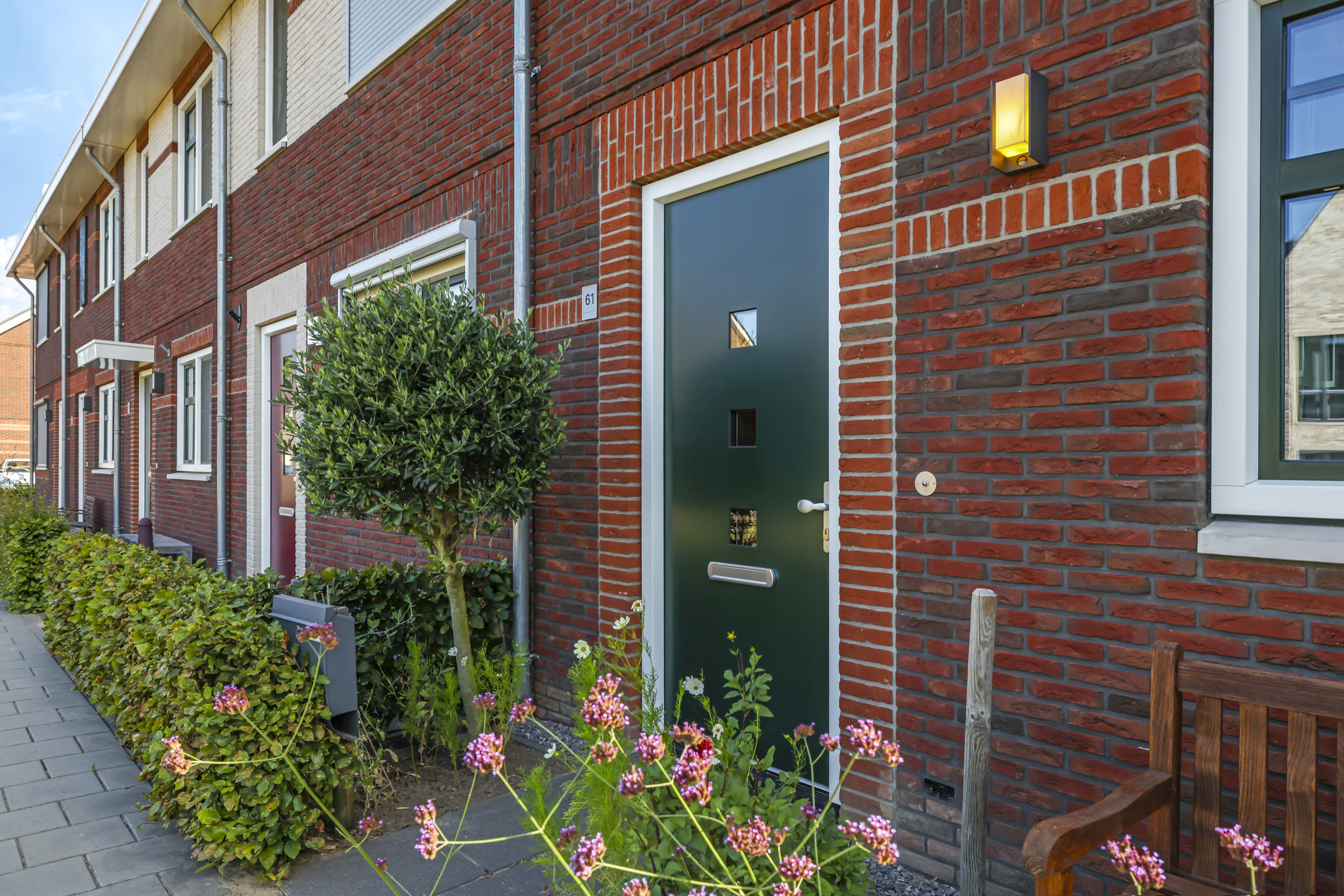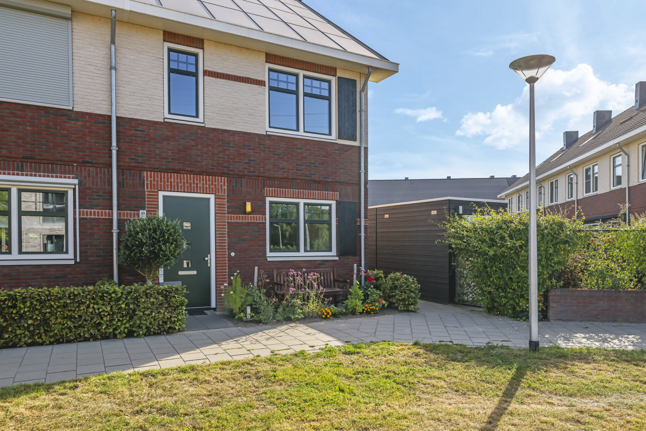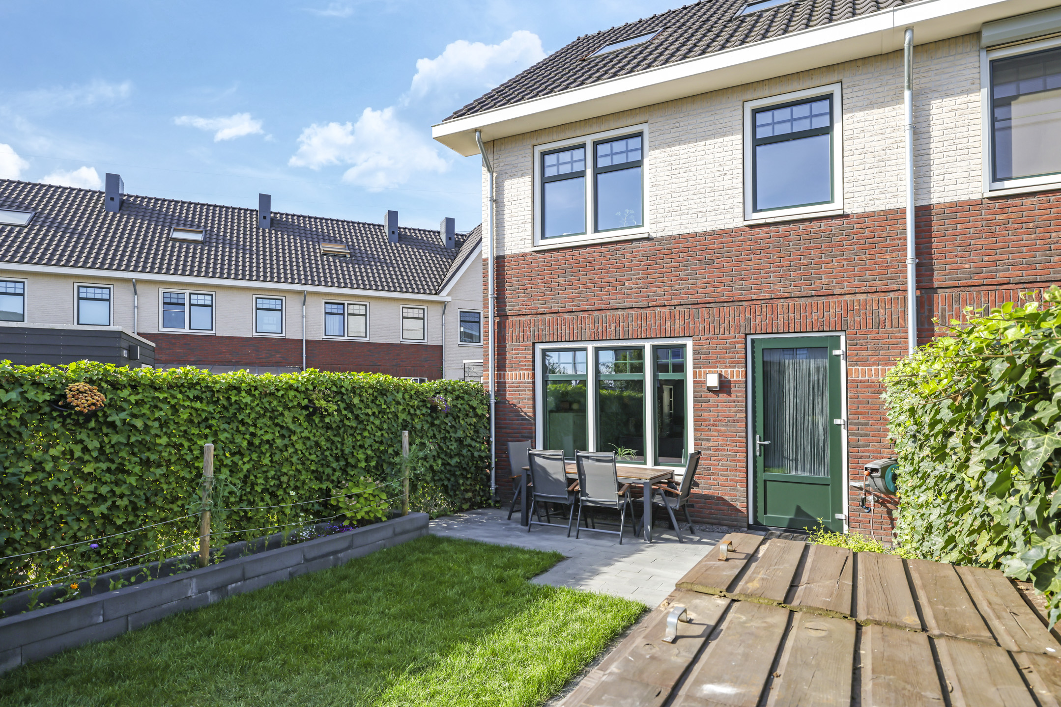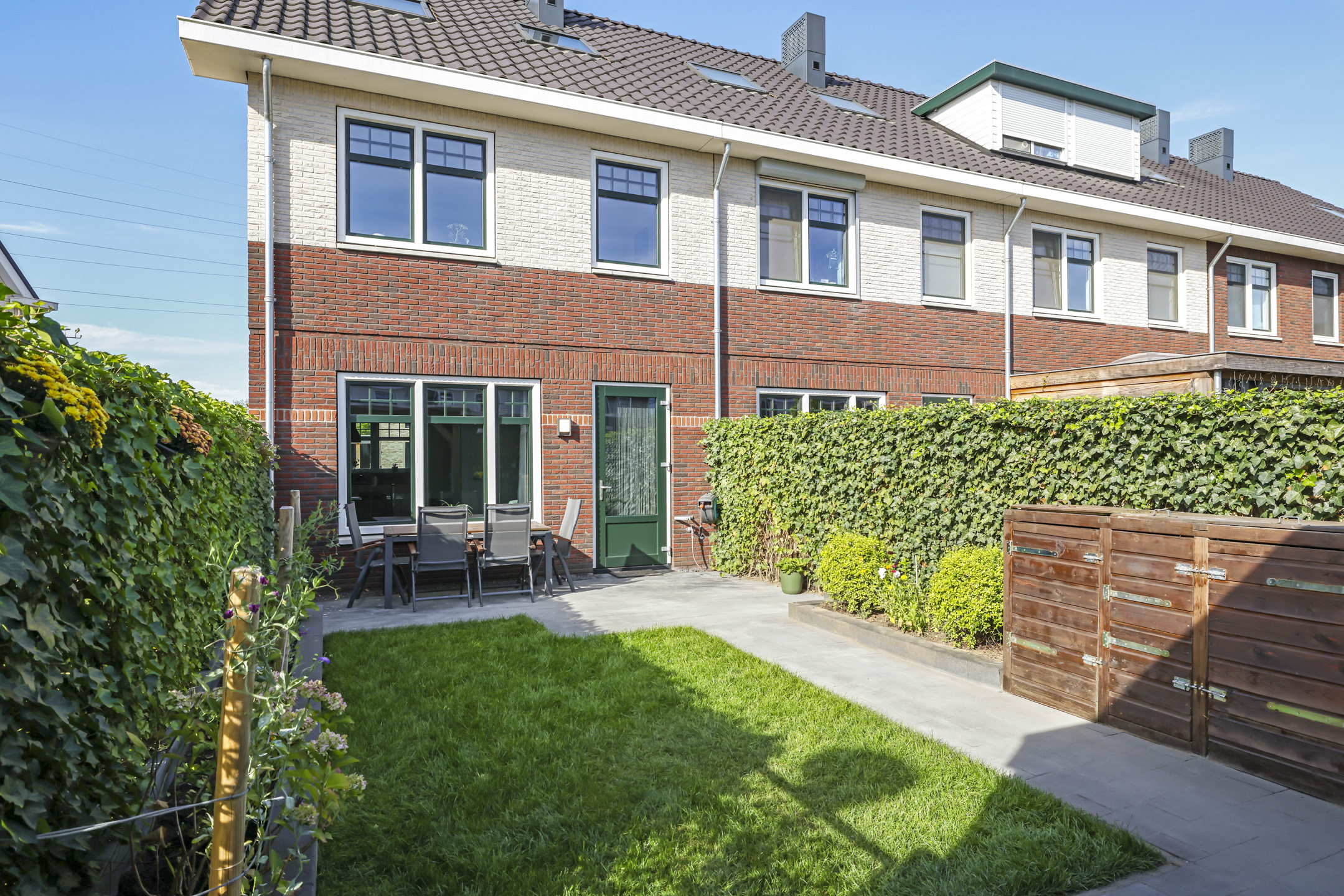 De achtertuin is overzichtelijk aangelegd met een terras, een gazon en achterin staat een schuur van 6m² groot met ernaast een stijlvolle veranda. Een poort (achterom) geeft toegang tot het zijpad naast de woning.