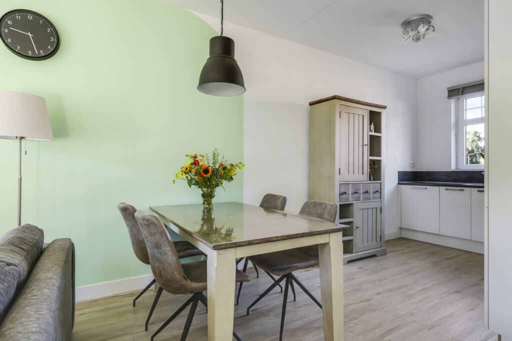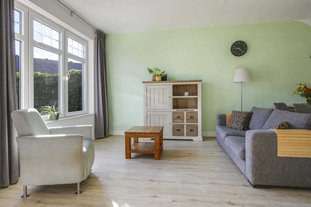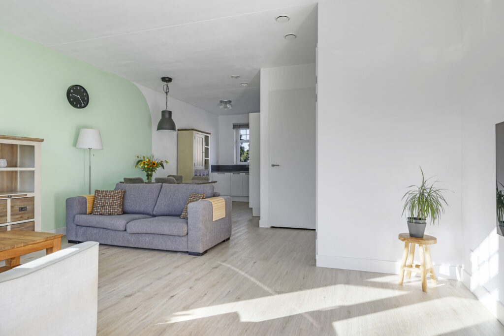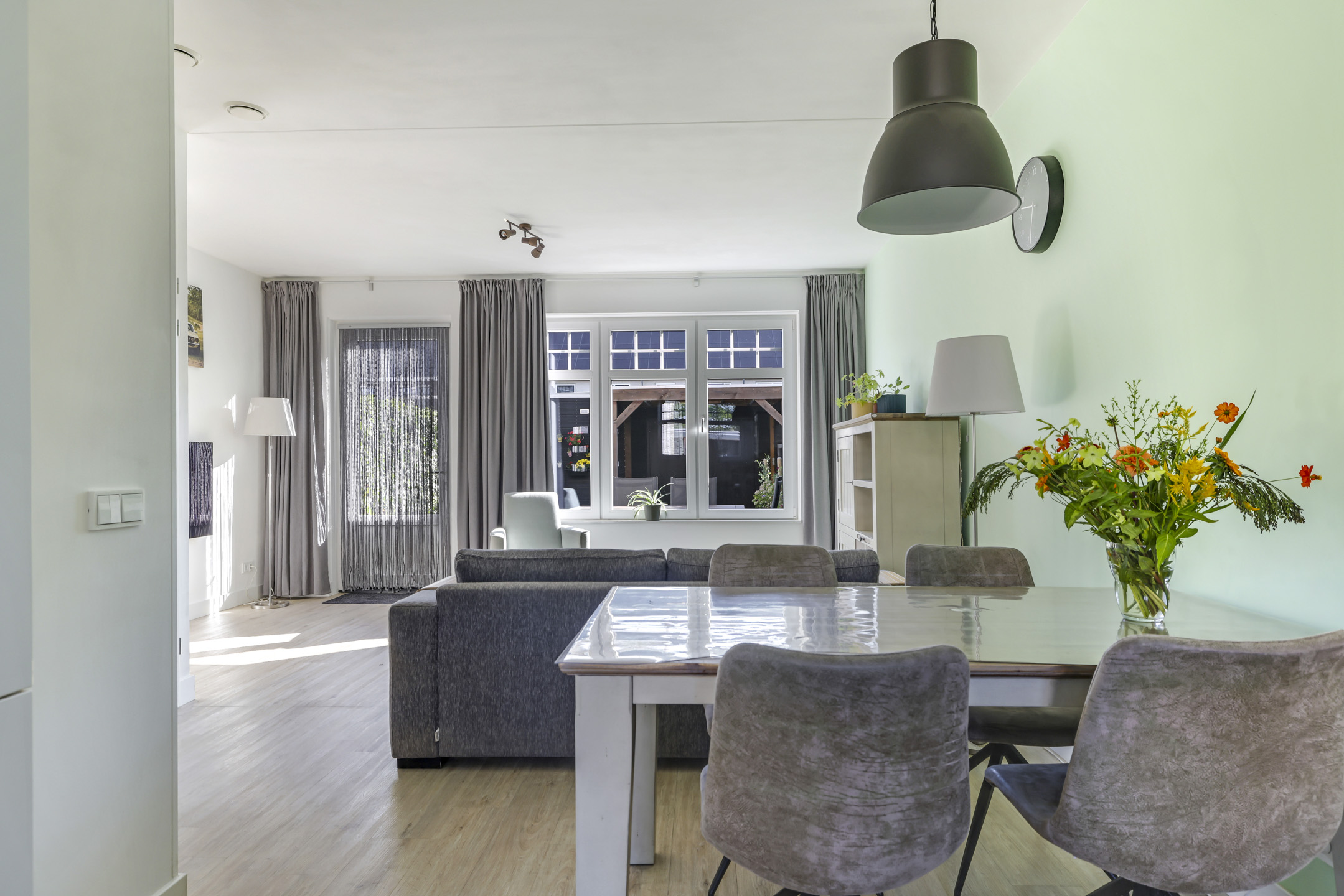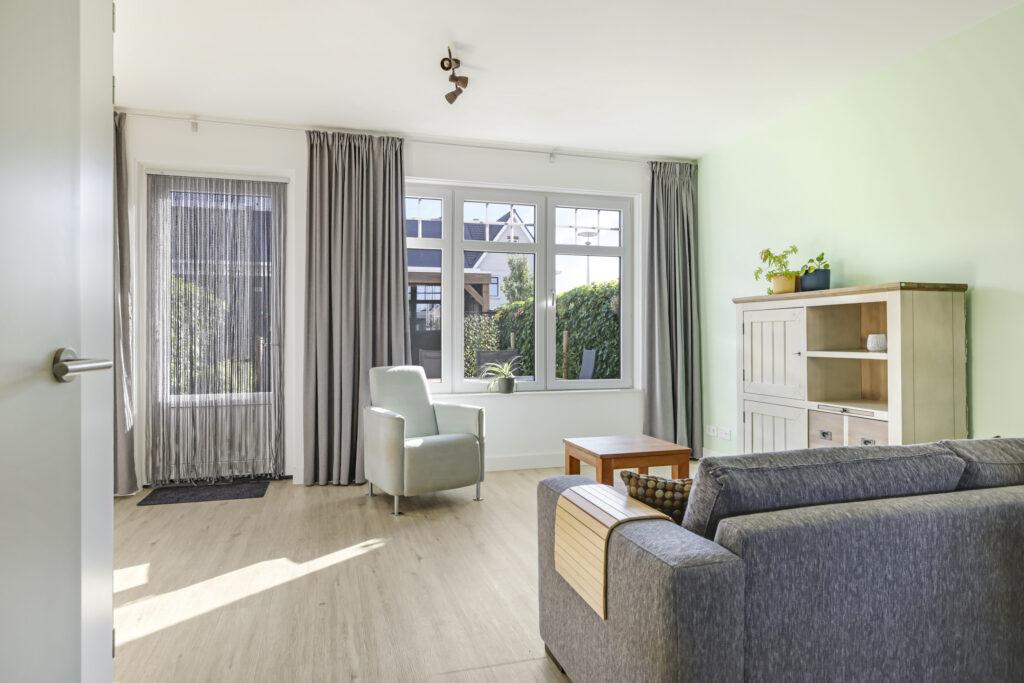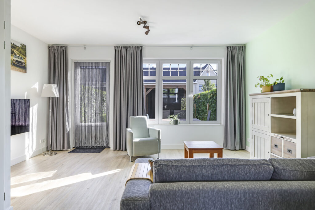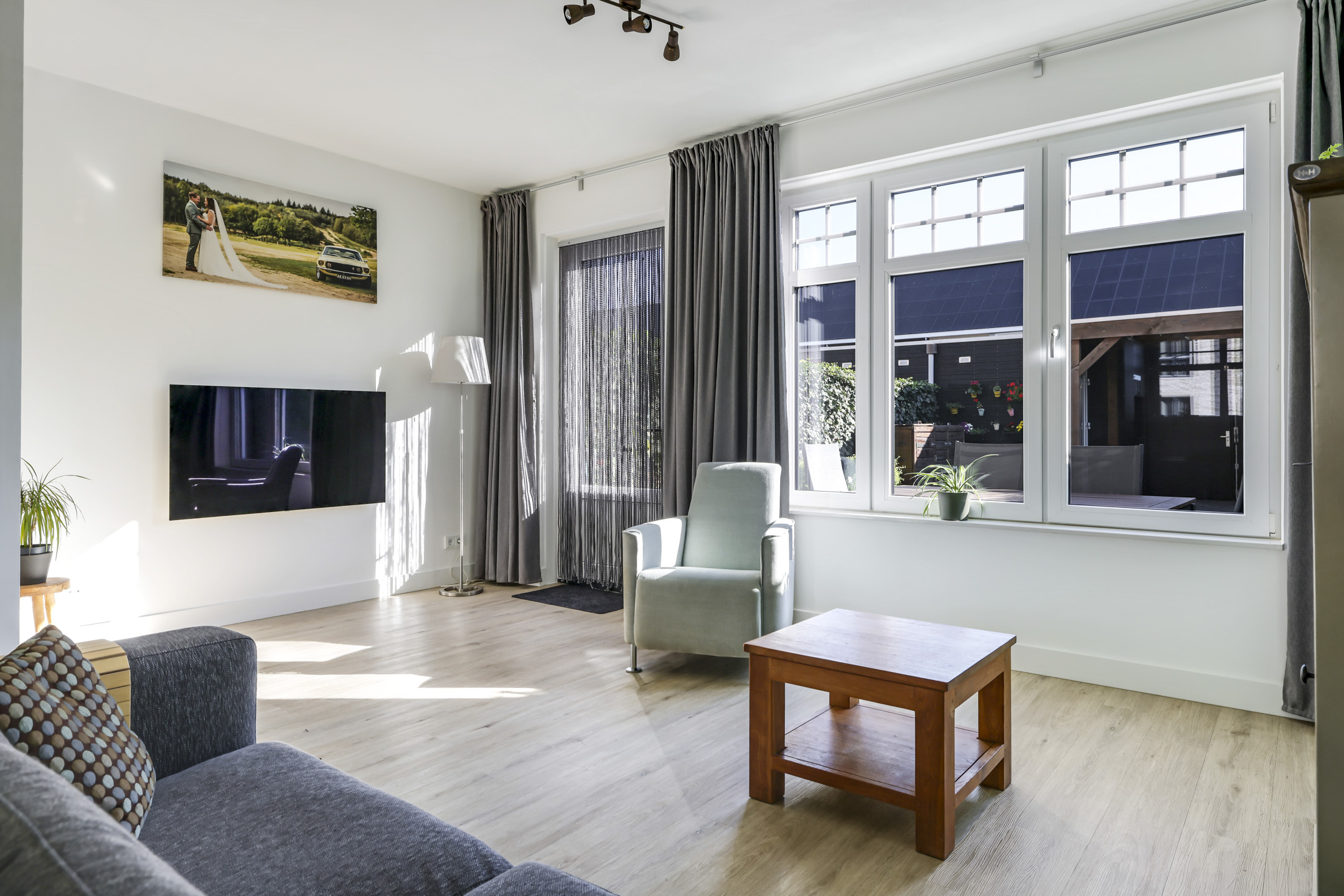 Via een prettige hal met toilet en trapopgang lopen we de woonkamer binnen die aan de achterzijde van de woning is gelegen. De woonkamer is over de volle breedte gesitueerd waardoor er plaats is voor een lekkere hoekbank en een grote TV tegen de muur. Meer richting de keuken is er plaats voor een mooie ronde of ovale eettafel waar je met familie of vrienden kunt eten en/of een spel kunt spelen. Het afwerkingsniveau is verzorgd met strakke wanden en een PVC-vloer met houtlook hetgeen voor een warme woonsfeer zorgt. Radiatoren zijn hier passé waardoor je nog meer ruimte overhoudt. Erg praktisch is de trapkast waar je de nodige voorraad en een stofzuiger kwijt kunt. Een tuindeur geeft toegang tot het buitenterras.