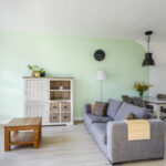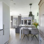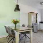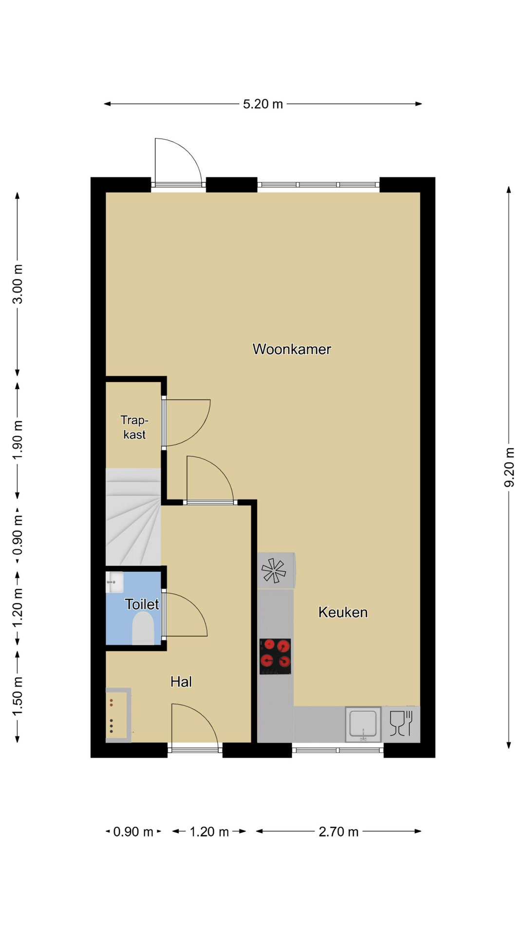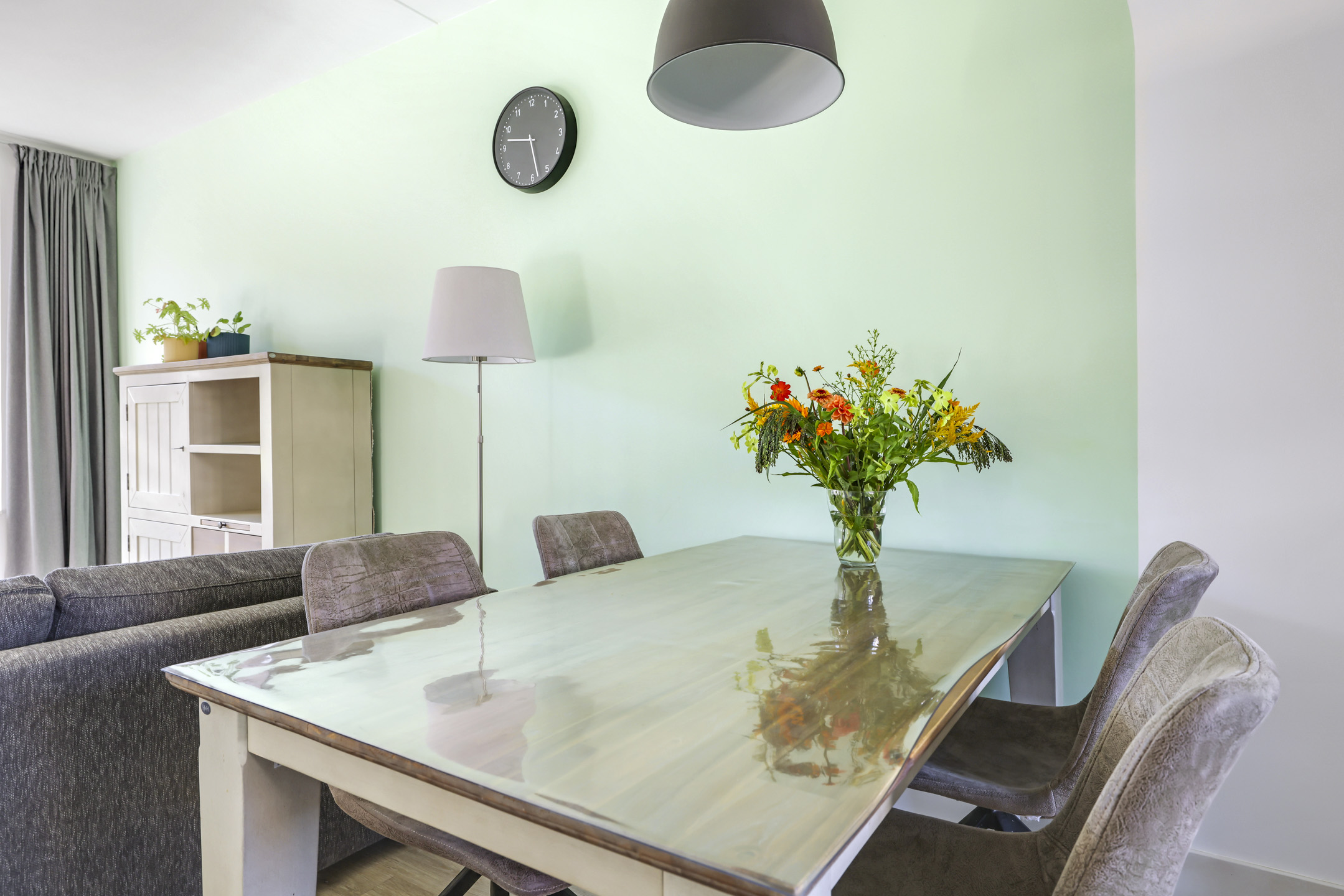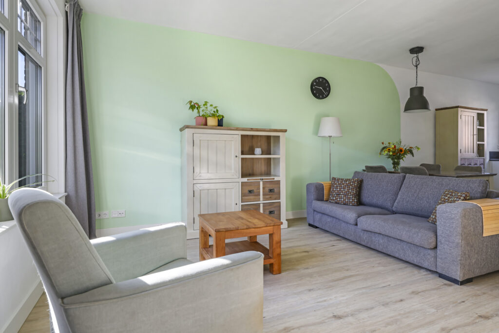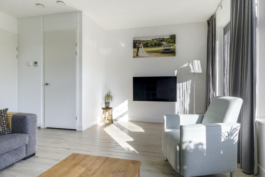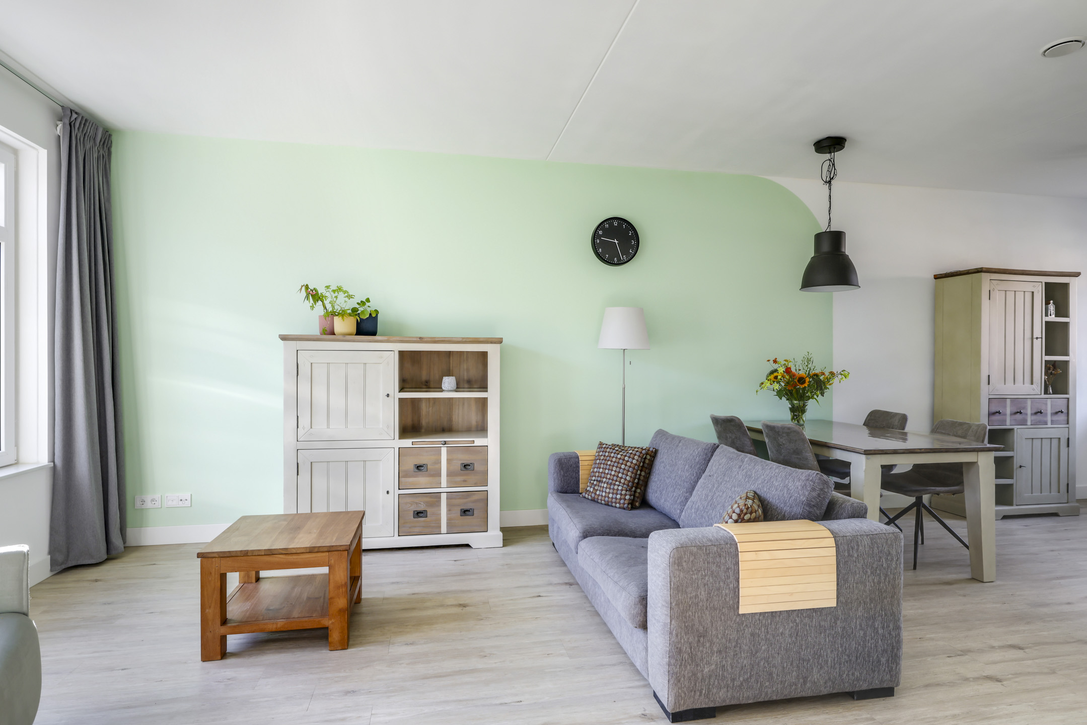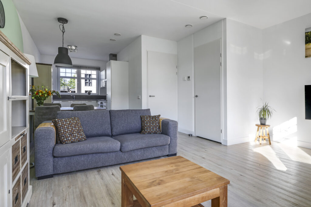 Via een prettige hal met toilet en trapopgang lopen we de woonkamer binnen die aan de achterzijde van de woning is gelegen. De woonkamer is over de volle breedte gesitueerd waardoor er plaats is voor een lekkere hoekbank en een grote TV tegen de muur. Meer richting de keuken is er plaats voor een mooie ronde of ovale eettafel waar je met familie of vrienden kunt eten en/of een spel kunt spelen. Het afwerkingsniveau is verzorgd met strakke wanden en een PVC-vloer met houtlook hetgeen voor een warme woonsfeer zorgt. Radiatoren zijn hier passé waardoor je nog meer ruimte overhoudt. Erg praktisch is de trapkast waar je de nodige voorraad en een stofzuiger kwijt kunt. Een tuindeur geeft toegang tot het buitenterras.