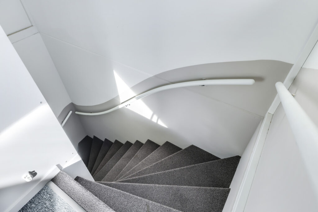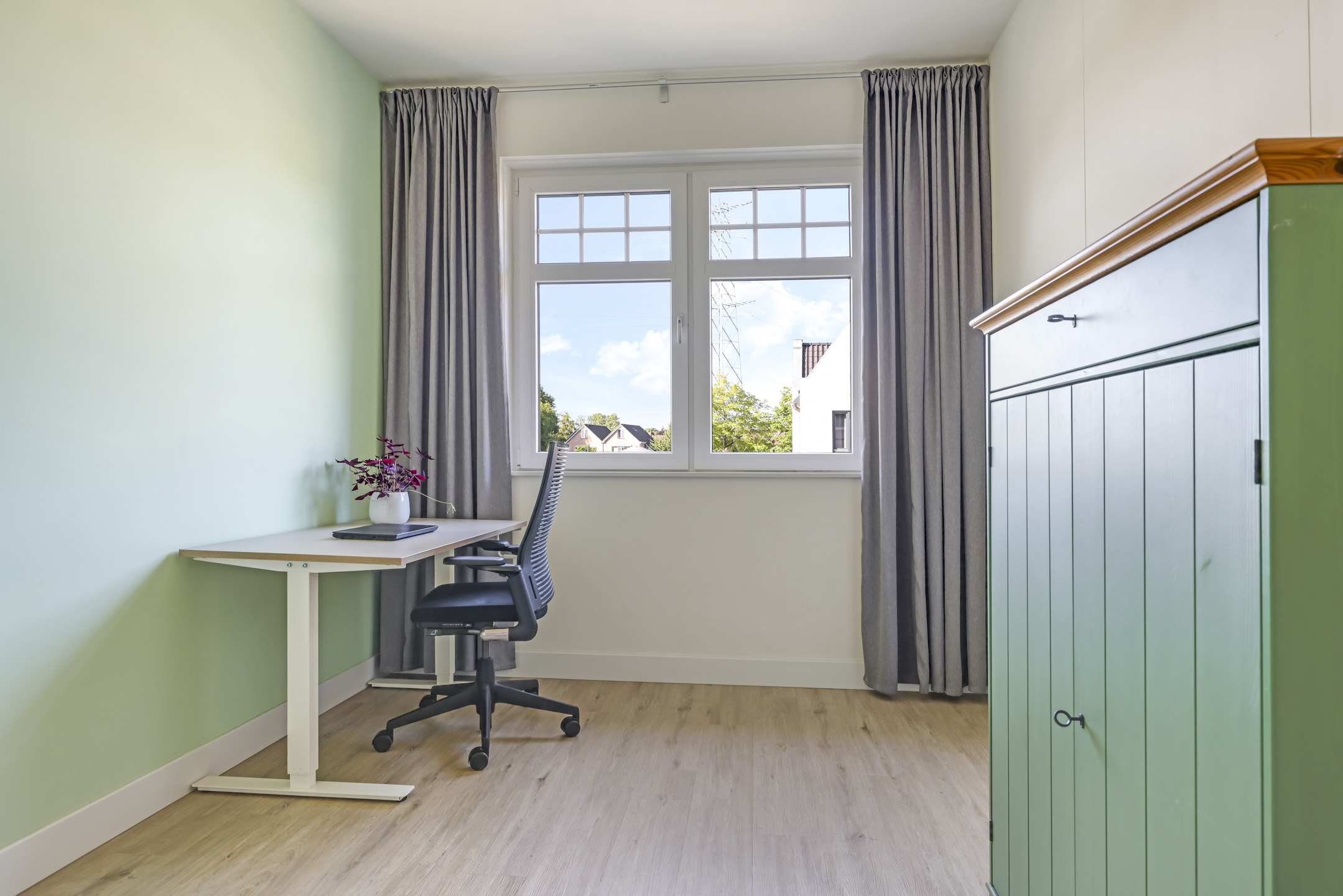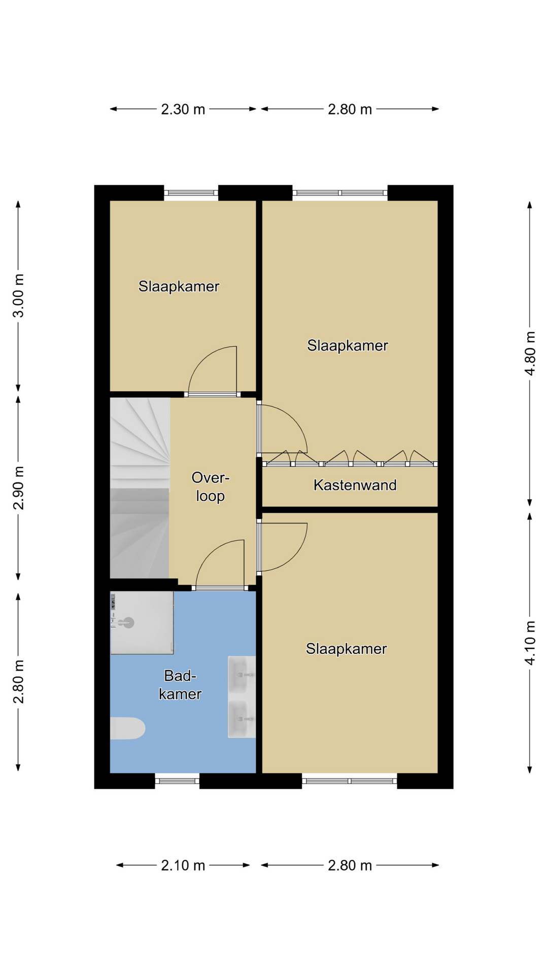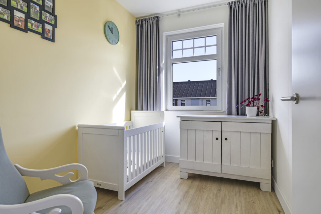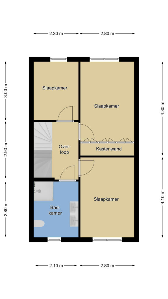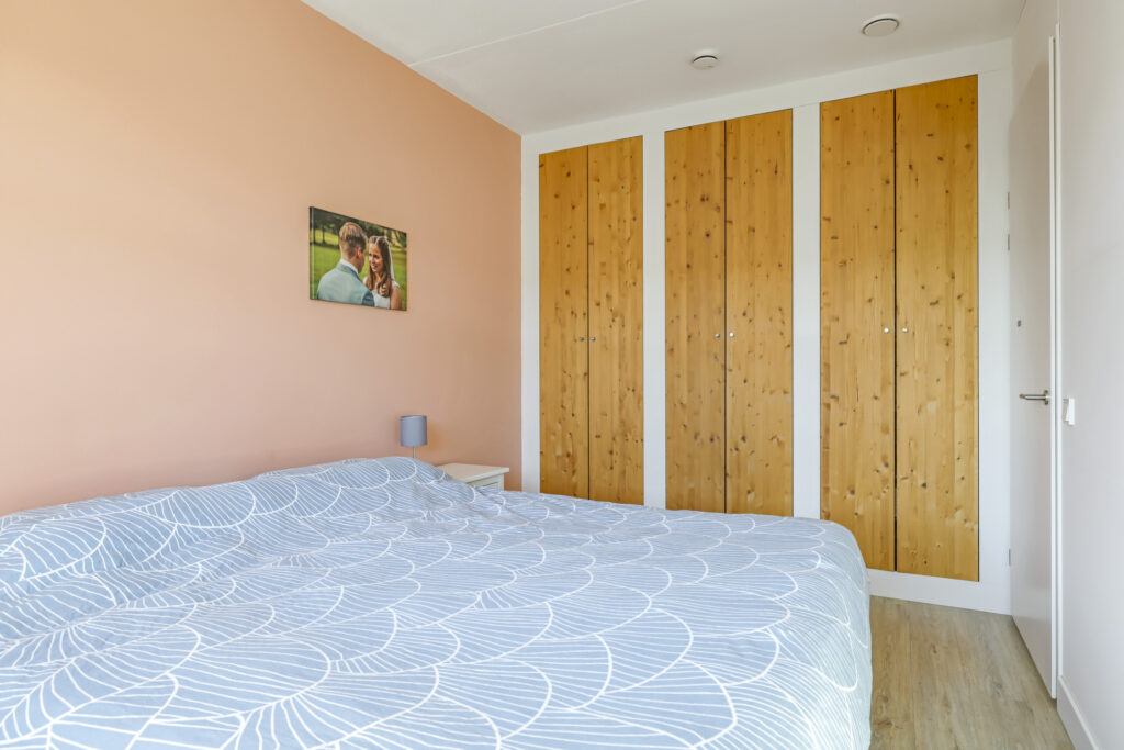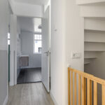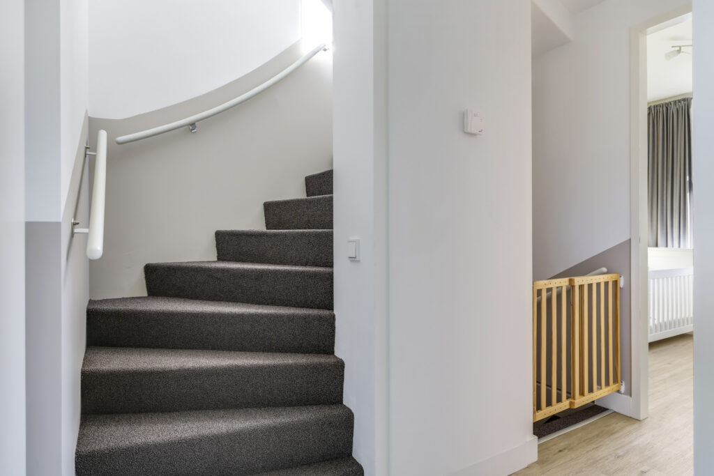 Zonder dat je het hoort of in de gaten hebt, loop je al op die geruisloze, betonnen trapopgang naar boven. Eénmaal op de 1e verdieping schakelt een overloop 3 slaapkamers en de badkamer met elkaar. De slaapkamers zijn respectievelijk 13m², 11m² en 7m² groot en dus allemaal volwaardig en functioneel te noemen. Bij de indeling is er rekening gehouden dat er op de grootste slaapkamer een grote linnenkast achter de deur geplaatst kan worden. Hier is dan ook dankbaar gebruik van gemaakt door op deze plek een grote kastenwand te plaatsen.