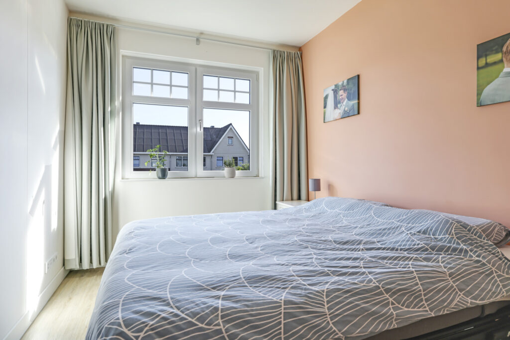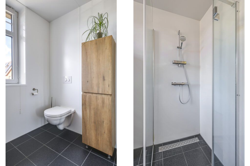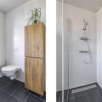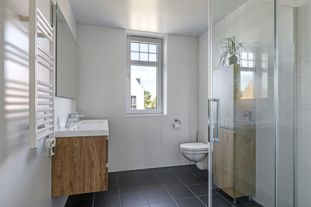 Ook de badkamer is nog relatief nieuw en dat zie je gelijk doordat het er allemaal nog fris en schoon uitziet. Er is gekozen voor modern en neutraal sanitair met onder meer een inloopdouche met drainafvoer, een 2-persoons wastafelmeubel met lades, een grote spiegel met ledverlichting en een 2e zwevend wandcloset. Extra bergruimte is te vinden in de bijpassende kolomkast. Een draai/kiepraam zorgt voor een prettige lichtinval en de ideale ventilatiemogelijkheid. Natuurlijk is er ook mechanische ventilatie (via de WTW) aanwezig.