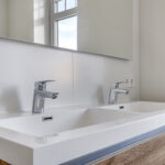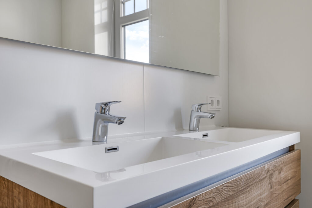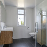 Badkamer met inloopdouche, 2-persoons wastafelmeubel en 2e toilet.