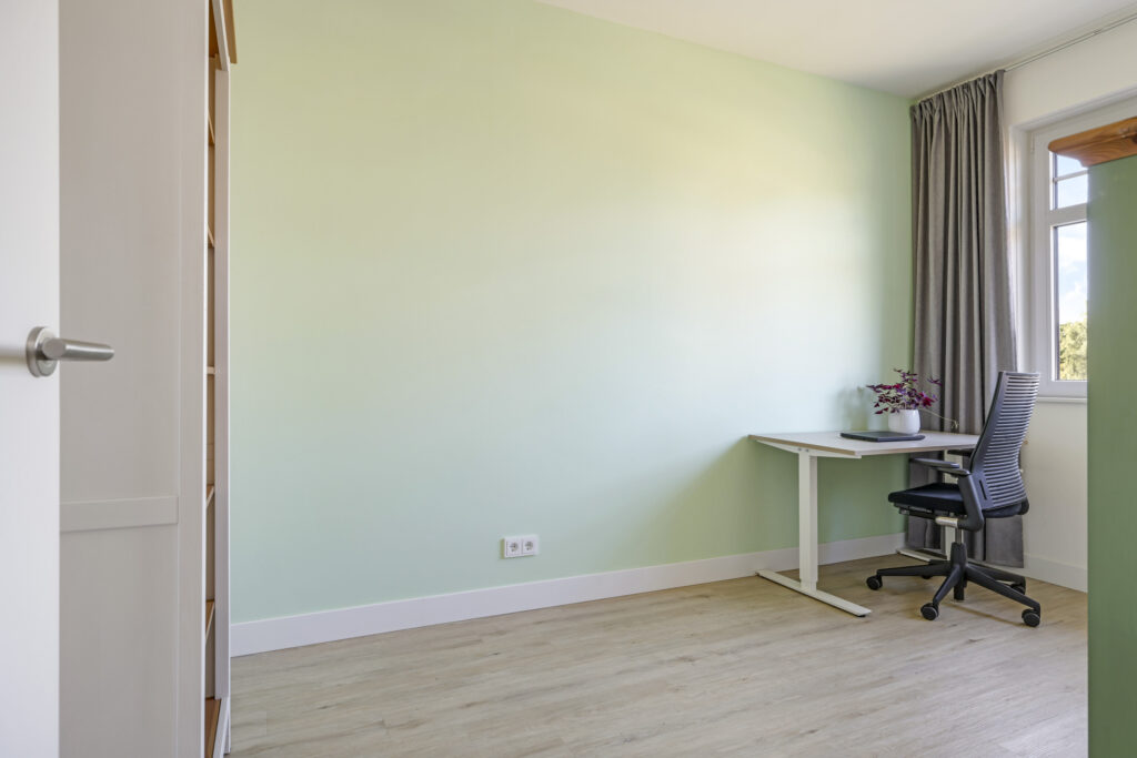 Plafonds van maar liefst 2,78 meter hoog zorgen voor een bijzonder ruimtelijk gevoel. De ramen zijn voorzien van een draai/kiepfunctie waardoor je praktisch kunt ventileren. Radiatoren zijn er niet te vinden aangezien ook deze verdiepingsvloer is voorzien van vloerverwarming. De PVC-vloer is fraai als één geheel in alle kamers doorgelegd.