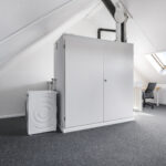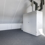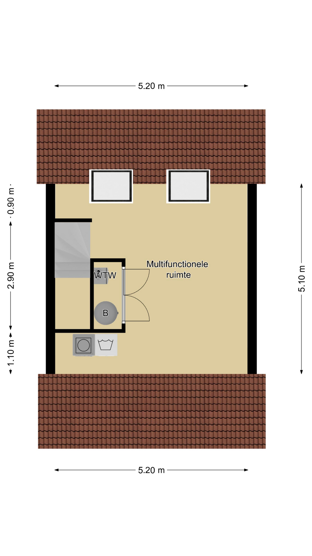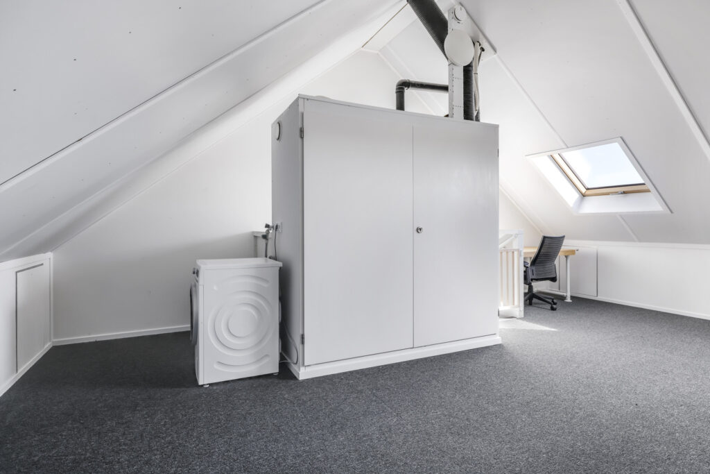 In de huidige setting is deze woonlaag multifunctioneel te gebruiken. Je zou het kunnen inrichten als gym of je maakt er een fijne werkplek. 2 Grote dakvensters biedt een prettige lichtinval. In de hoek kun je zowel de wasmachine als de droger kwijt. De warmtepomp (WP) en de mechanische ventilatie (WTW) zijn keurig in een inbouwkast weggewerkt.