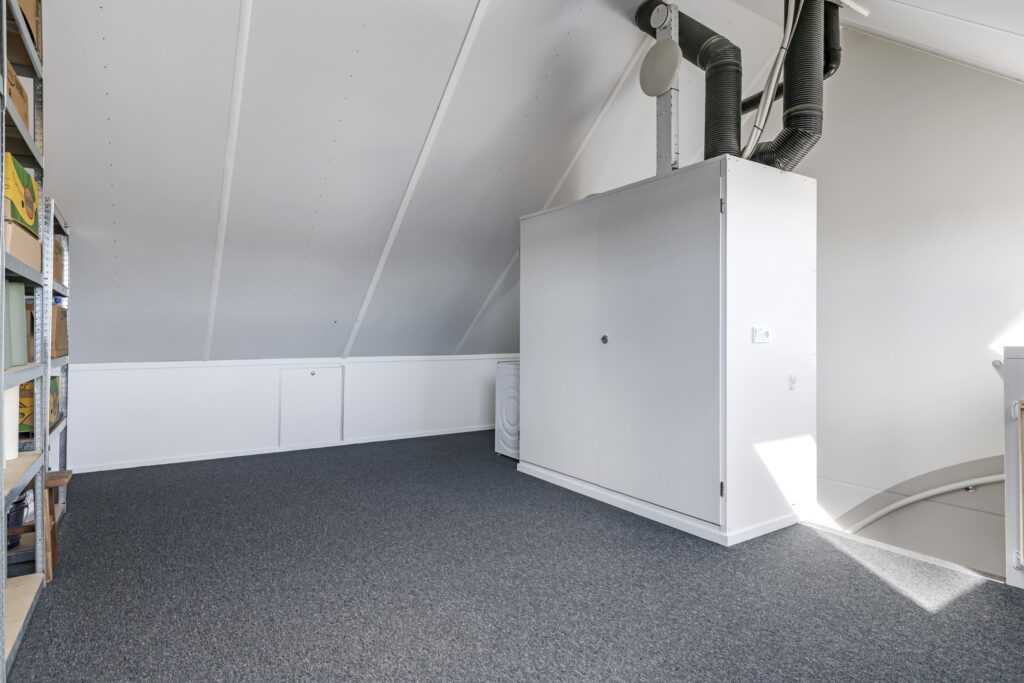 Via een vaste trap bereiken we de verrassend grote 2e verdieping. Deze woonlaag biedt veel perspectief doordat het nog geheel naar eigen wens is in te delen. Mocht je voorkeur uitgaan naar extra slaapkamers, dan is dit eenvoudig te realiseren. En doordat de nok 3,5 meter hoog is, zou je er ook nog een zoldervliering kunnen creëren. Overigens is er achter de knieschotten al de nodige opbergruimte te vinden.