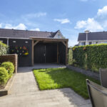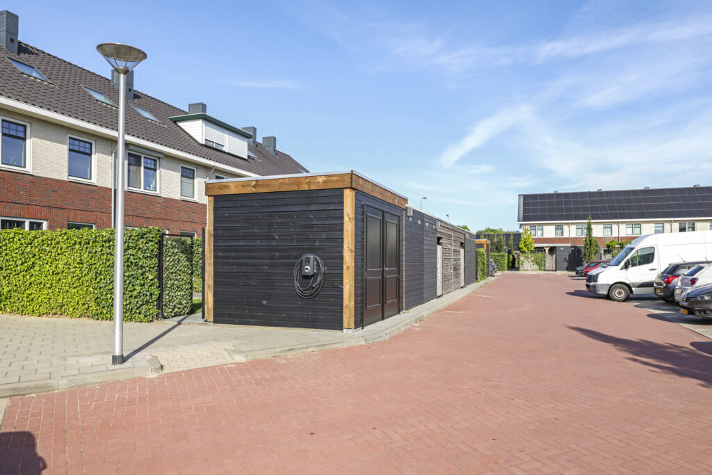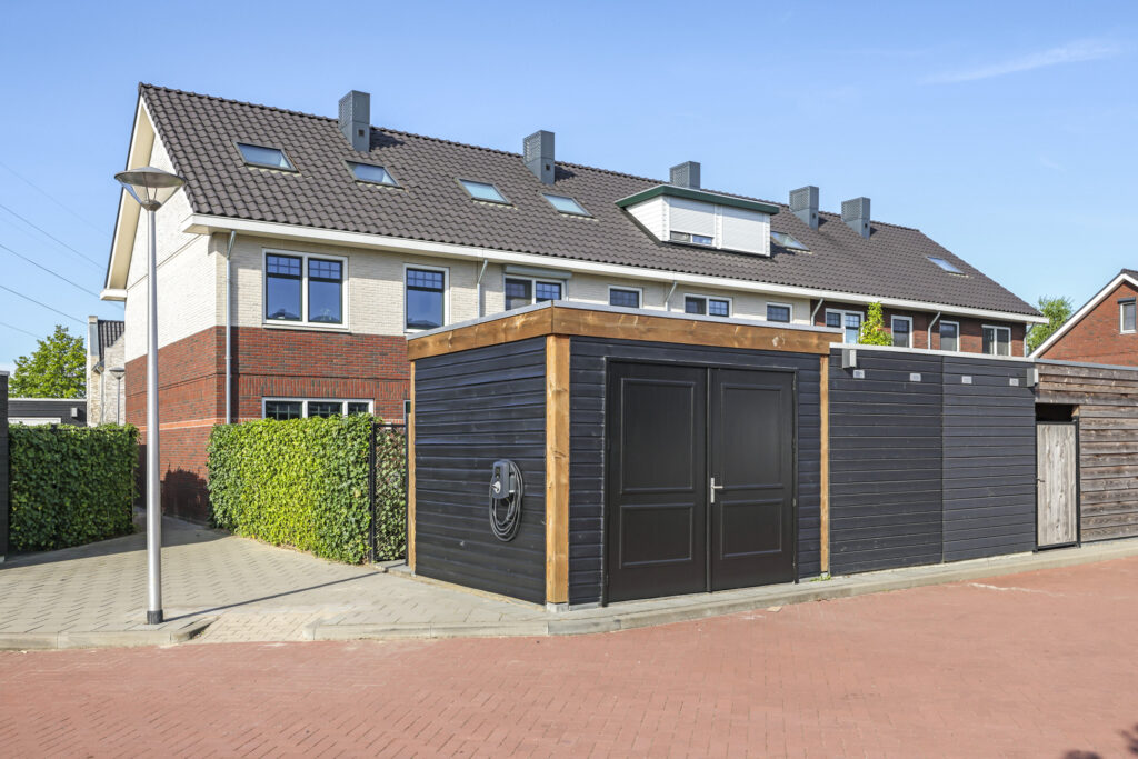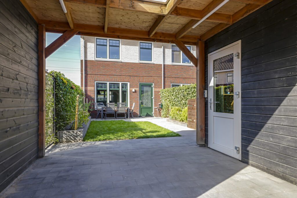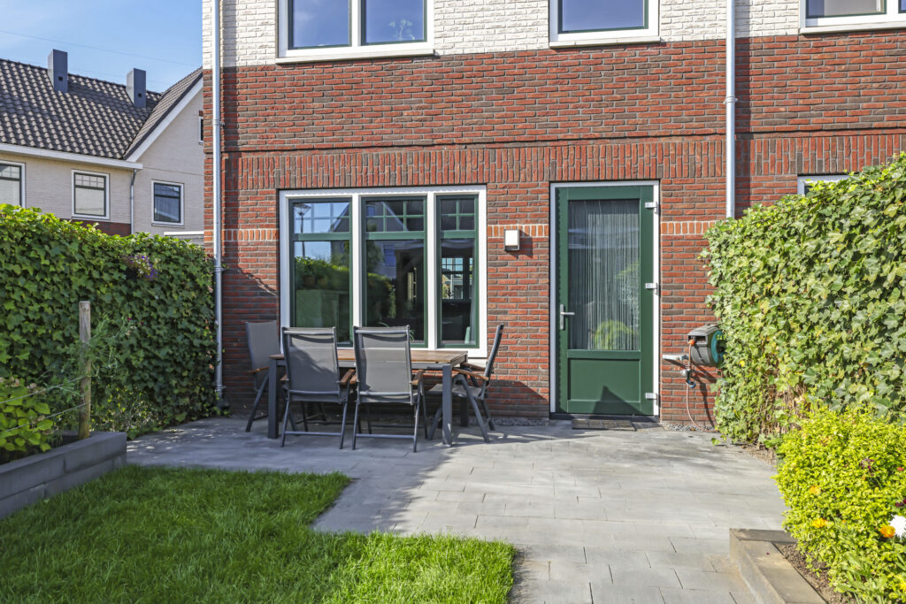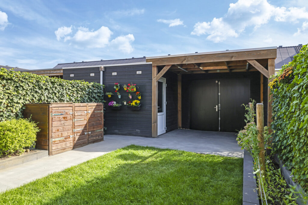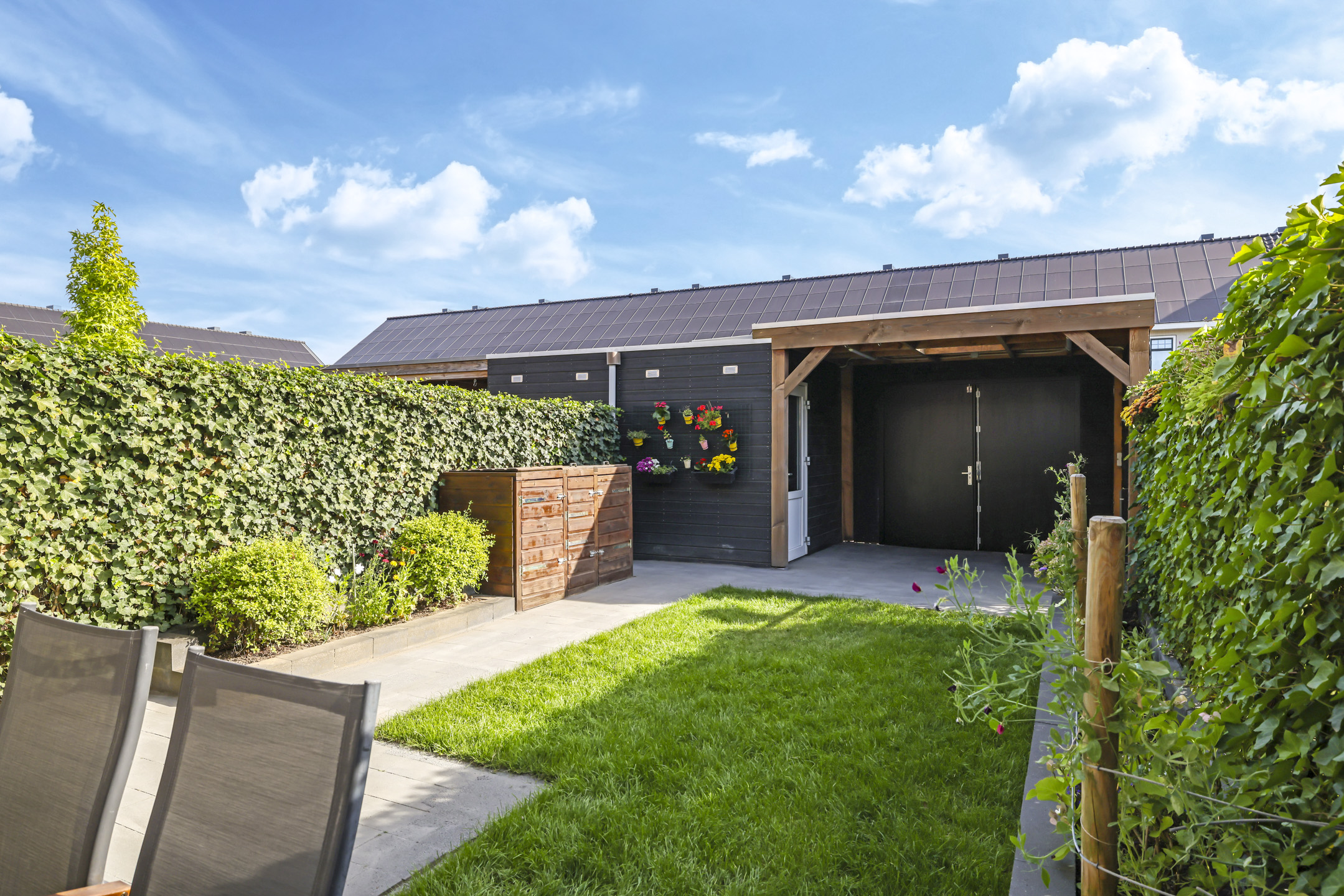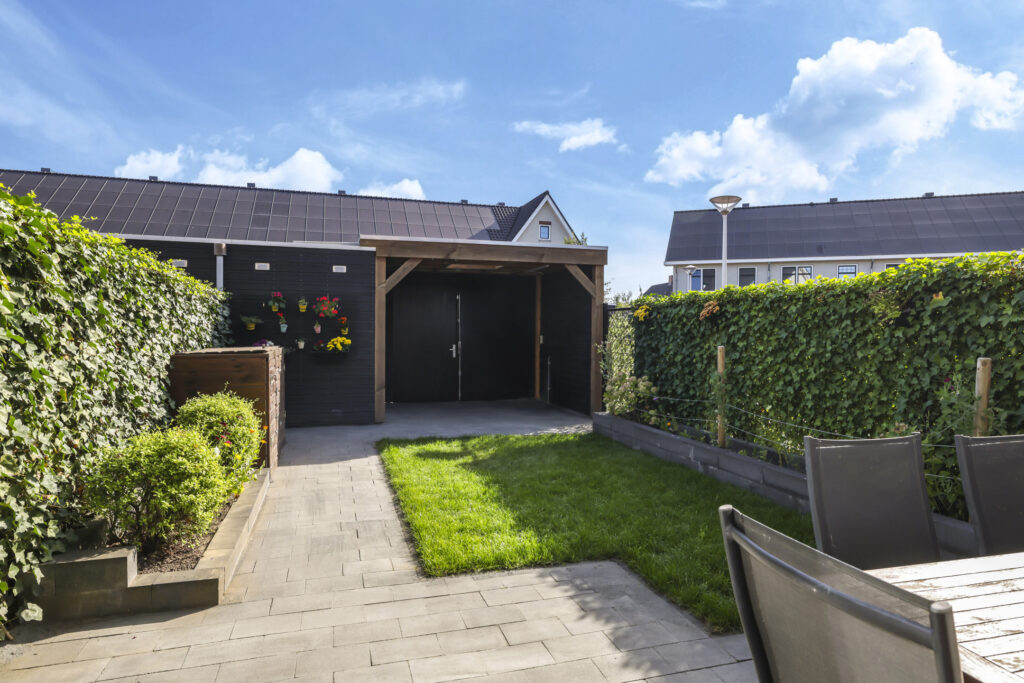 De achtertuin is overzichtelijk en onderhoudsarm te noemen. Vooraan heeft het terras de volle breedte van de tuin waardoor je hier een lekkere loungeset kwijt kunt. Gelukkig is de tuin niet volledig bestraat waarbij een gazon voor een groen karakter zorgt. Kinderen kunnen hier op het gras spelen, met of zonder speeltoestellen. Achterin de tuin staat een schuur voor het stallen van fietsen en het opbergen van tuinspullen en gereedschap. Aan deze schuur is een veranda gebouwd. Hier kan je een fijne 2e zithoek kwijt waardoor je kan kiezen tussen de zon en de schaduw. Een dakraam zorgt dat dit geen donkere hoek wordt en je nog steeds een fijne lichtinval treft. Dubbele deuren in de achterzijde zorgen ervoor dat je dit ook kan gebruiken als stallingsruimte, voor bijvoorbeeld een boot, motor of aanhangwagen. Aan de zijkant van de tuin is een poort (achterom) aanwezig. Aan deze zijde is tevens voorbereiding voor een laadpaal aanwezig.