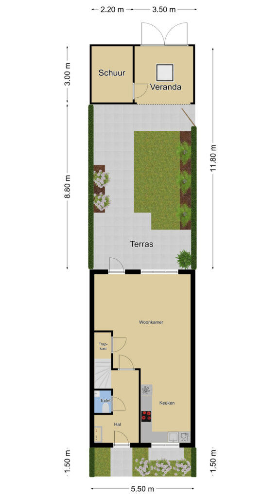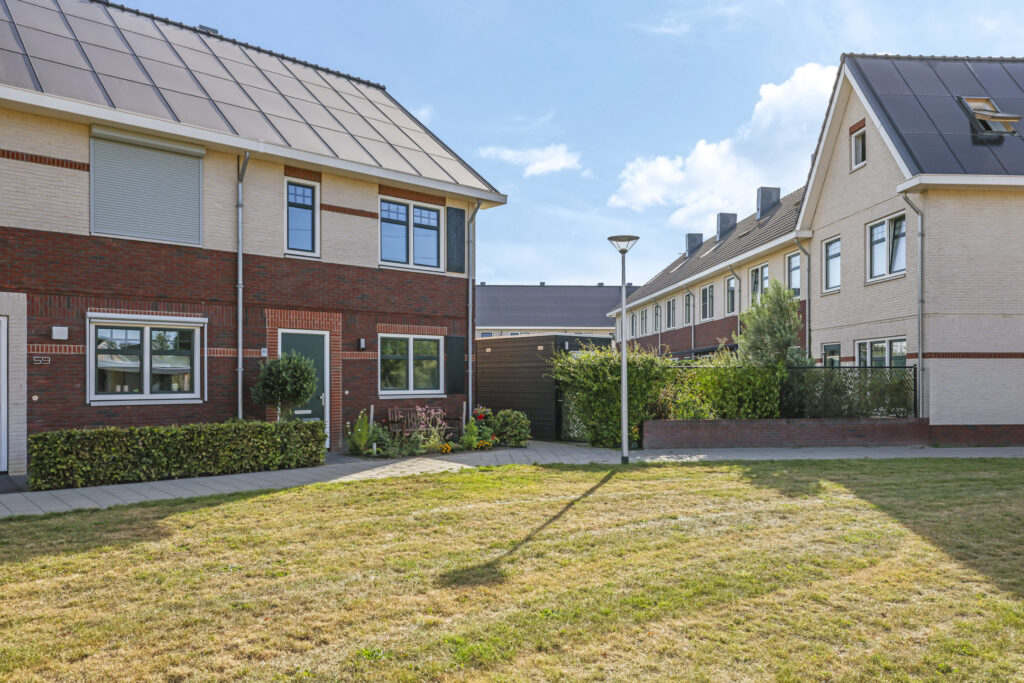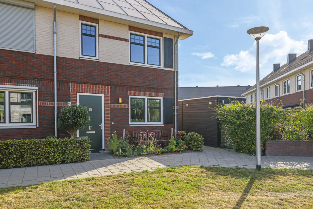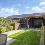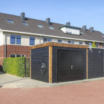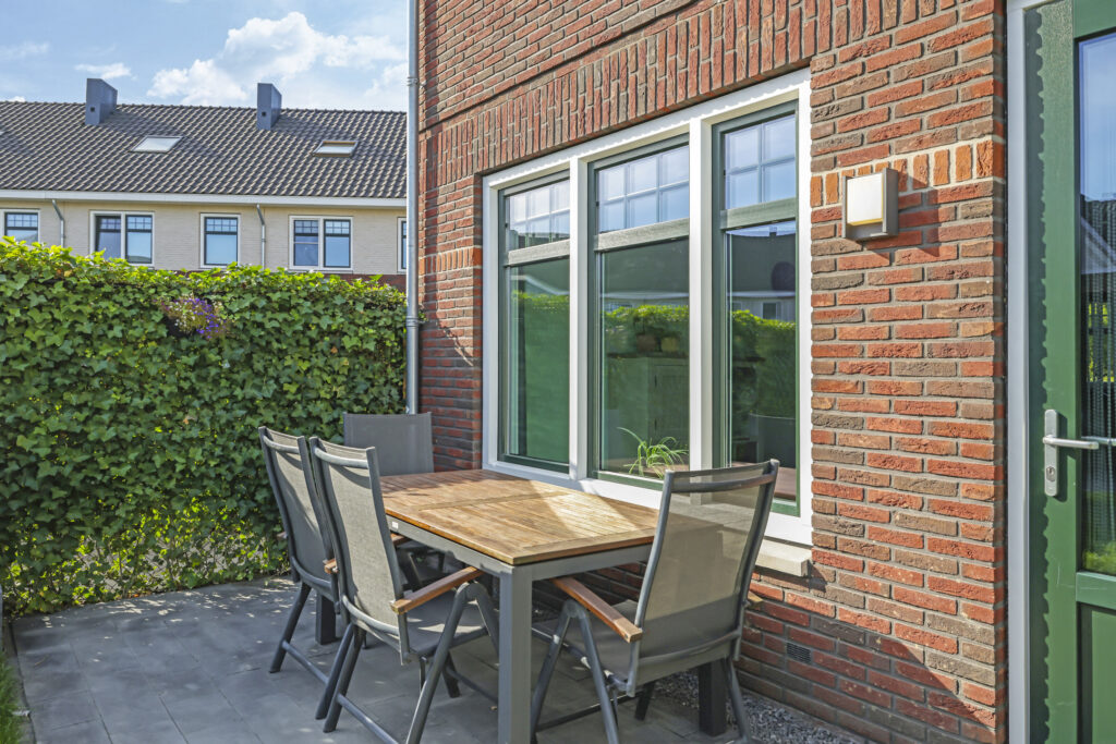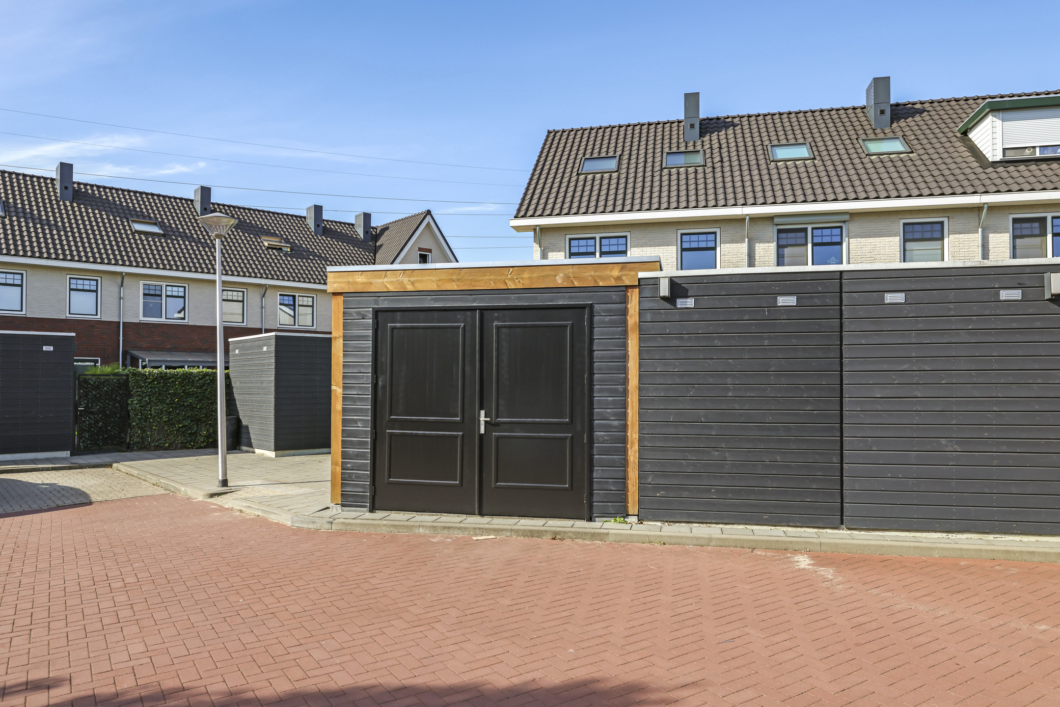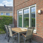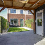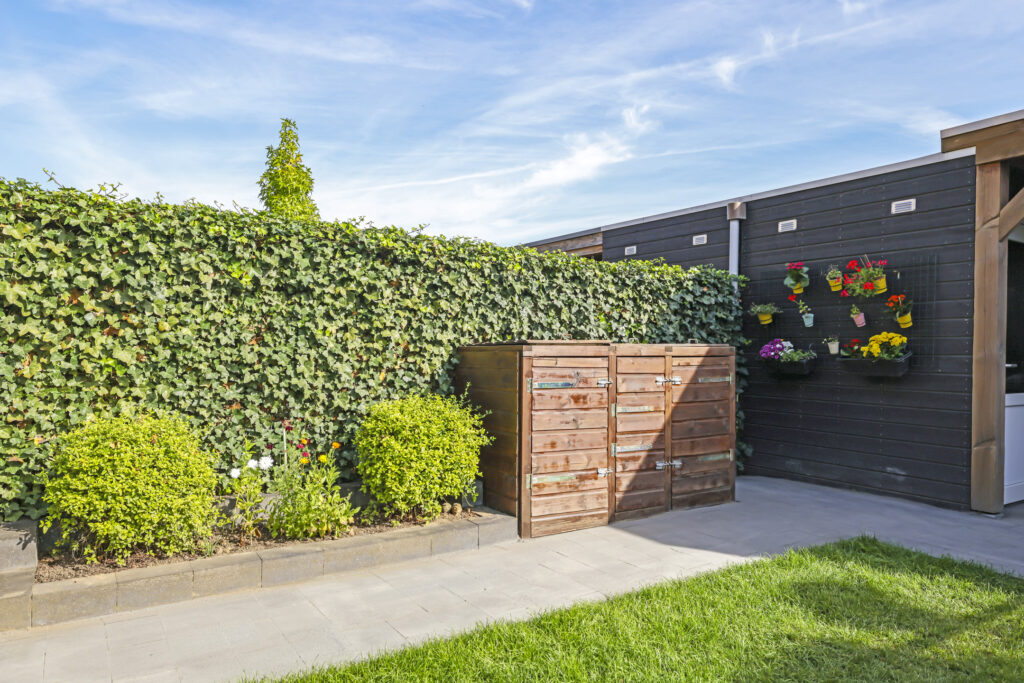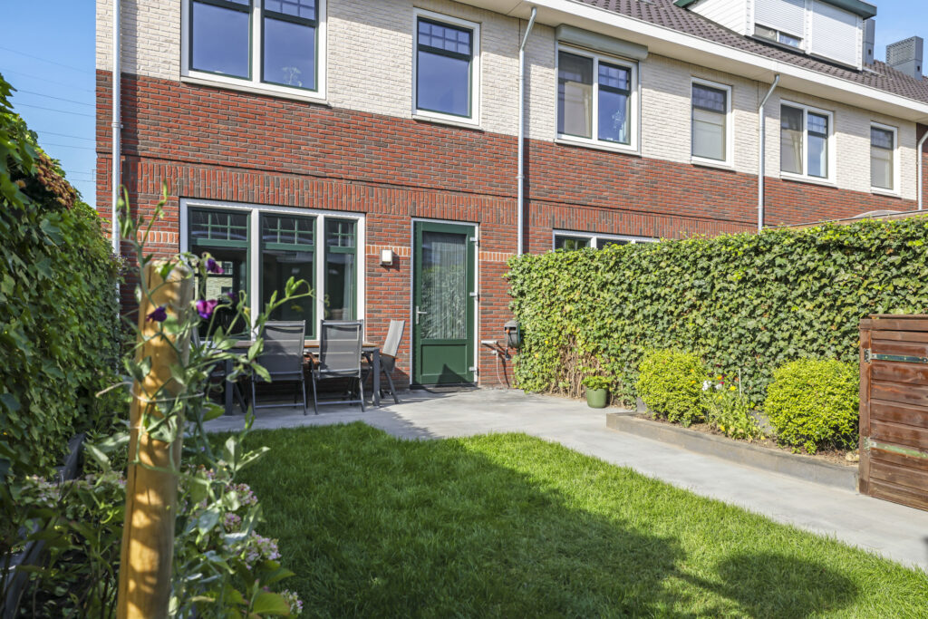 De achtertuin is overzichtelijk en onderhoudsarm te noemen. Vooraan heeft het terras de volle breedte van de tuin waardoor je hier een lekkere loungeset kwijt kunt. Gelukkig is de tuin niet volledig bestraat waarbij een gazon voor een groen karakter zorgt. Kinderen kunnen hier op het gras spelen, met of zonder speeltoestellen. Achterin de tuin staat een schuur voor het stallen van fietsen en het opbergen van tuinspullen en gereedschap. Aan deze schuur is een veranda gebouwd. Hier kan je een fijne 2e zithoek kwijt waardoor je kan kiezen tussen de zon en de schaduw. Een dakraam zorgt dat dit geen donkere hoek wordt en je nog steeds een fijne lichtinval treft. Dubbele deuren in de achterzijde zorgen ervoor dat je dit ook kan gebruiken als stallingsruimte, voor bijvoorbeeld een boot, motor of aanhangwagen. Aan de zijkant van de tuin is een poort (achterom) aanwezig. Aan deze zijde is tevens voorbereiding voor een laadpaal aanwezig.