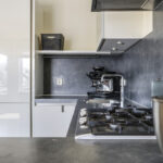 De keuken heeft een open karakter en is in een U-opstelling met schiereiland geplaatst. De inbouwapparatuur bestaat uit een vaatwasser, een koelkast, een vriezer, een 5-pits gaskookplaat, een afzuiger en een combi-oven/magnetron. De Quooker-kraan wordt ter overname aangeboden. In de hal is nog een extra kast aanwezig waar je naast de opstelling van de cv-ketel en witgoedaansluiting ook nog ruimte hebt voor de nodige voorraad.