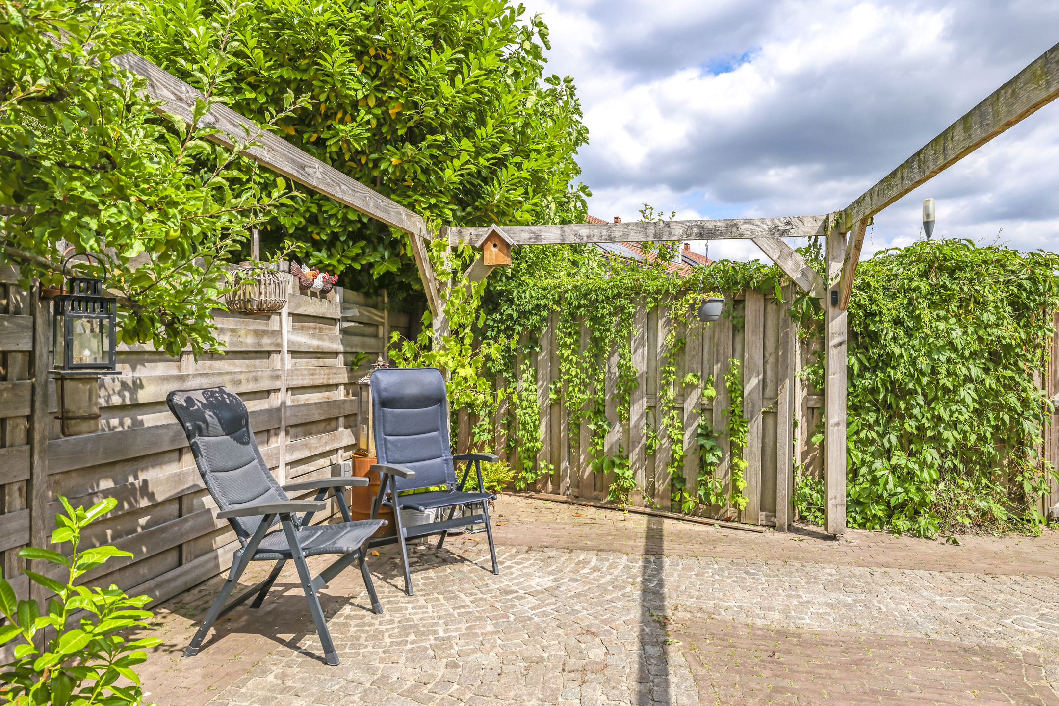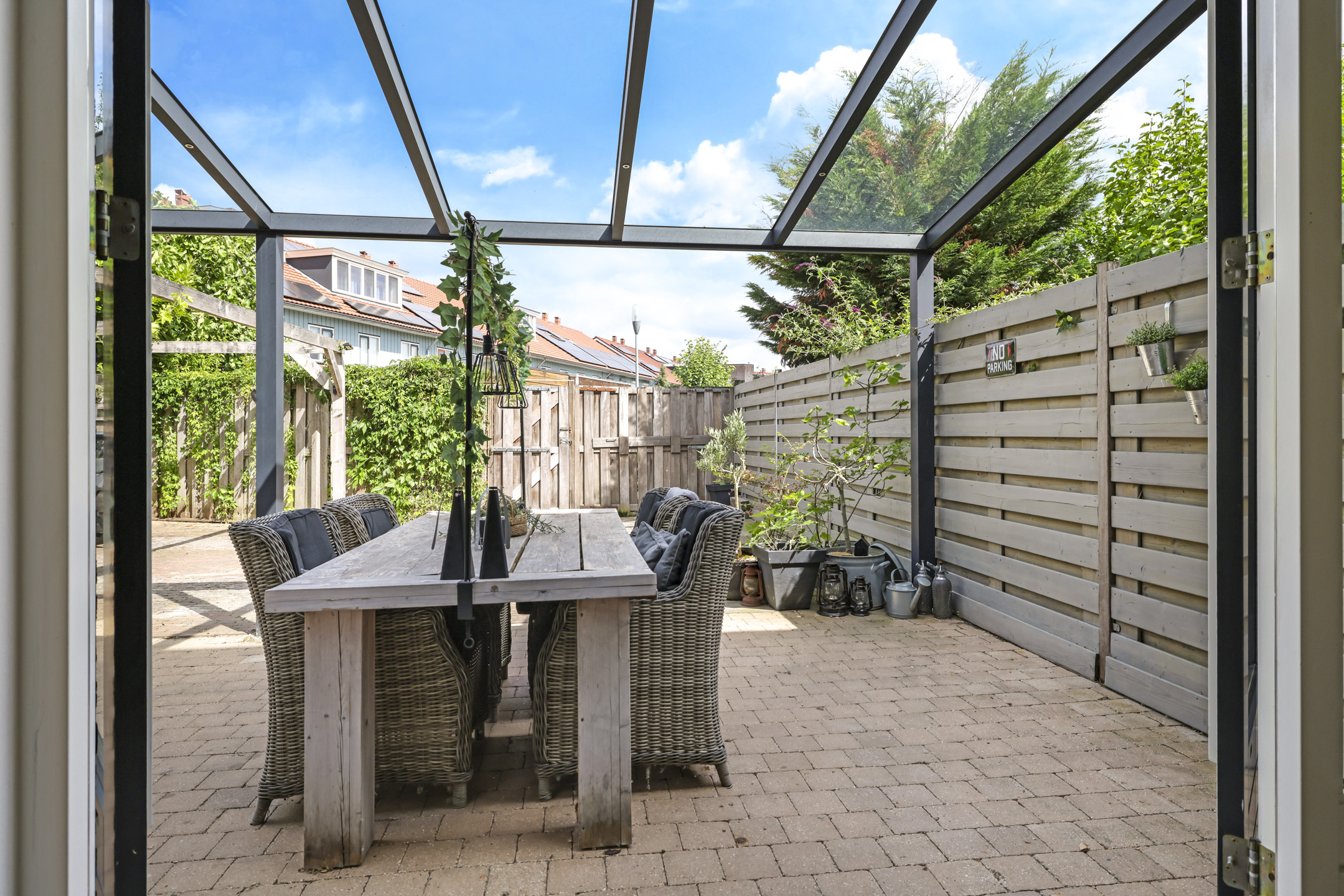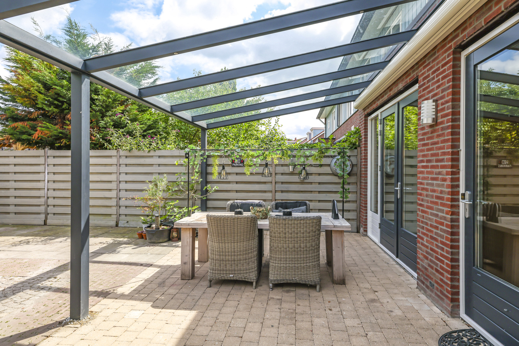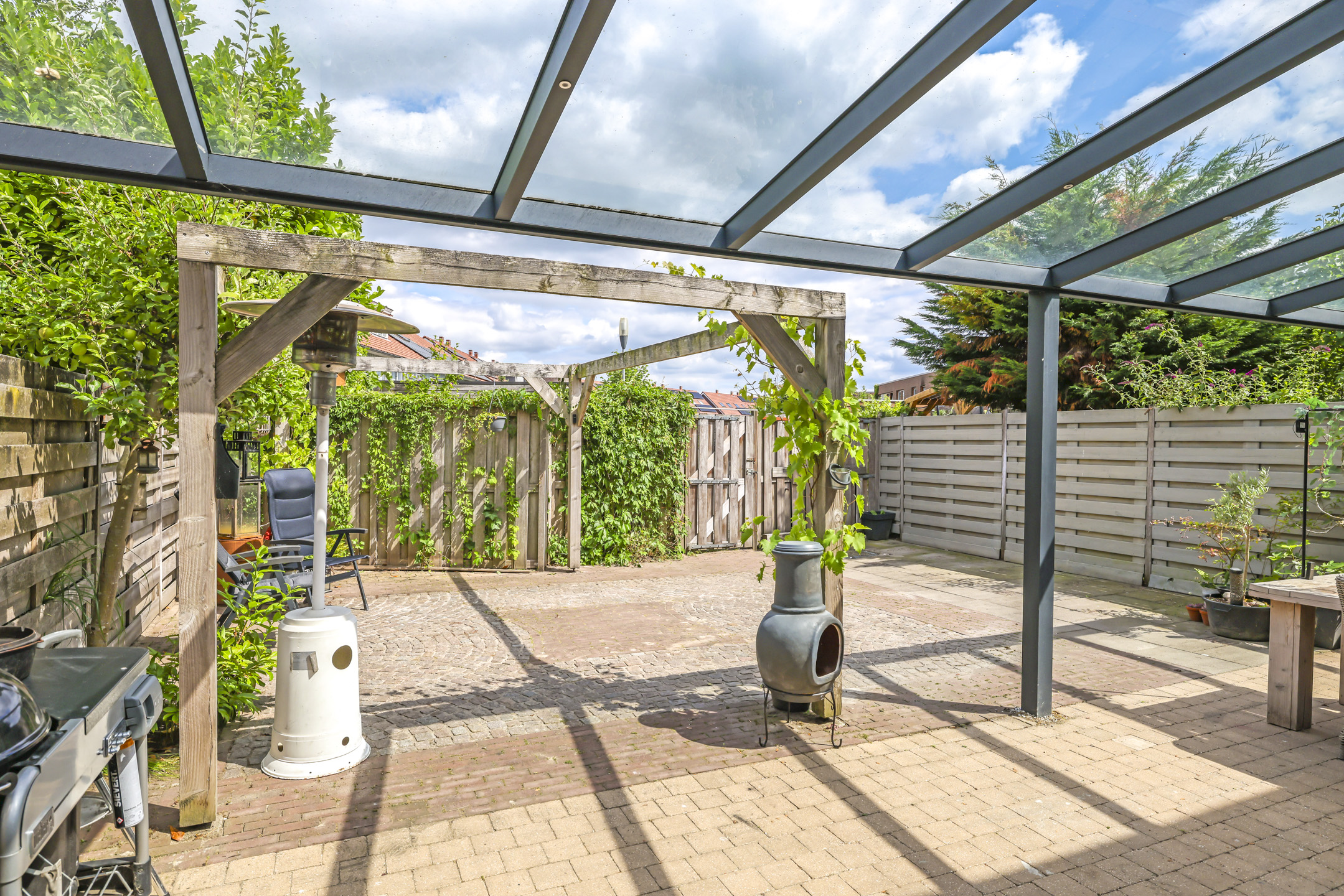 Bij deze woning hoort een brede, privacyvolle achtertuin. Doordat de achtergelegen woning dwars op deze woning staat, kijk je hier langs de woningen op vrij van je af. Direct aan de woning vast tref een aluminium terrasoverkapping welke over de gehele breedte (bijna 9m) van de tuin is geplaatst. Dit zorgt dat je meer dan genoeg zitplekken hebt waar je heerlijk beschut kunt zitten. In de overkapping is tevens spotverlichting verwerkt. Onder de terrasoverkapping hangt nog een zonnescherm, hierdoor kan je tevens schaduw creëren in je zithoek. Door de overkapping loop je tevens droog van het huis naar de berging. Een ander opvallend punt is dat de achtertuin grenst aan een weg. Dit zorgt ervoor dat met een auto of bijvoorbeeld een aanhanger in je tuin kan komen. Een dubbele poort geeft je toegang hiertoe.