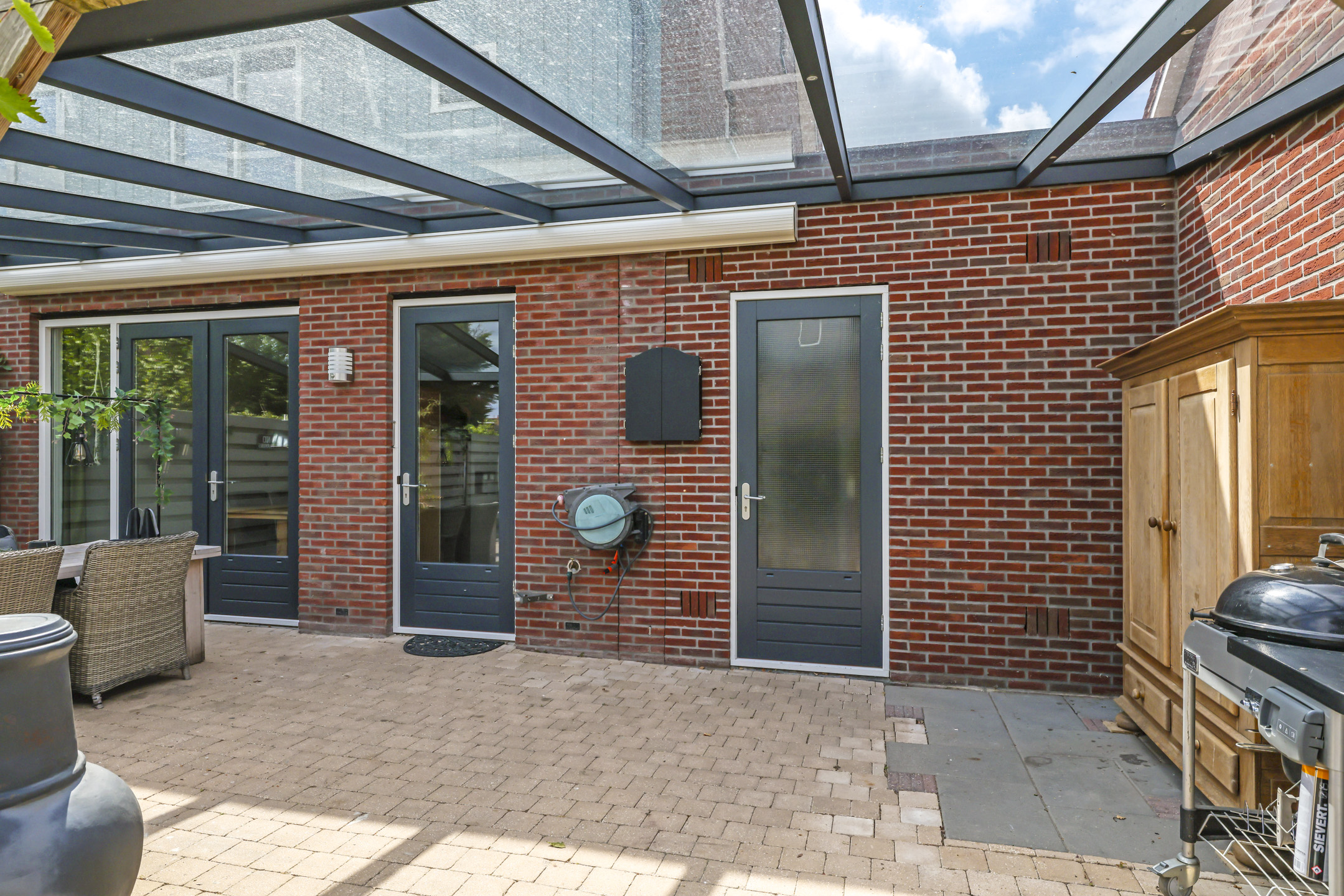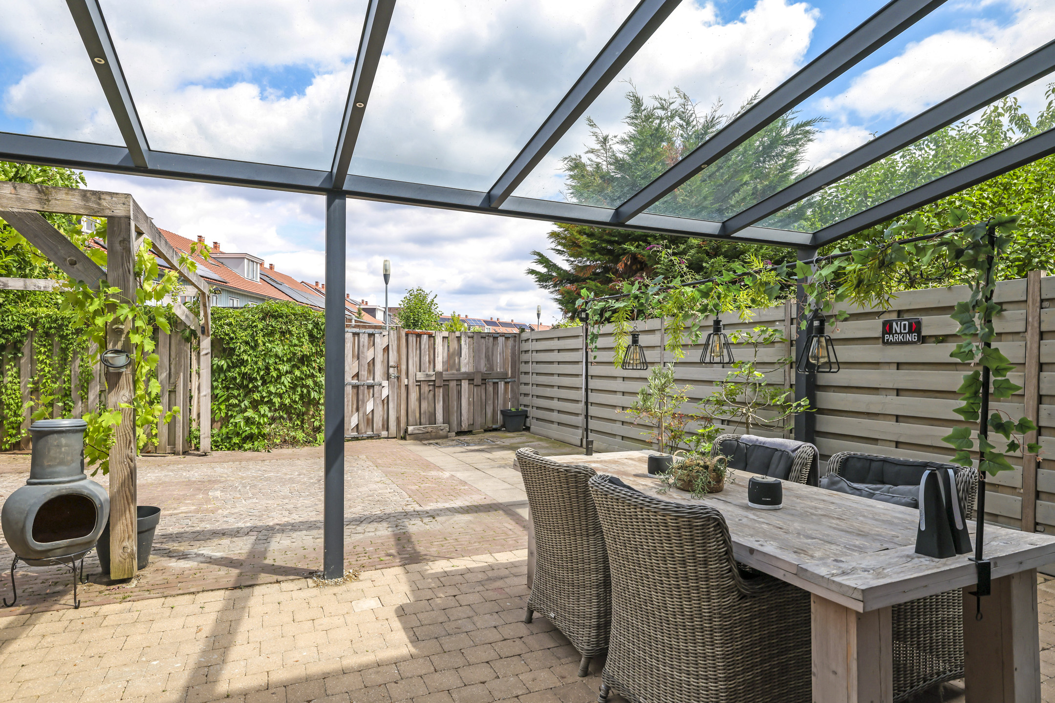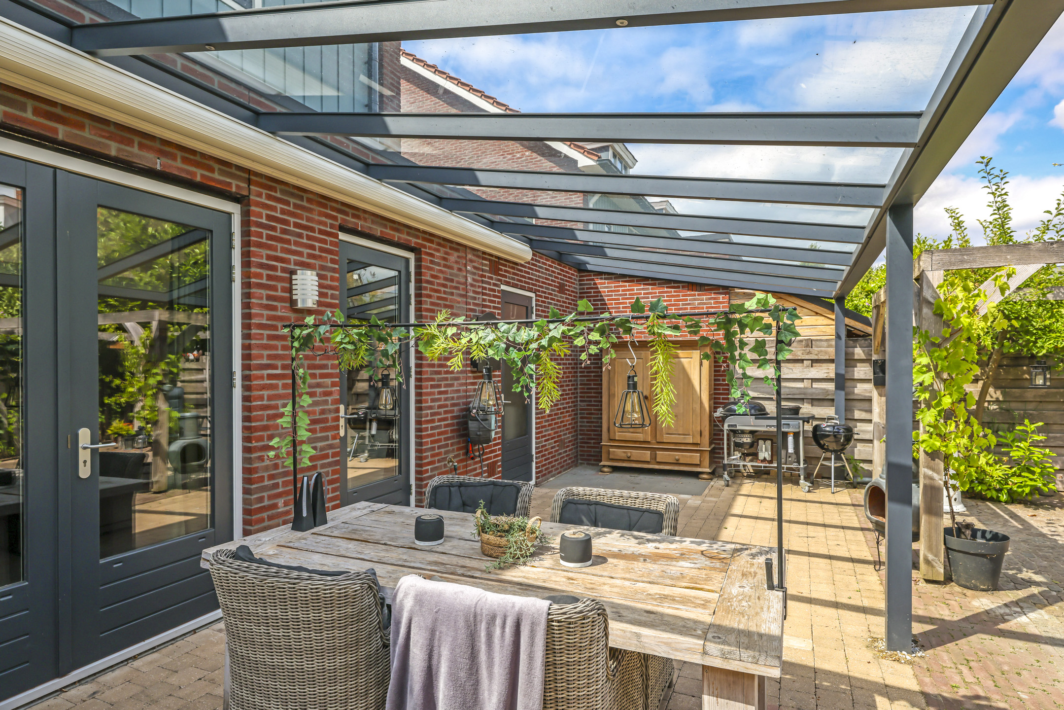 Bij deze woning hoort een brede, privacyvolle achtertuin. Doordat de achtergelegen woning dwars op deze woning staat, kijk je hier langs de woningen op vrij van je af. Direct aan de woning vast tref een aluminium terrasoverkapping welke over de gehele breedte (bijna 9m) van de tuin is geplaatst. Dit zorgt dat je meer dan genoeg zitplekken hebt waar je heerlijk beschut kunt zitten. In de overkapping is tevens spotverlichting verwerkt. Onder de terrasoverkapping hangt nog een zonnescherm, hierdoor kan je tevens schaduw creëren in je zithoek. Door de overkapping loop je tevens droog van het huis naar de berging. Een ander opvallend punt is dat de achtertuin grenst aan een weg. Dit zorgt ervoor dat met een auto of bijvoorbeeld een aanhanger in je tuin kan komen. Een dubbele poort geeft je toegang hiertoe.
