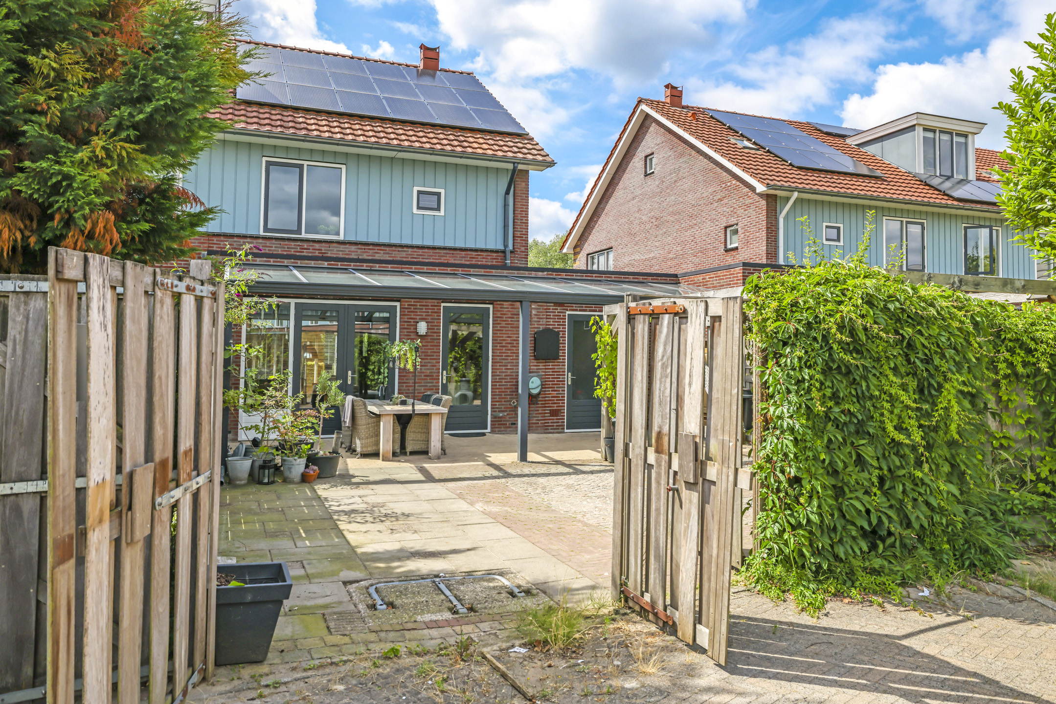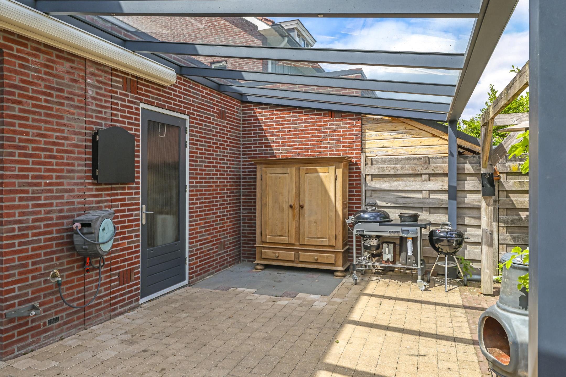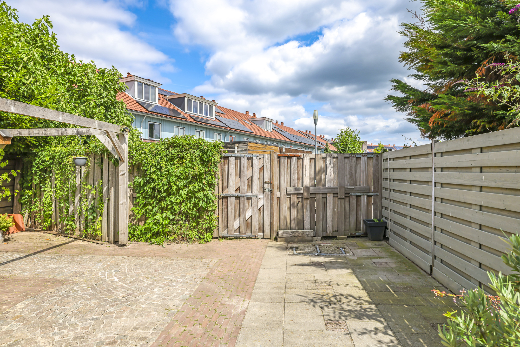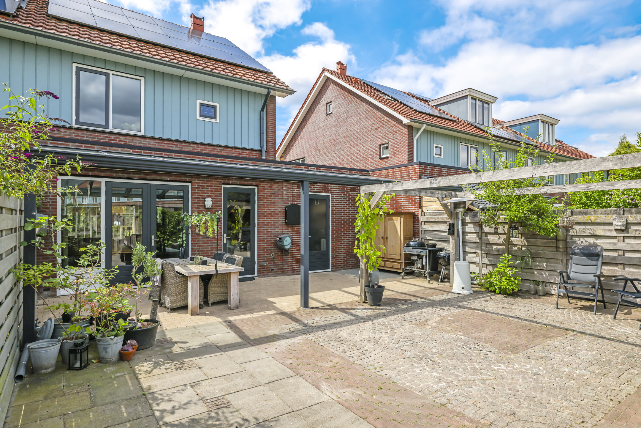 Bij deze woning hoort een brede, privacyvolle achtertuin. Doordat de achtergelegen woning dwars op deze woning staat, kijk je hier langs de woningen op vrij van je af. Direct aan de woning vast tref een aluminium terrasoverkapping welke over de gehele breedte (bijna 9m) van de tuin is geplaatst. Dit zorgt dat je meer dan genoeg zitplekken hebt waar je heerlijk beschut kunt zitten. In de overkapping is tevens spotverlichting verwerkt. Onder de terrasoverkapping hangt nog een zonnescherm, hierdoor kan je tevens schaduw creëren in je zithoek. Door de overkapping loop je tevens droog van het huis naar de berging. Een ander opvallend punt is dat de achtertuin grenst aan een weg. Dit zorgt ervoor dat met een auto of bijvoorbeeld een aanhanger in je tuin kan komen. Een dubbele poort geeft je toegang hiertoe.