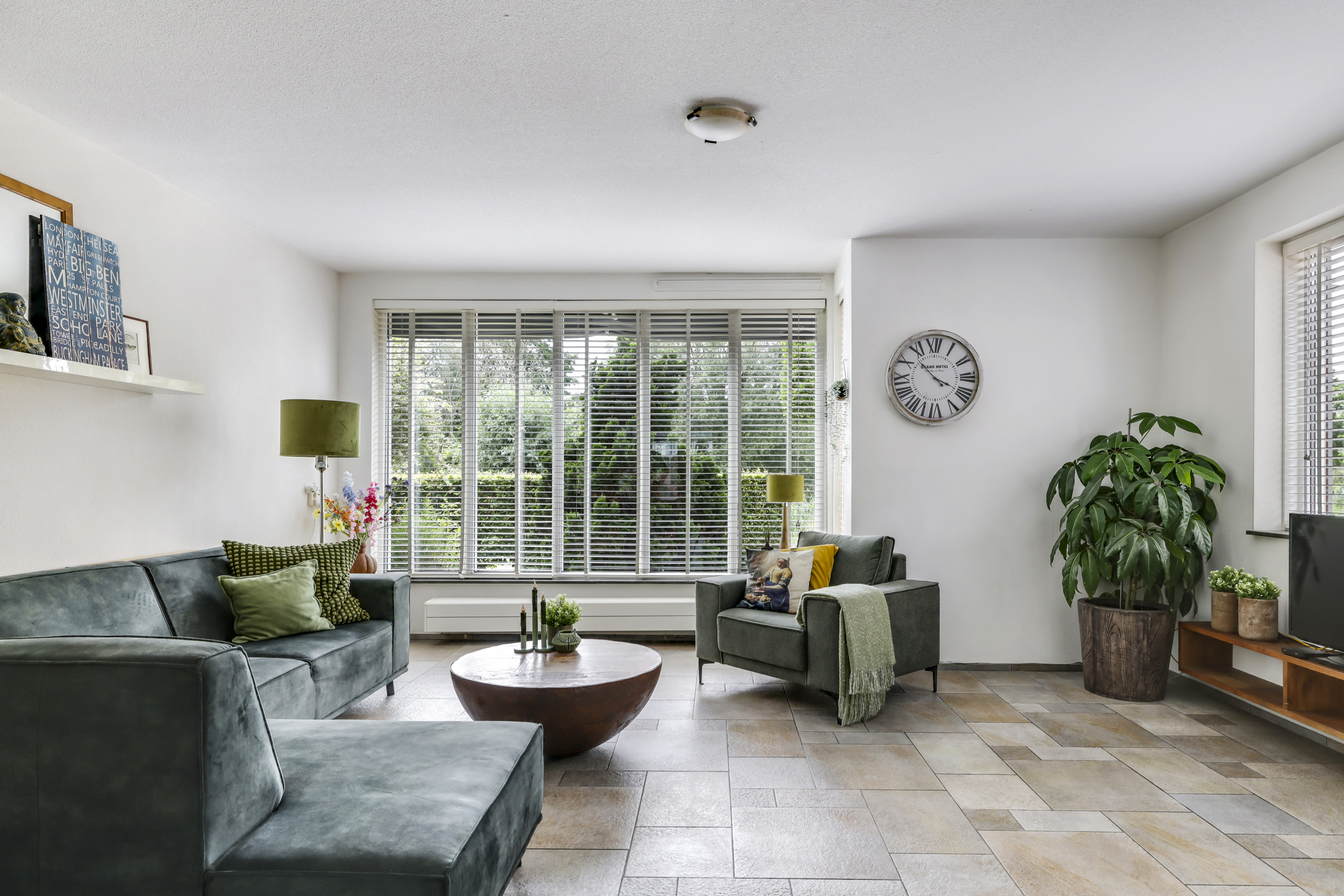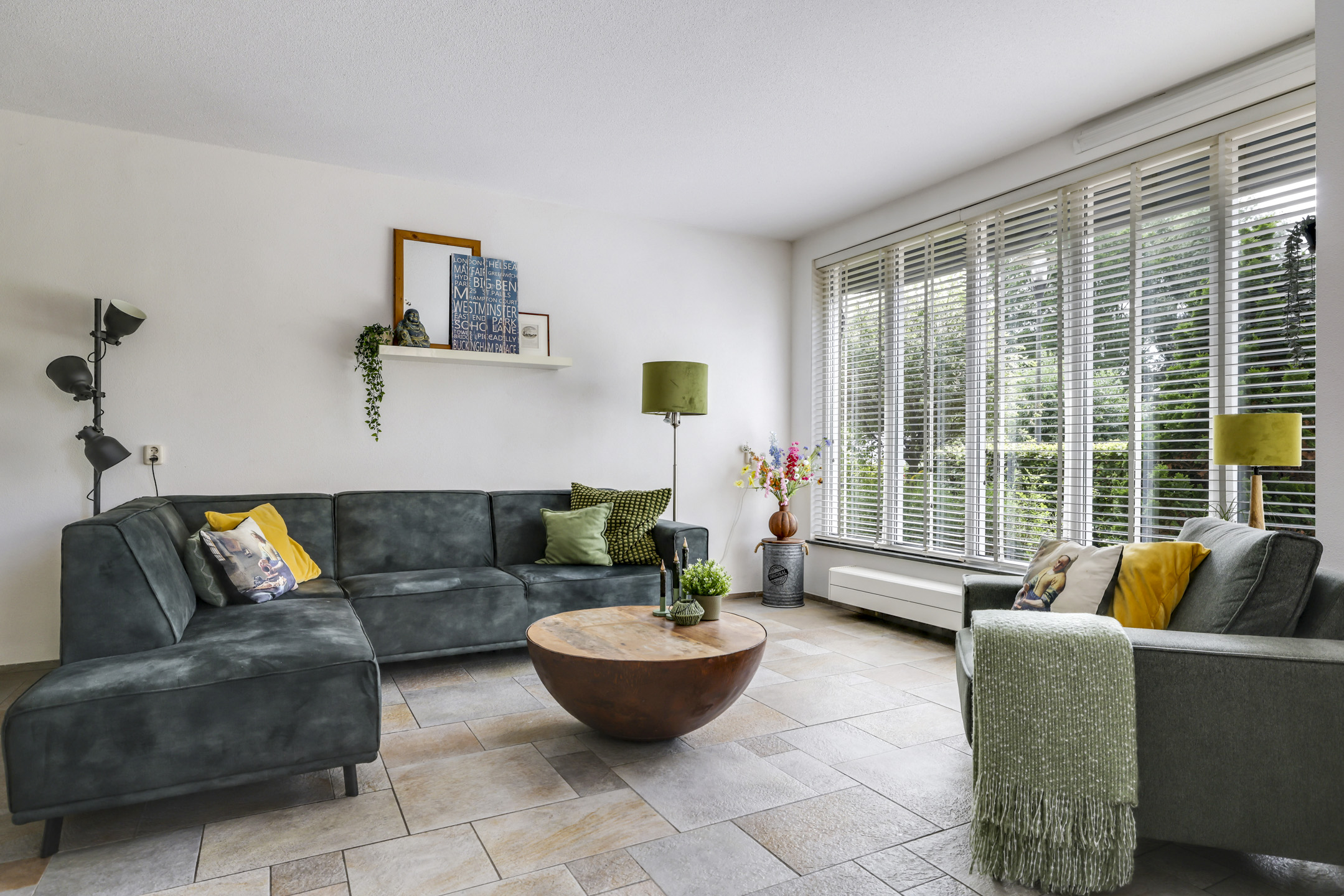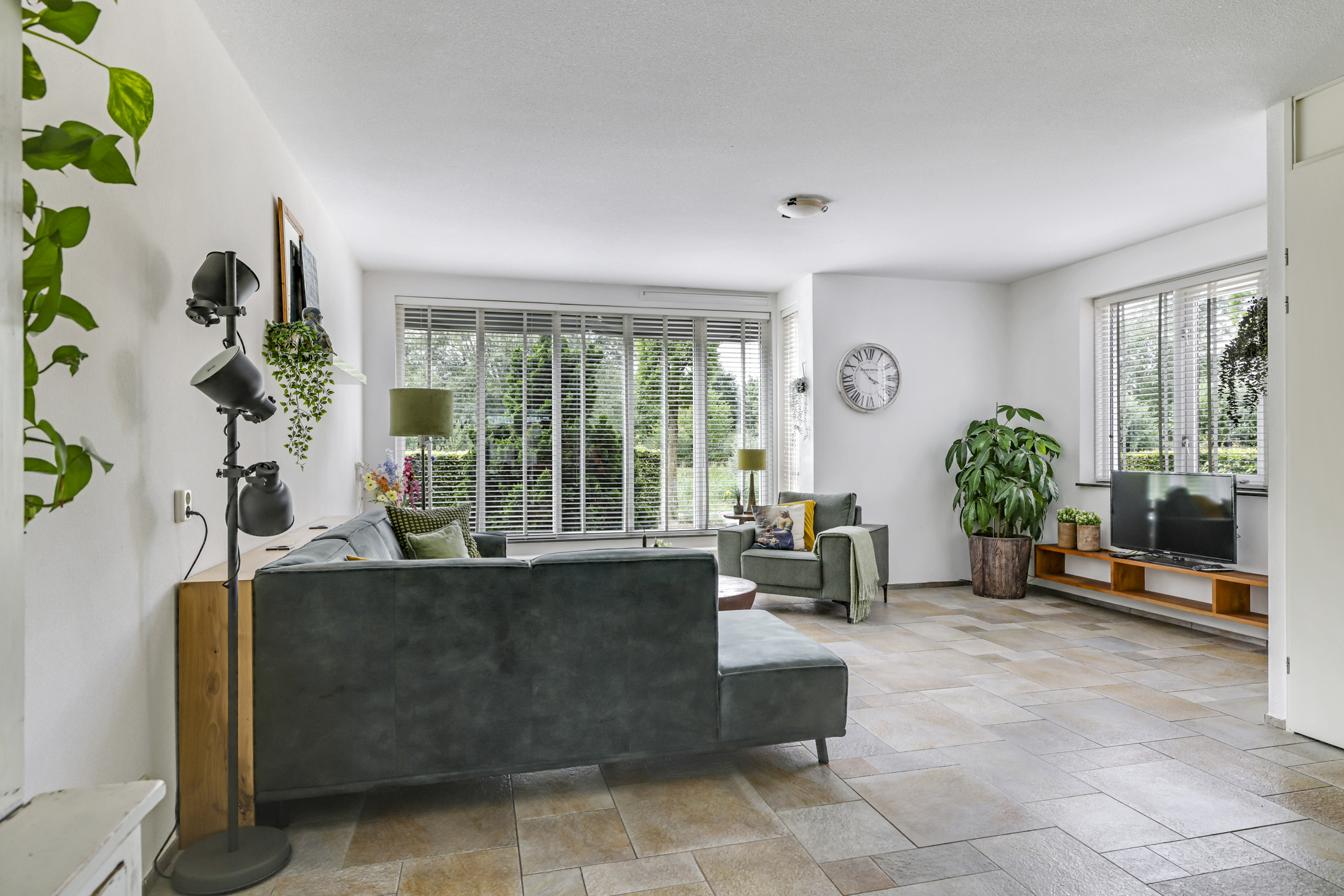 Woonkamer met erker, openslaande tuindeuren en trapkast