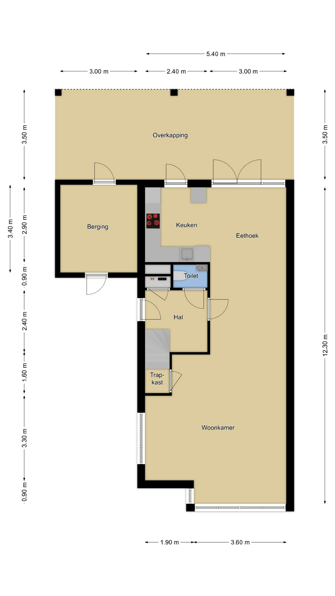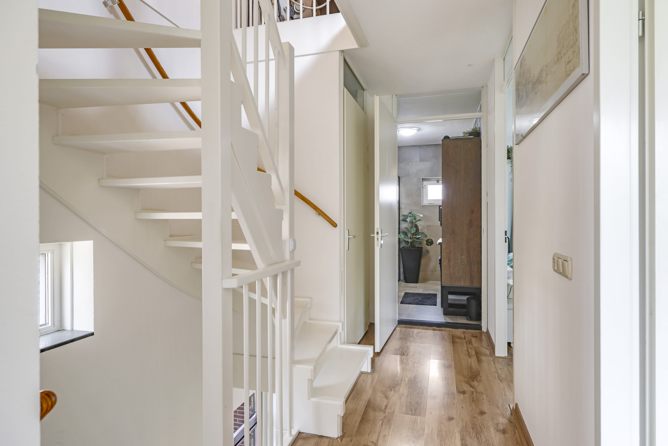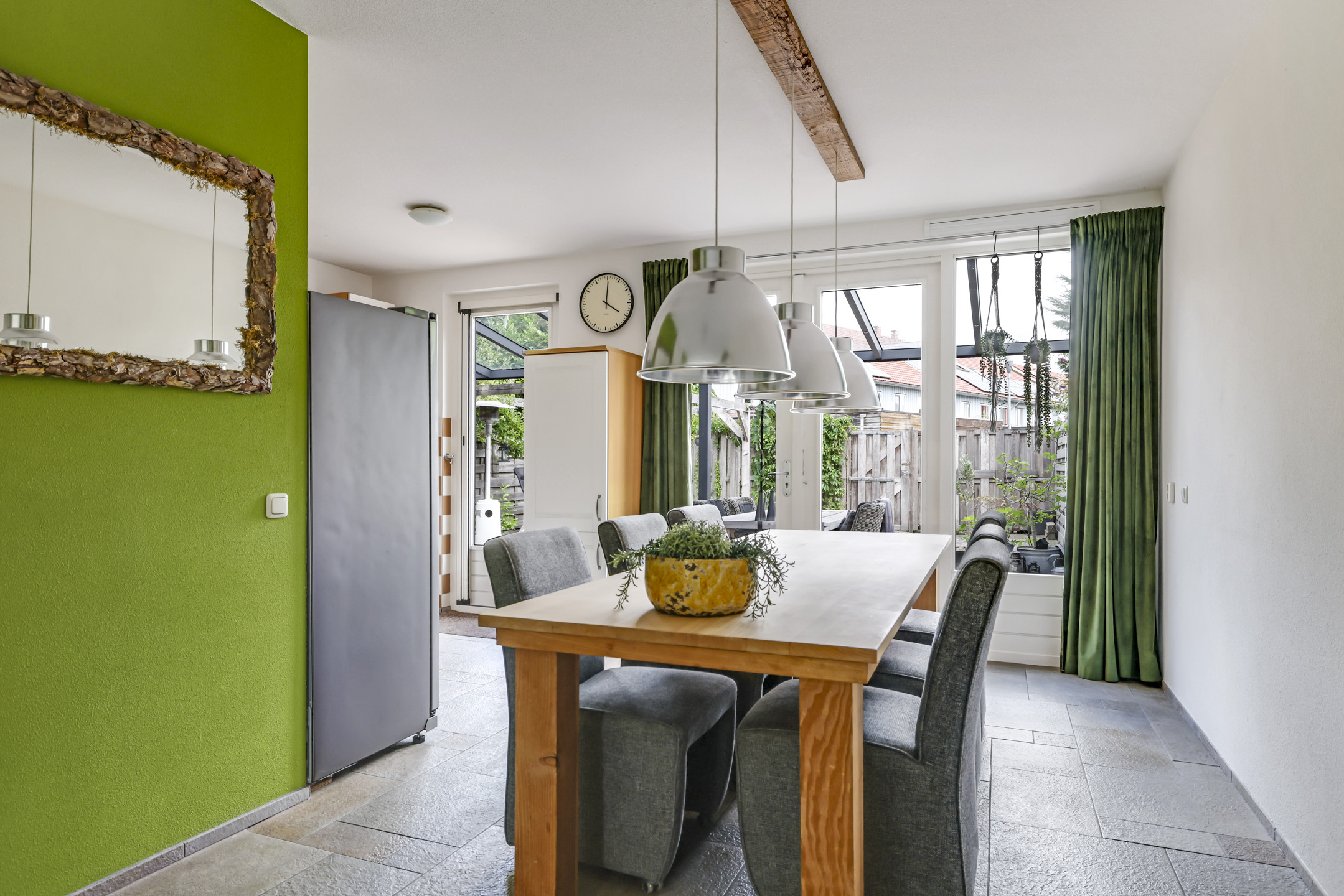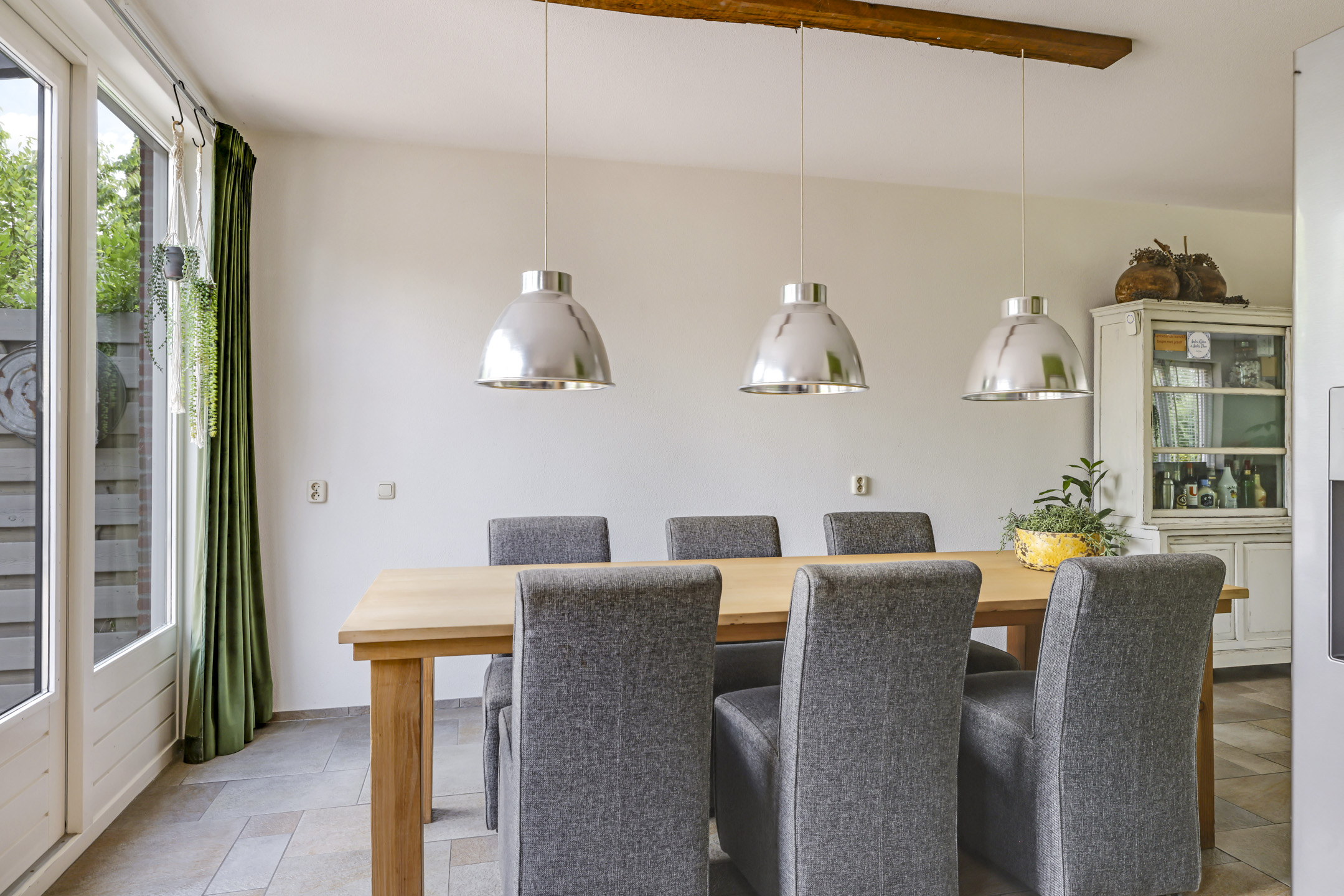 Wanneer je de woonkamer binnenkomt zal de ruim opgezette ruimte en de vele lichtinval je direct opvallen. Aan de voorzijde van de woning is een erker geplaatst wat zorgt voor een speels effect. Daarbij zorgt de erker ook voor een prachtig zicht op het voorgelegen park met waterpartij. Doordat de ruimte goed is bemeten kan je hier lekker grote meubels kwijt. In de hoek van de woonkamer is een trapkast aanwezig voor de nodige opbergruimte. Aan de achterzijde zorgen openslaande tuindeuren ervoor dat je in de zomerdag de woonkamer en de tuin bij elkaar kan betrekken.